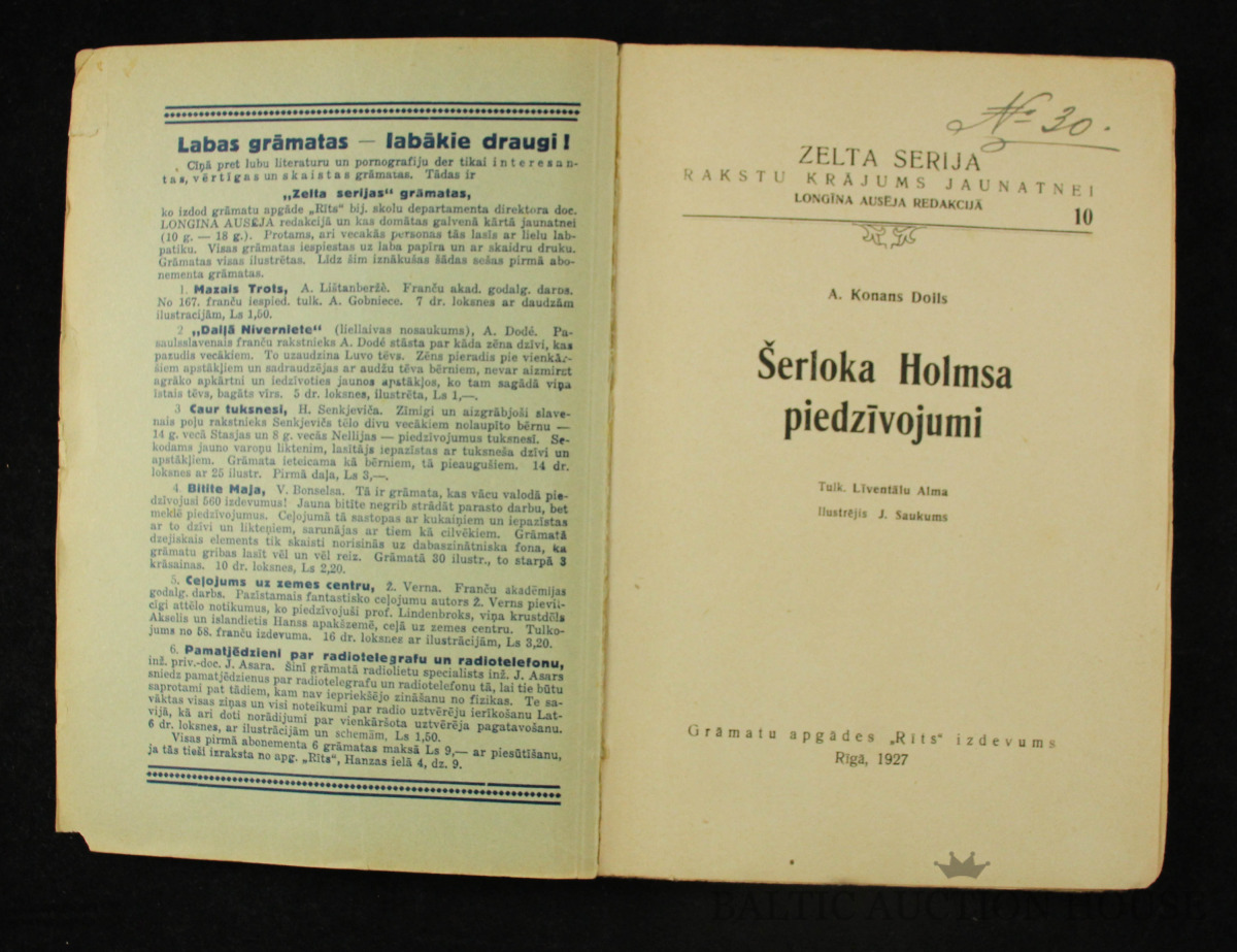 ŠERLOKA HOLMSA PIEDZĪVOJUMI. A.Konans Doils. Apgāds Rīts, 1927.g.