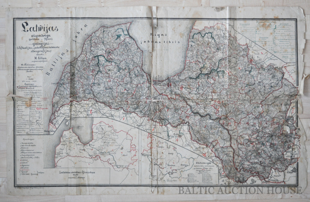 Unikāla 1891 gada Latvijas karte ar latviešu valodas izlokšņu un Vitebskas guberņas latviešu koloniju kartēm. M. Siliņa zīmējums. A. Štāļa litogrāfija, Rīga. 45x75 cm. Nepieciešama profesionālā restaurācija.