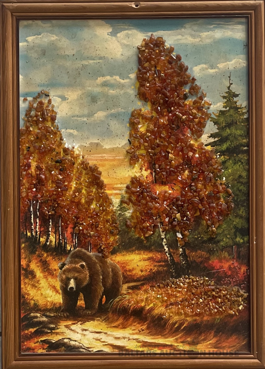 Glezna "Lācis mežmalā" ar dzintara elementiem, kartons, foto, dzintars, 30x21 cm