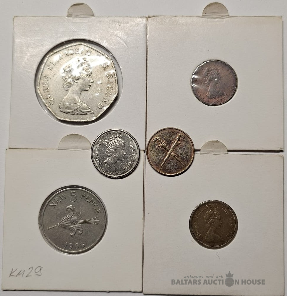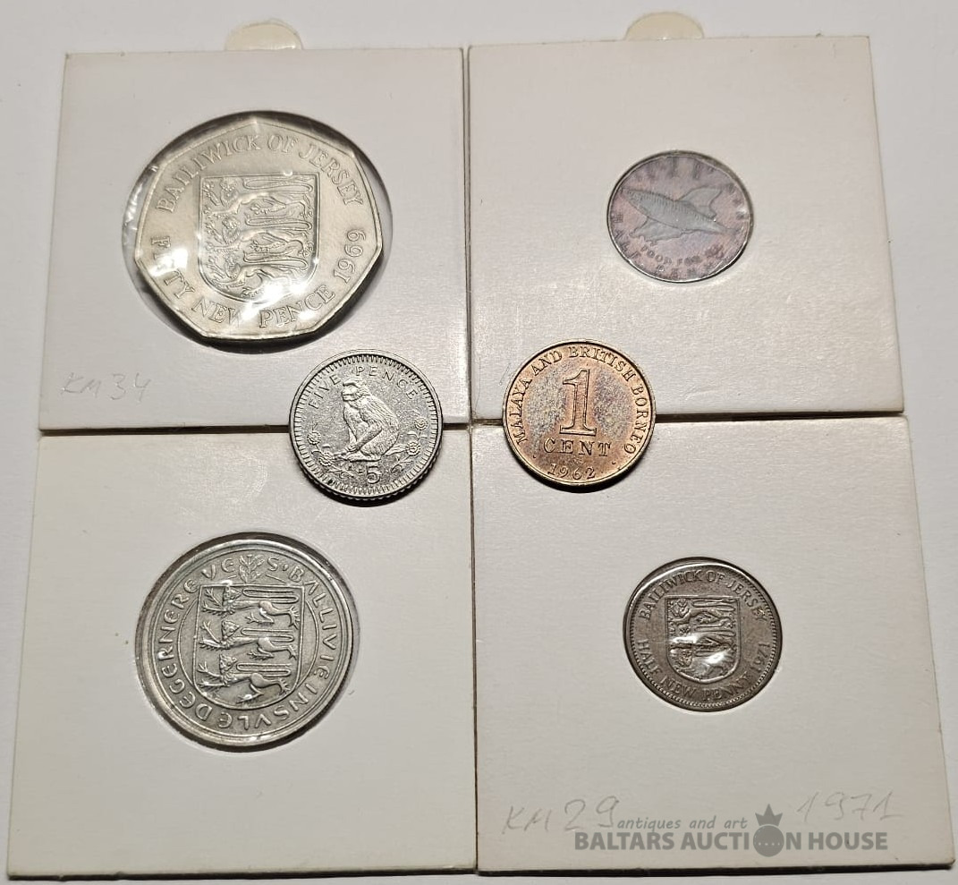 6 skaistas monētas: Džērsija (Jersey) un Isle of MAN, Balviks, Malaya, British Borneo un Gibraltara