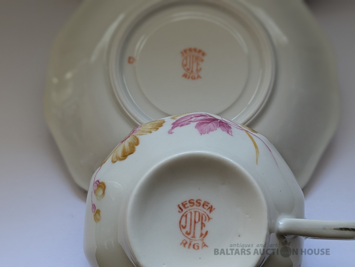Tase ar apakštasi un kūku šķīvis no servizes Rubenss, ražots Jessen porcelāna fabrikā 30-jos gados. Plāns, balts porcelāns, ir lietojuma pazīmes zeltam, apakštasei, no apakšas, mikroskopisks glazuras atsitums