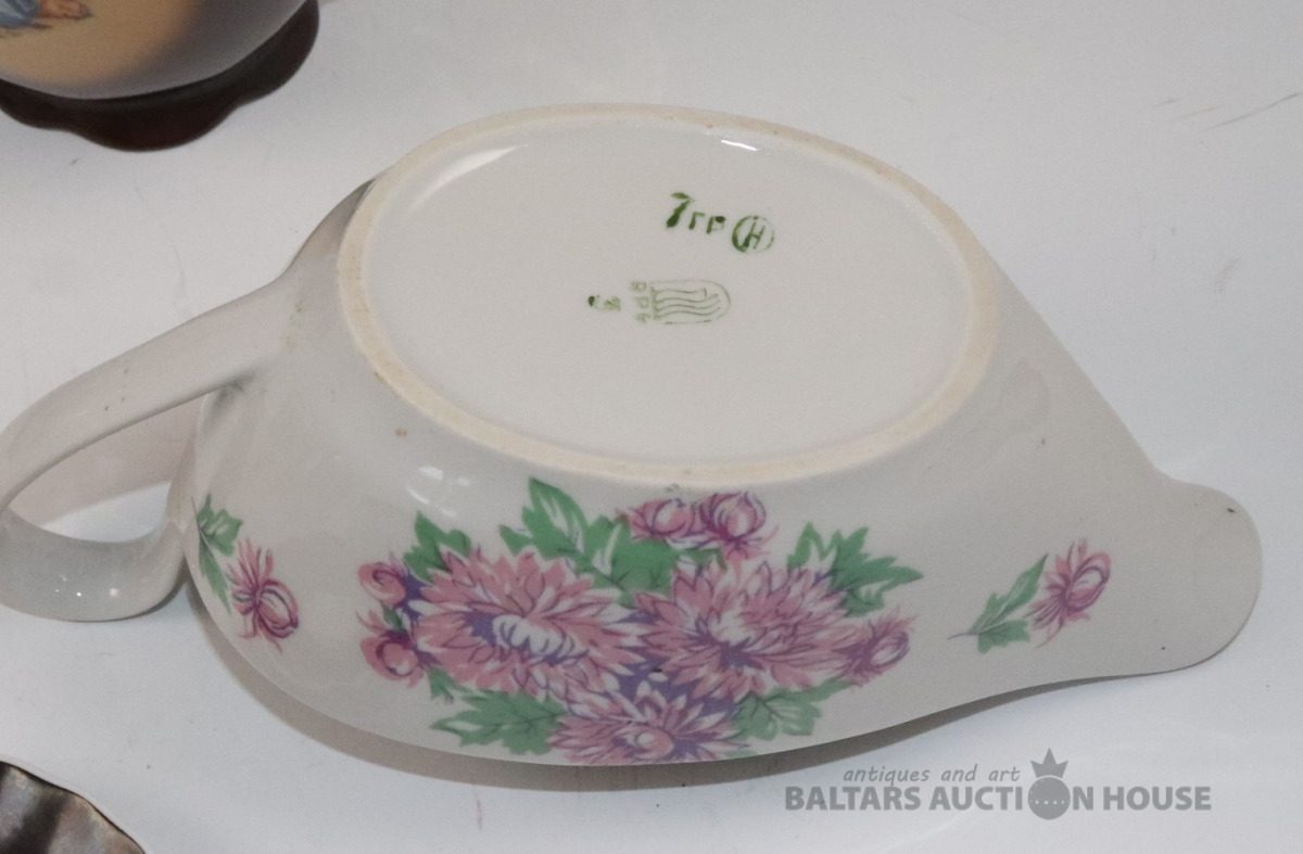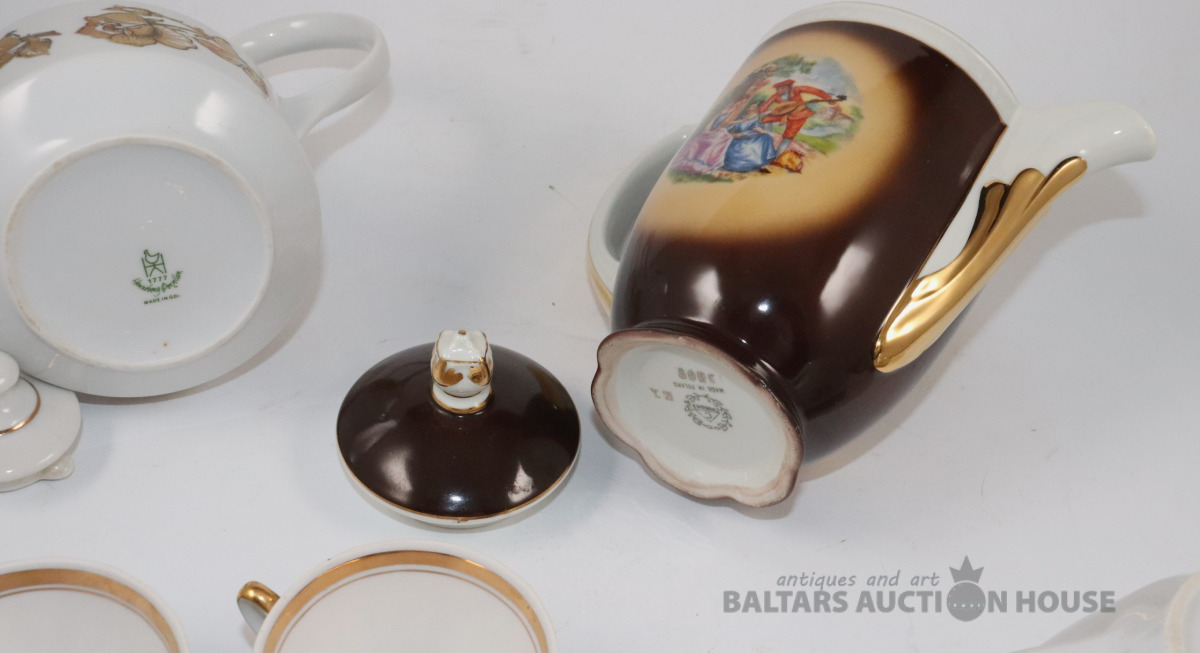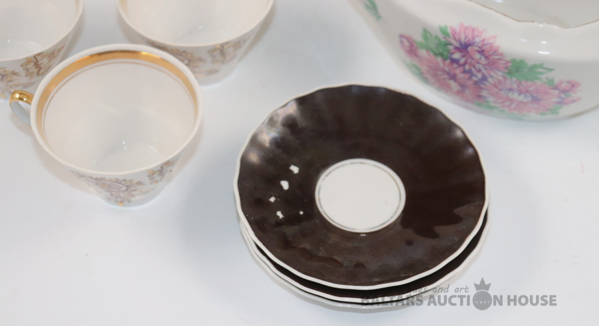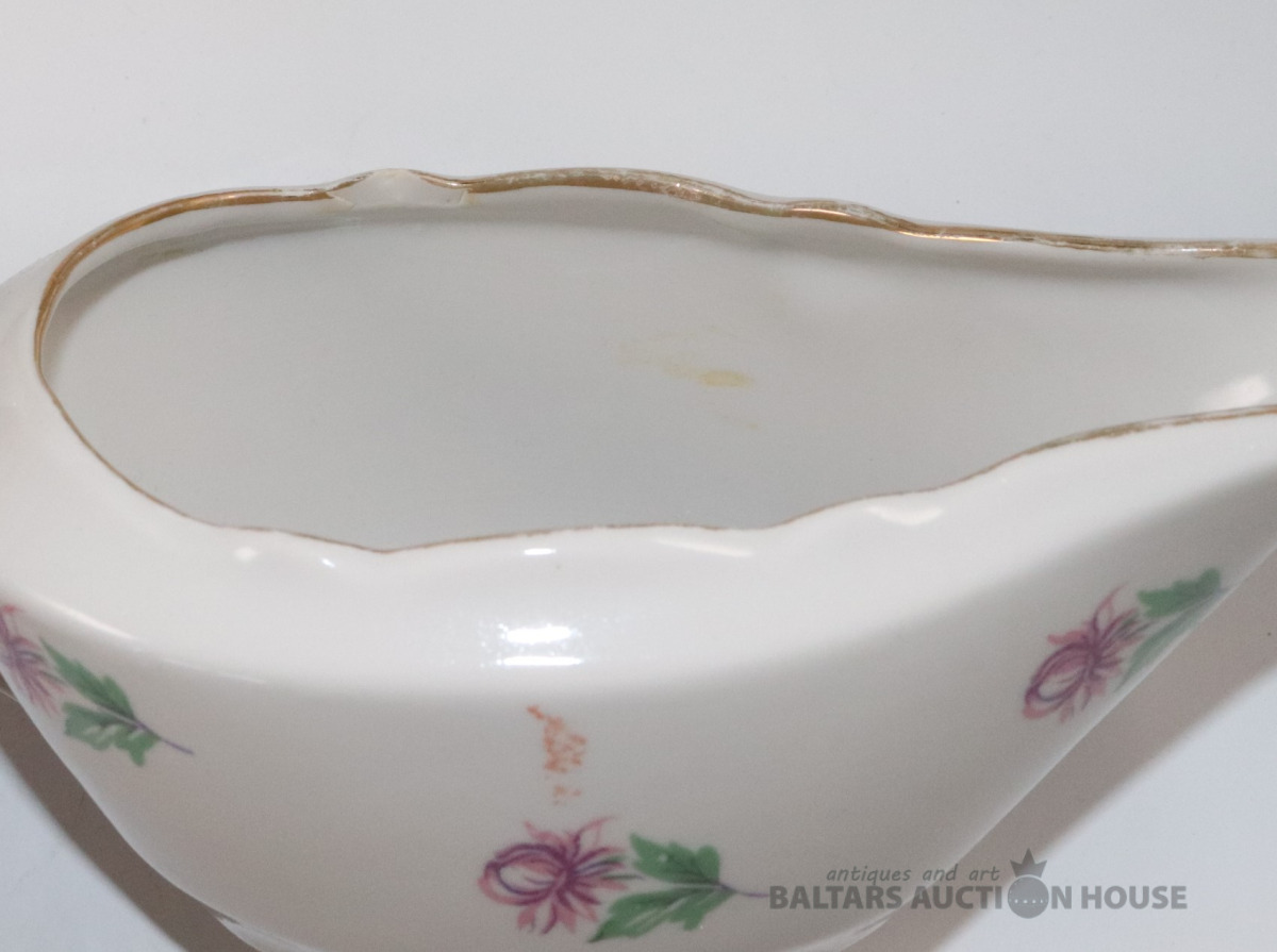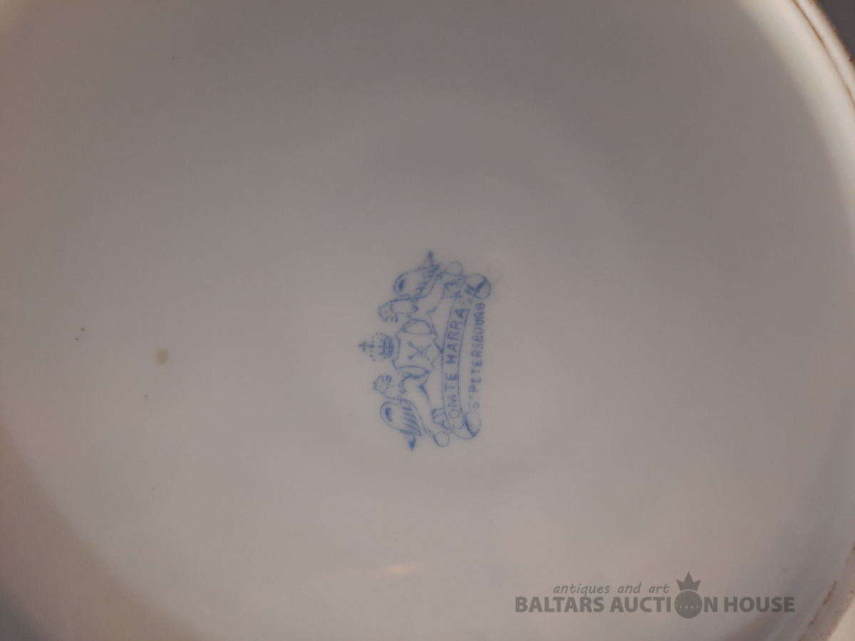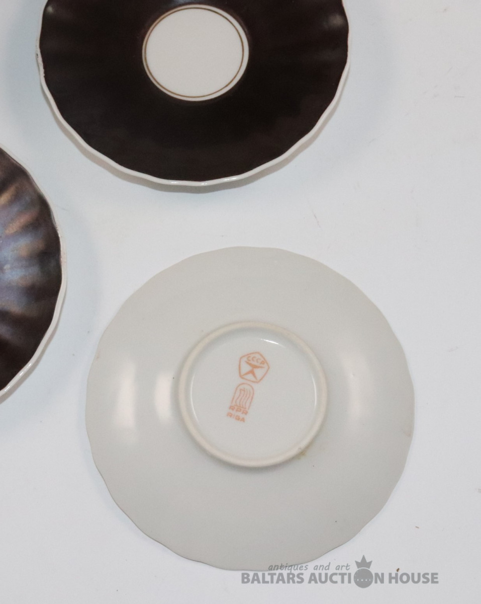 Porcelāna priekšmeti 10 gab. Mērces traukam nošķēlums, vienai apakštasei krāsas nodilumi.