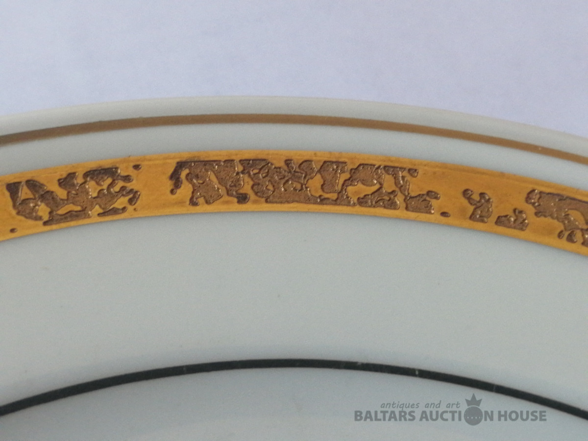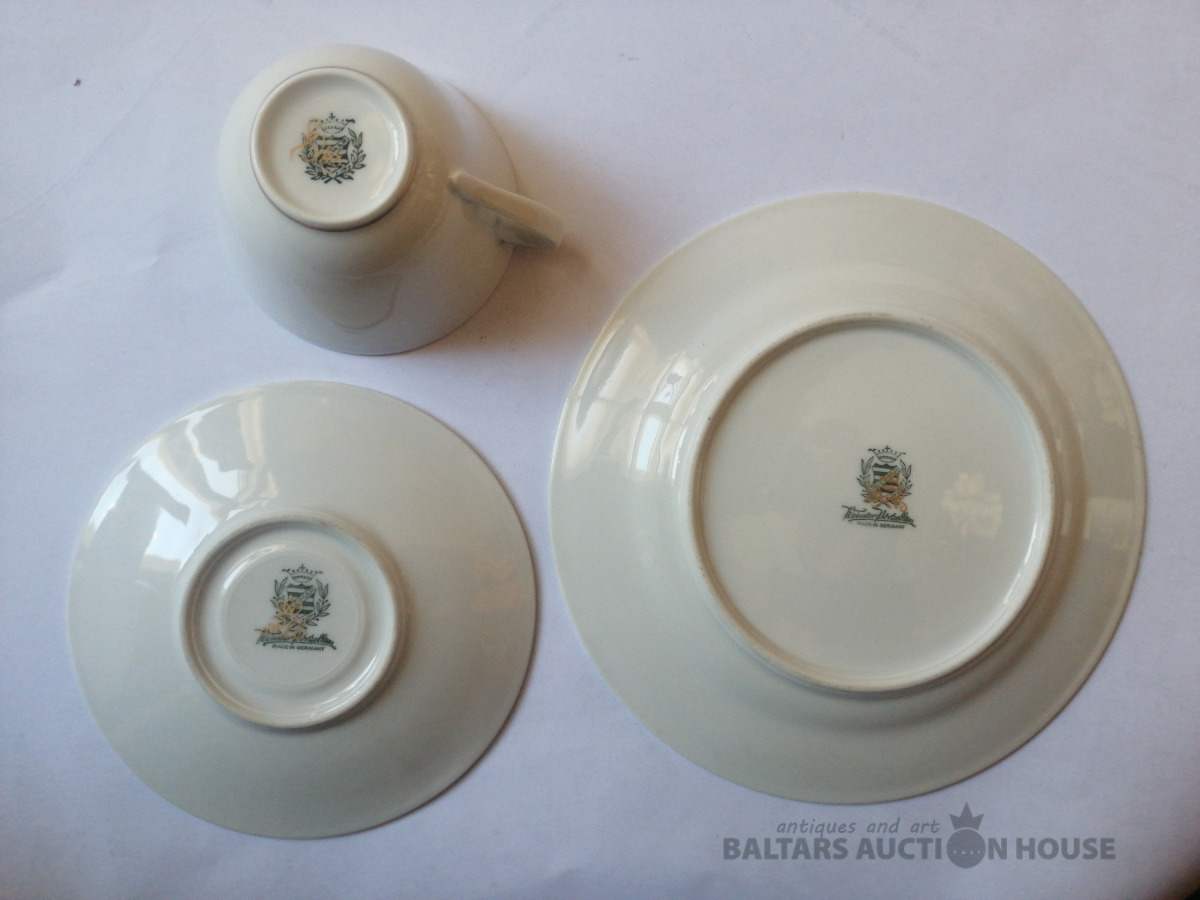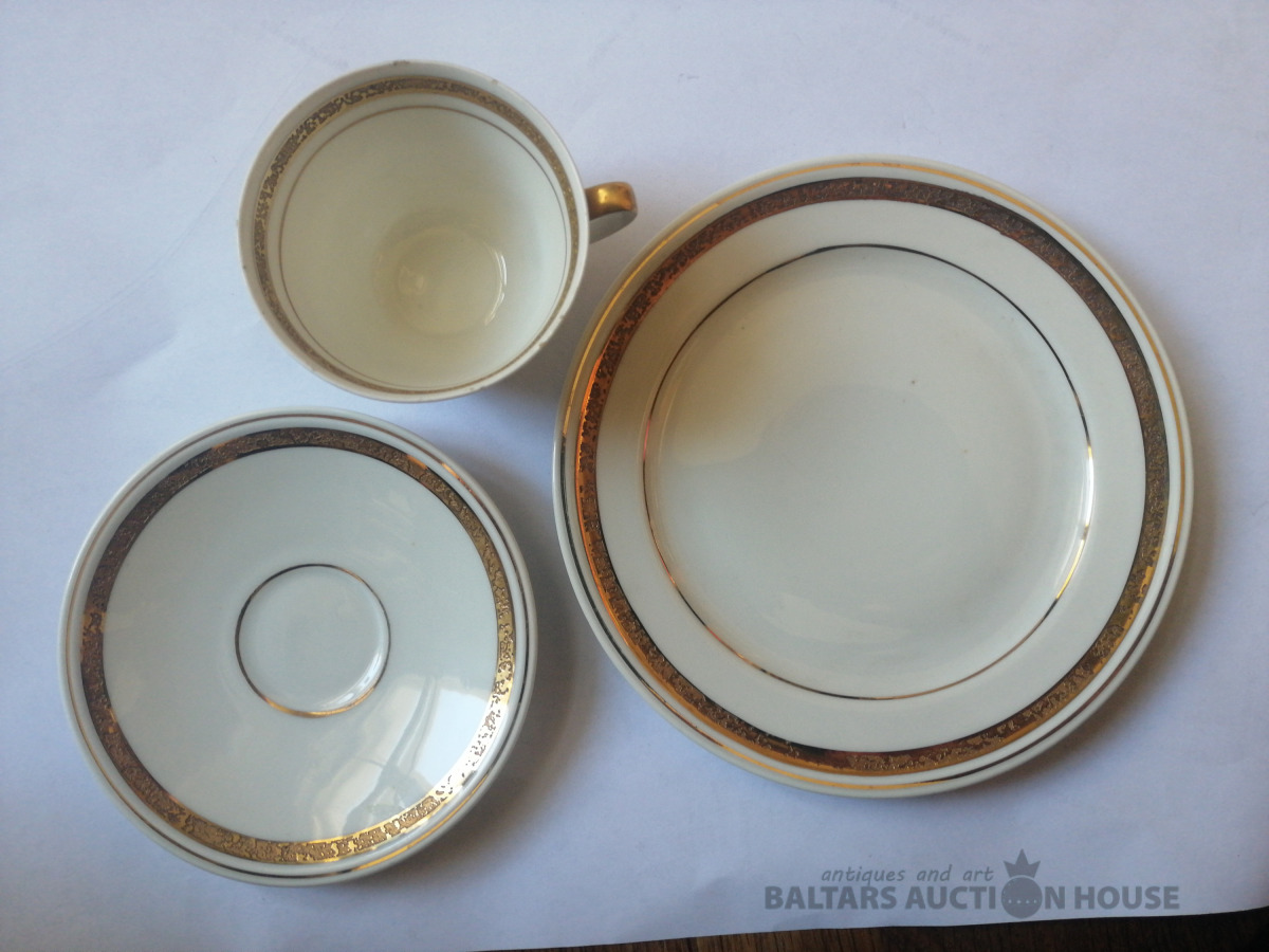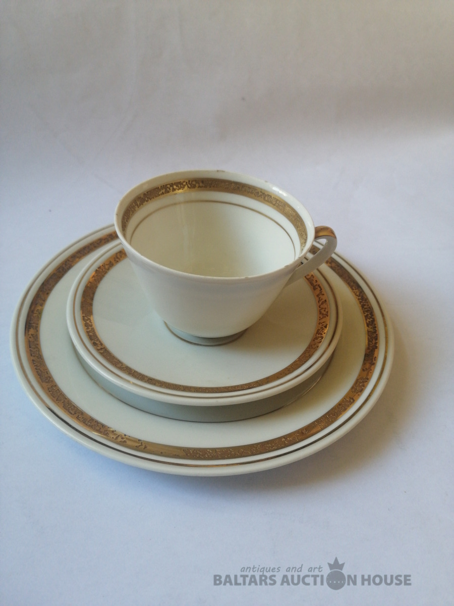 Kafijas trio, porcelāns, zeltījums, Vācijā, šķīvīšu diametrs attiecīgi 16 cm un 11,5 cm; tasītes augstums 5 cm,
