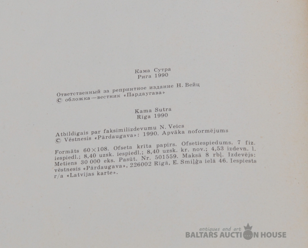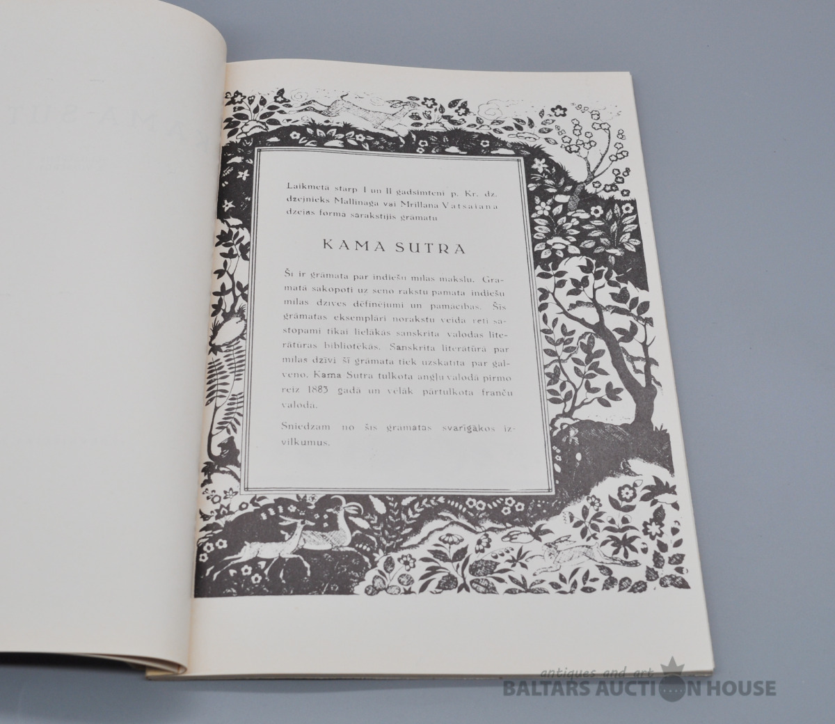 Kama Sutra. S. Vidberga ilustrācijas. Reprinta izdevums 1990. Supervāks ar netīrumu pēdām. 75 lpp.