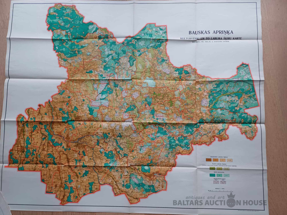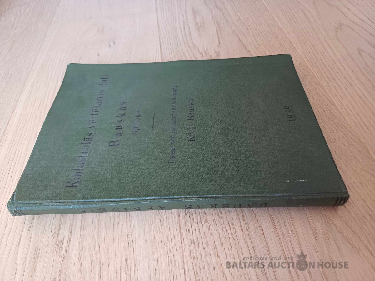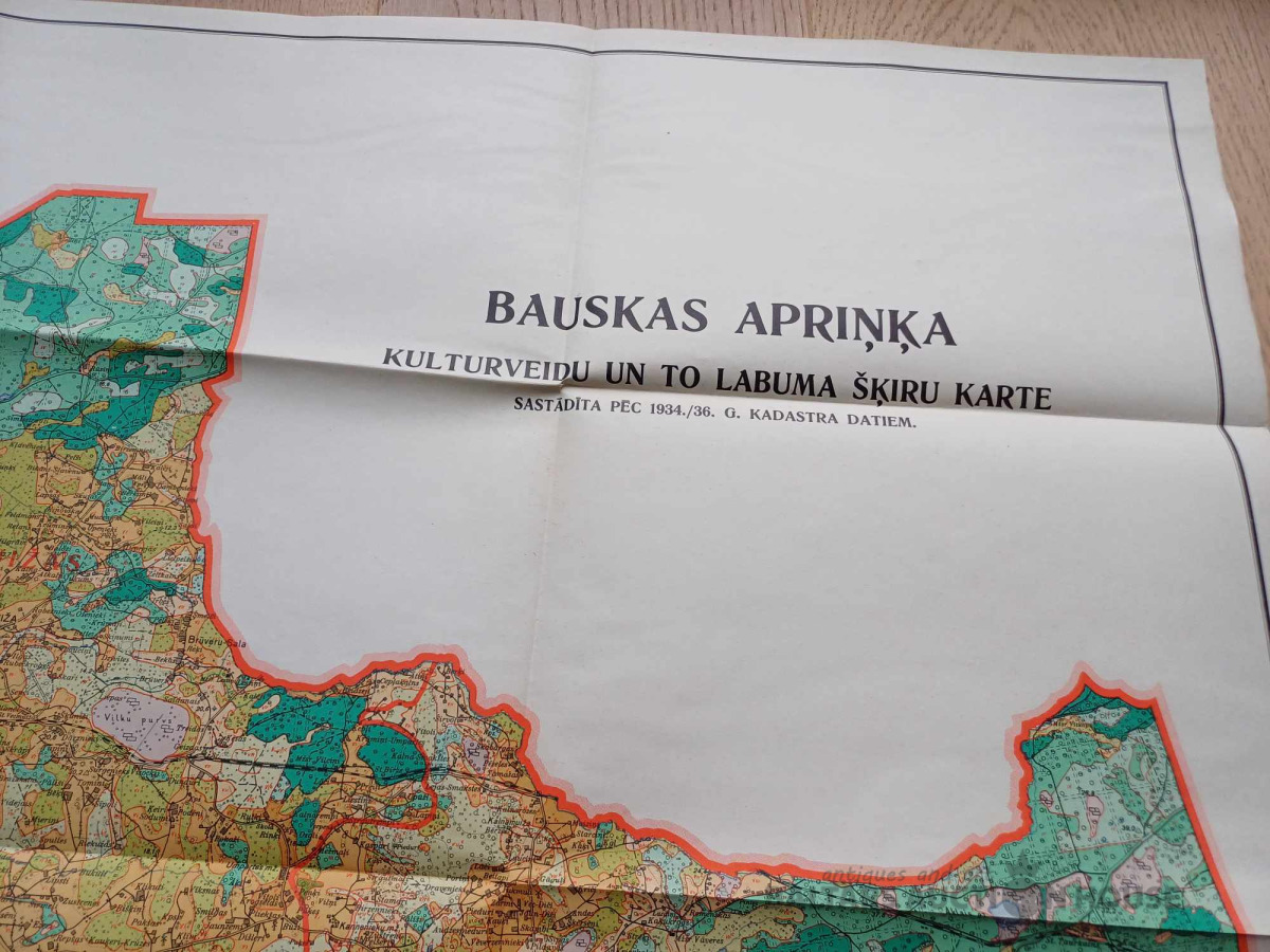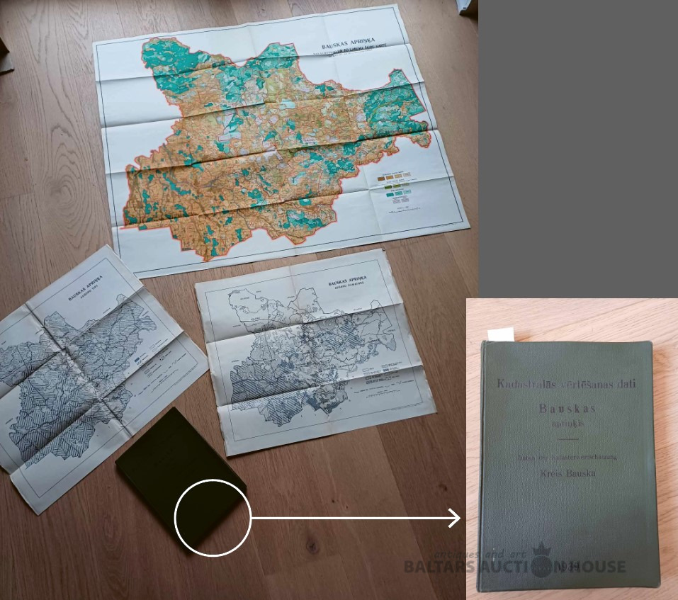 Kadastrālās vērtēšanas dati Bauskas apriņķī (1939). Grāmata ar 3 pielikuma kartēm. Lielās kartes izmērs 980x820. Karte labā stāvoklī. Stāvokli un ilustratīvu priekšstatu skatīt attēlos. Karte iespiesta Valstspapīru spiestuvē.
