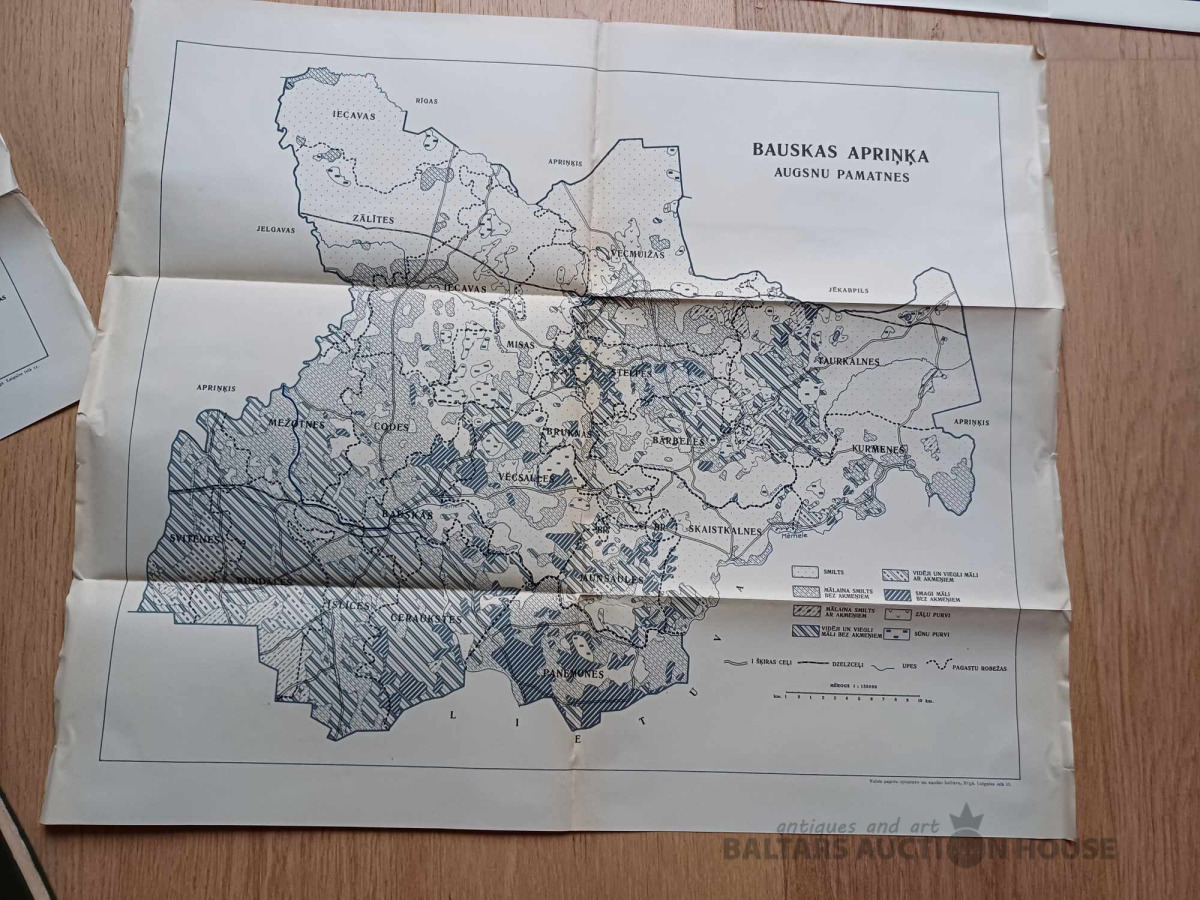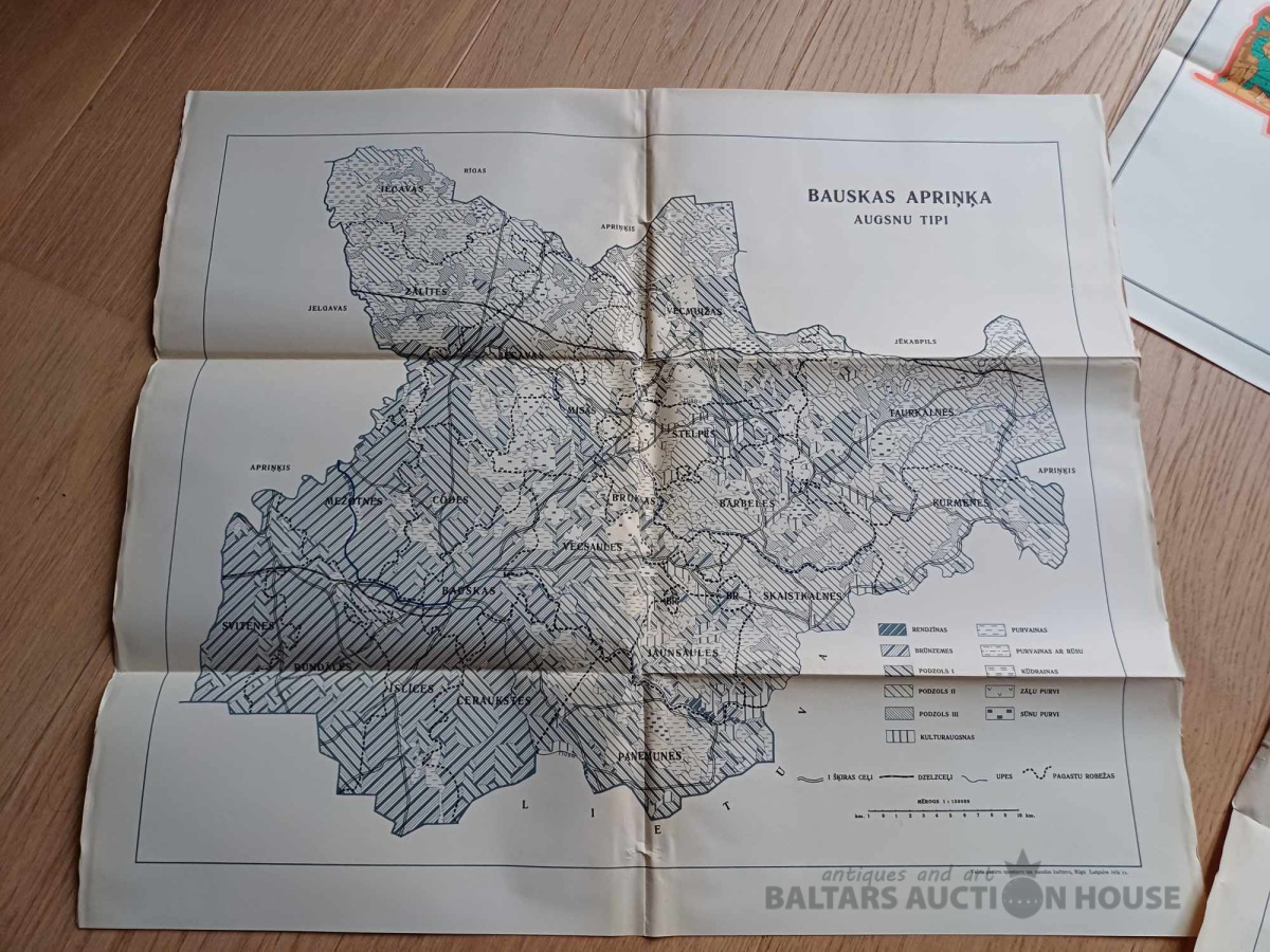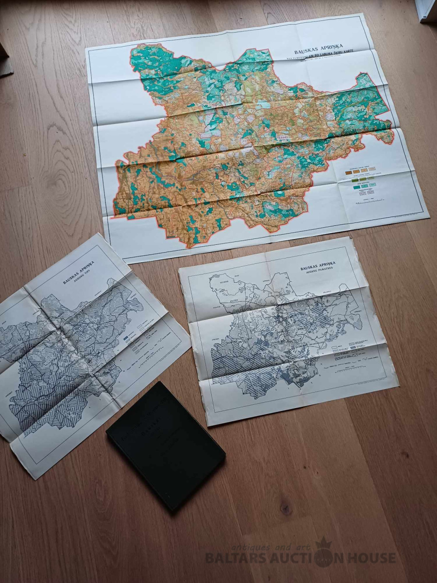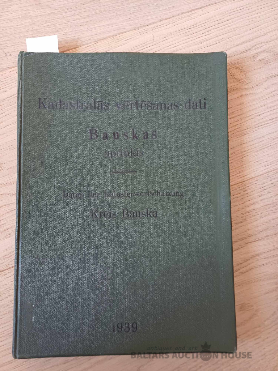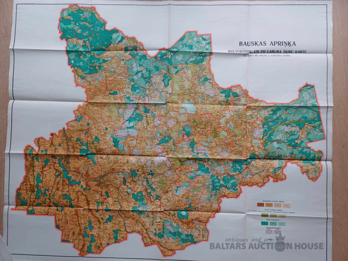 Kadastrālās vērtēšanas dati Bauskas apriņķī (1939). Grāmata ar 3 pielikuma kartēm. Lielās kartes izmērs 980x820. Karte labā stāvoklī. Stāvokli un ilustratīvu priekšstatu skatīt attēlos. Karte iespiesta Valstspapīru spiestuvē.