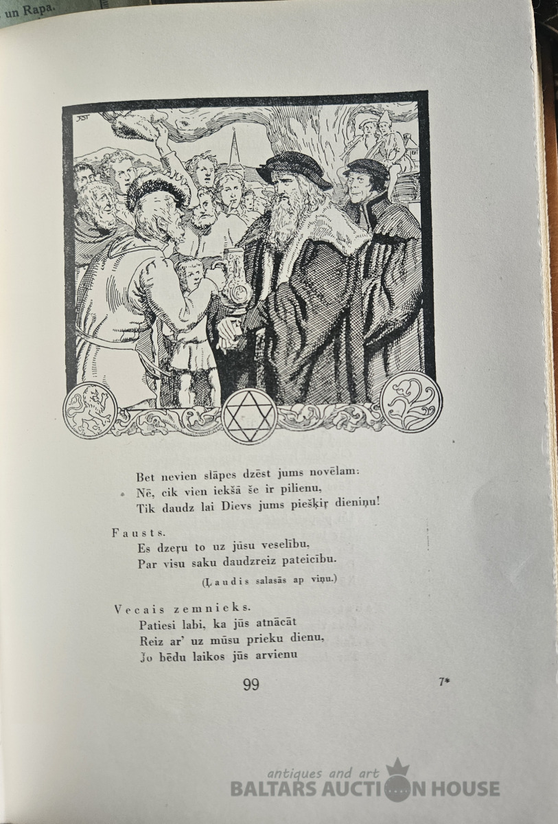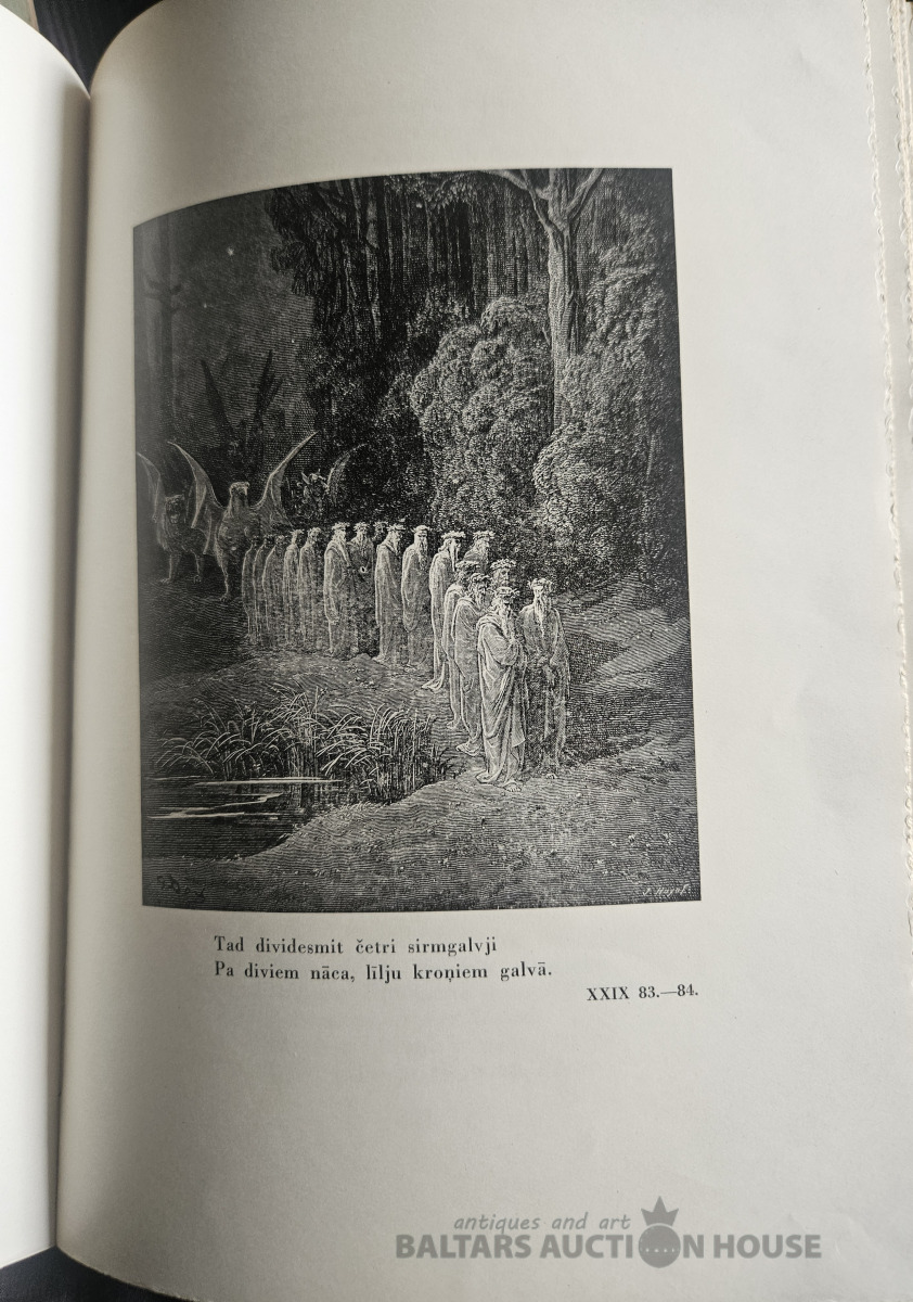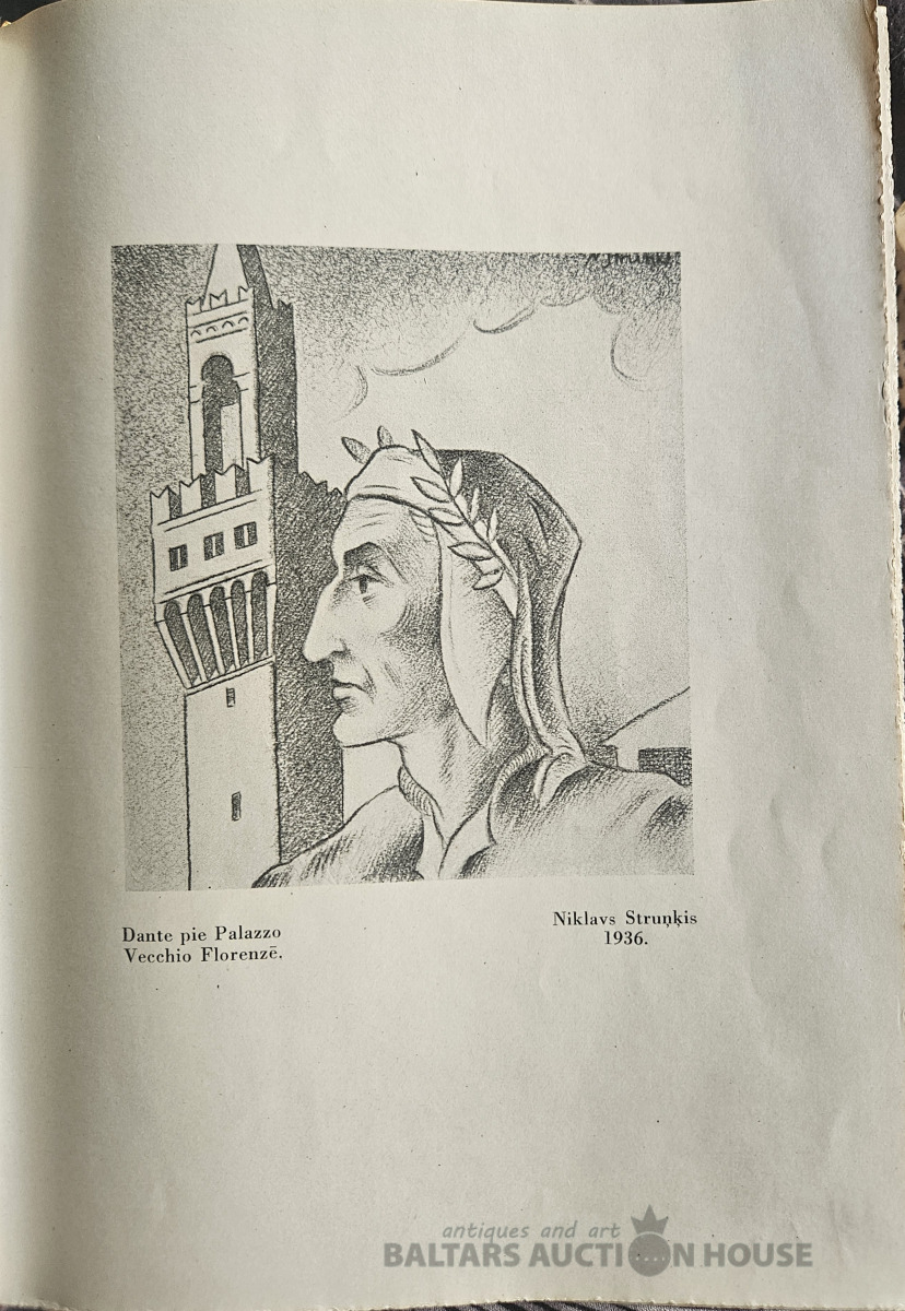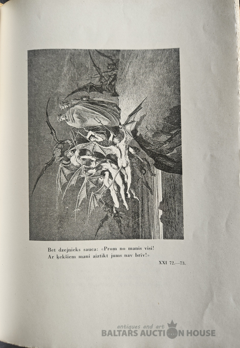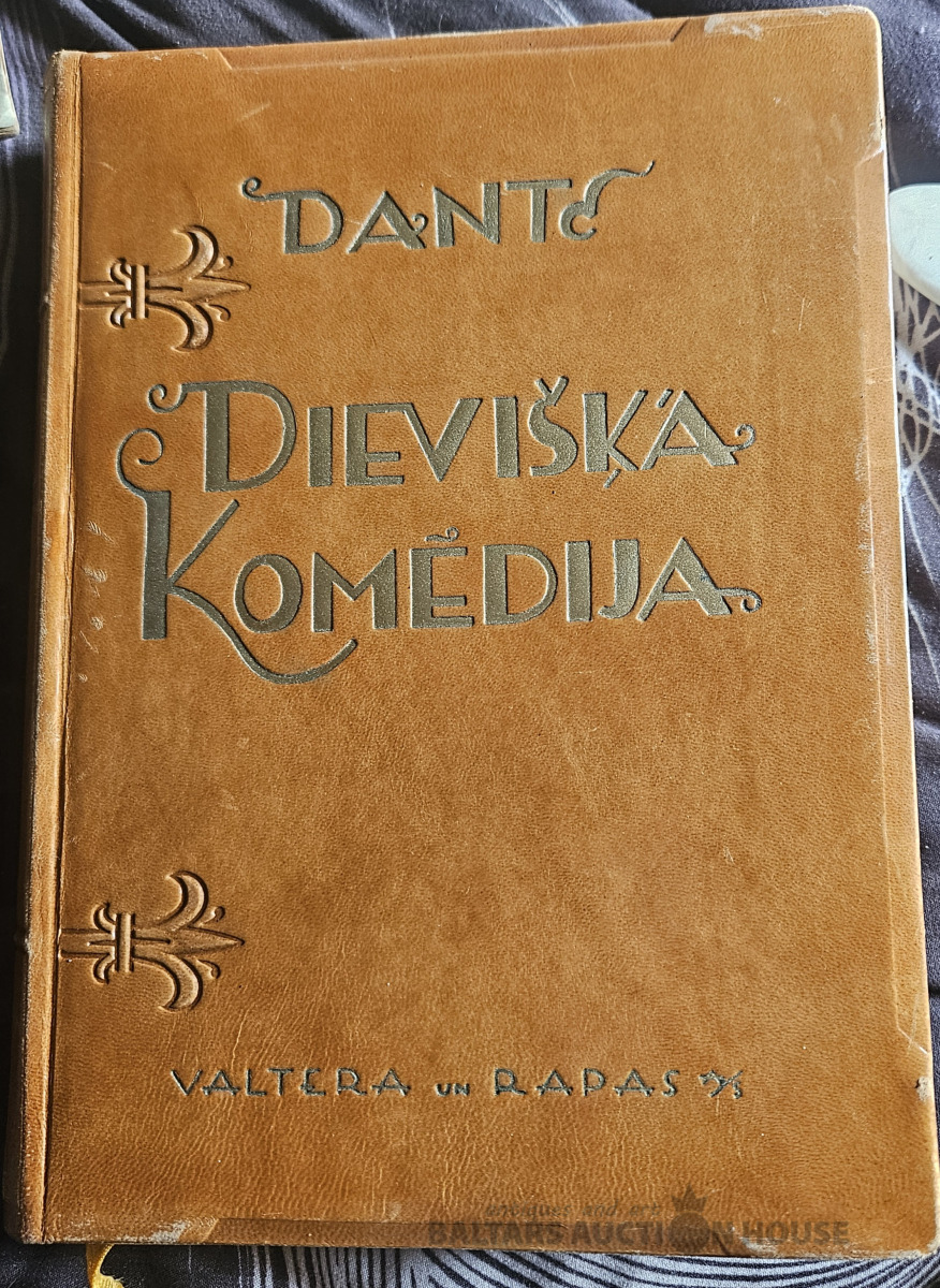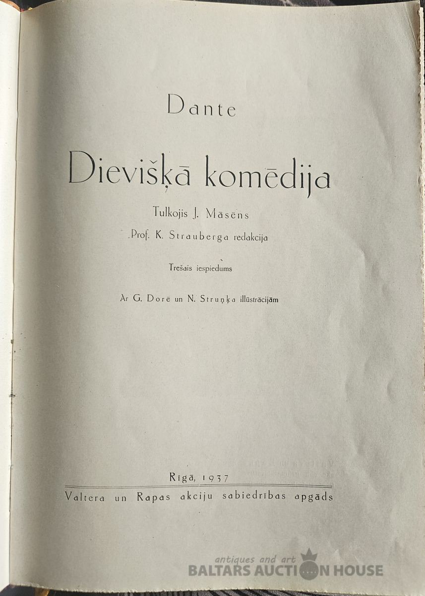 Dante " Dievišķā komēdija " Tulkojis J.Māsens.Prof.K.Strauberga priekšvārds. Gustava Dorē un Niklāva Strunķa ilustrācijām. 1937 gads. Oriģinālajā izdevniecības Valters un Rapa pilnas ādas iesējumā.