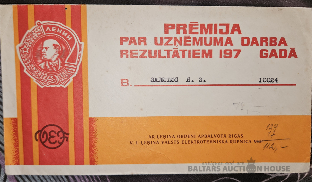 Vef .Prēmijas aploksne par uzņēmuma darba rezultātiem 197... gadā.