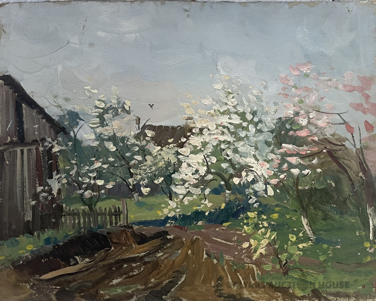Stepans Skakuns 1921.1985. "Ziedošas ābeles", k.e., 54,5x67,5 cm.