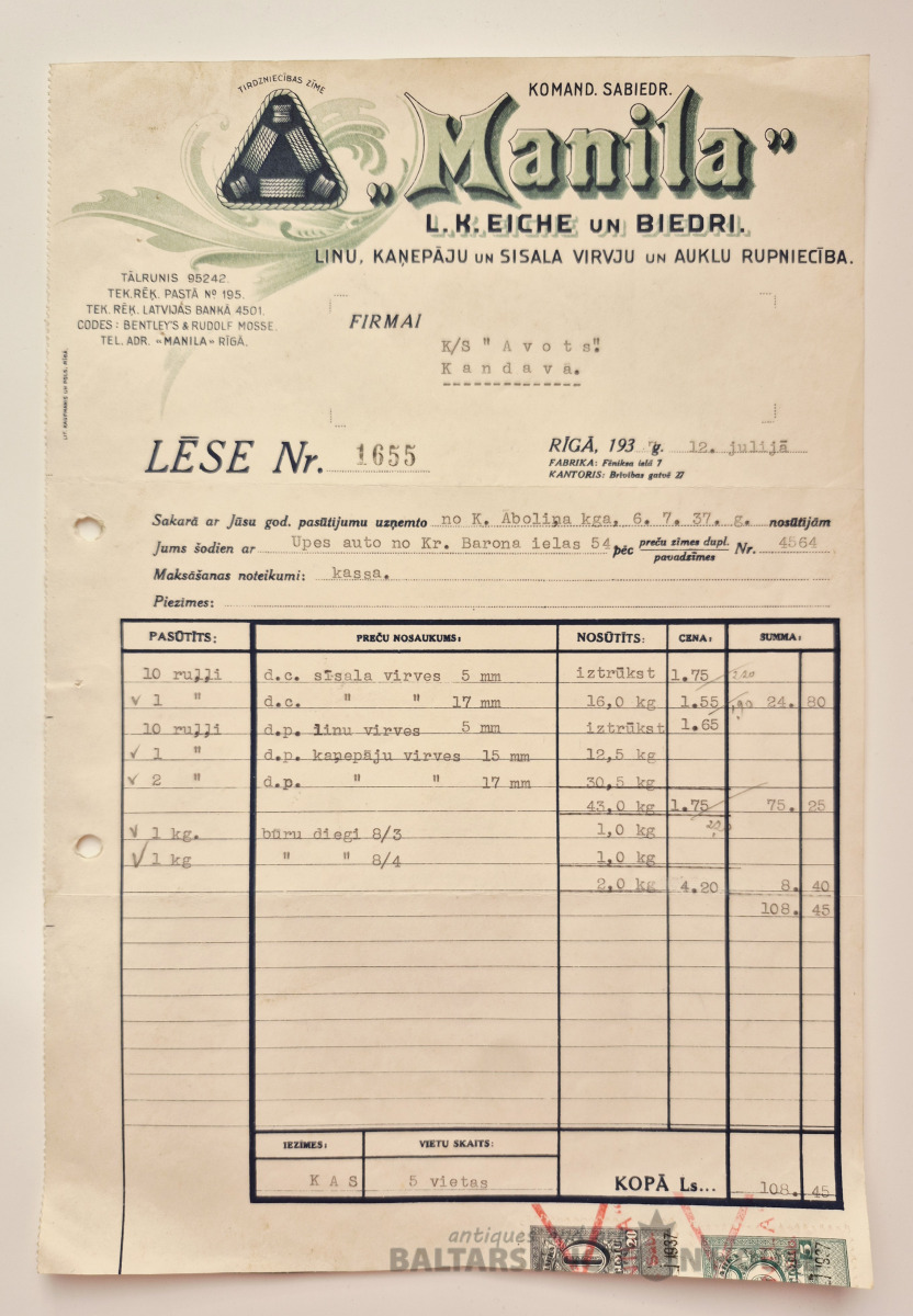Lēse. Linu, kaņepāju un sisala virvju un auklu rūpniecība "Manila", 1937g.