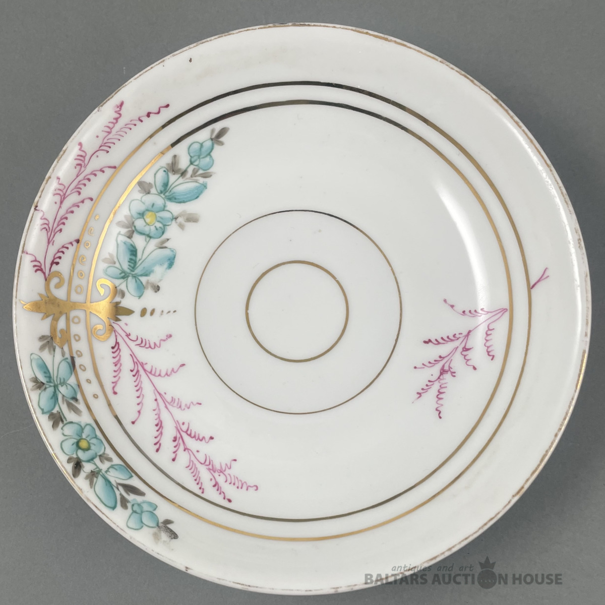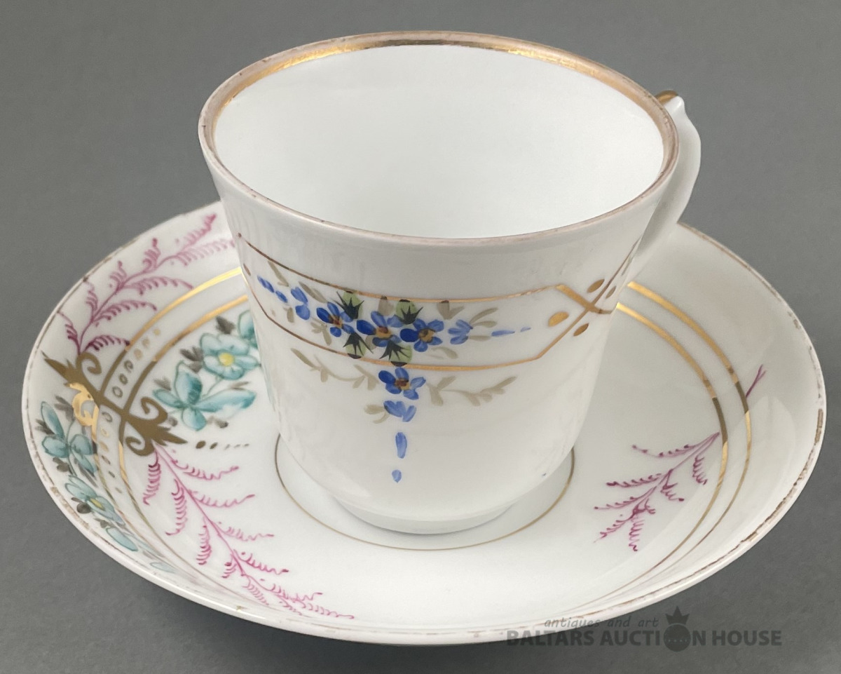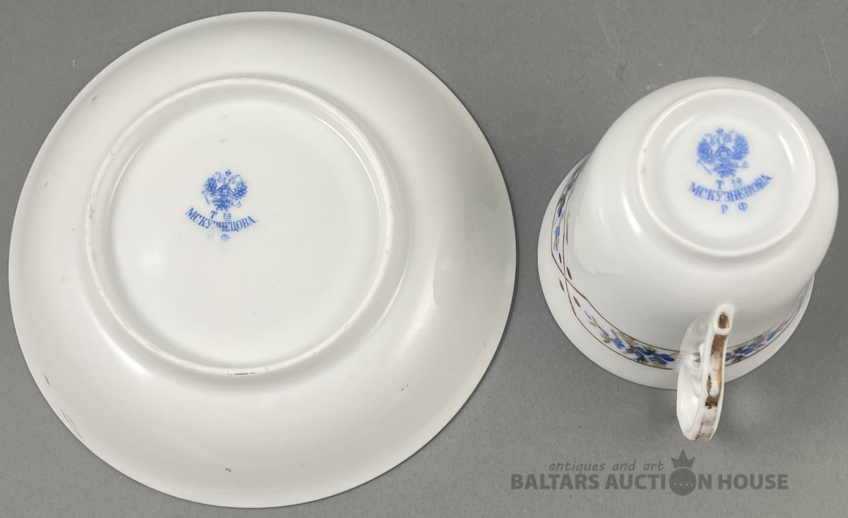 Kafijas pāris, porcelāns, krūzītei h=7,6 cm, šķīvītim d=15,5 cm, KUZŅECOVA fabrika, ražots līdz 1915.gadam. Rokas zīmējums, zeltījums labi saglabājies
