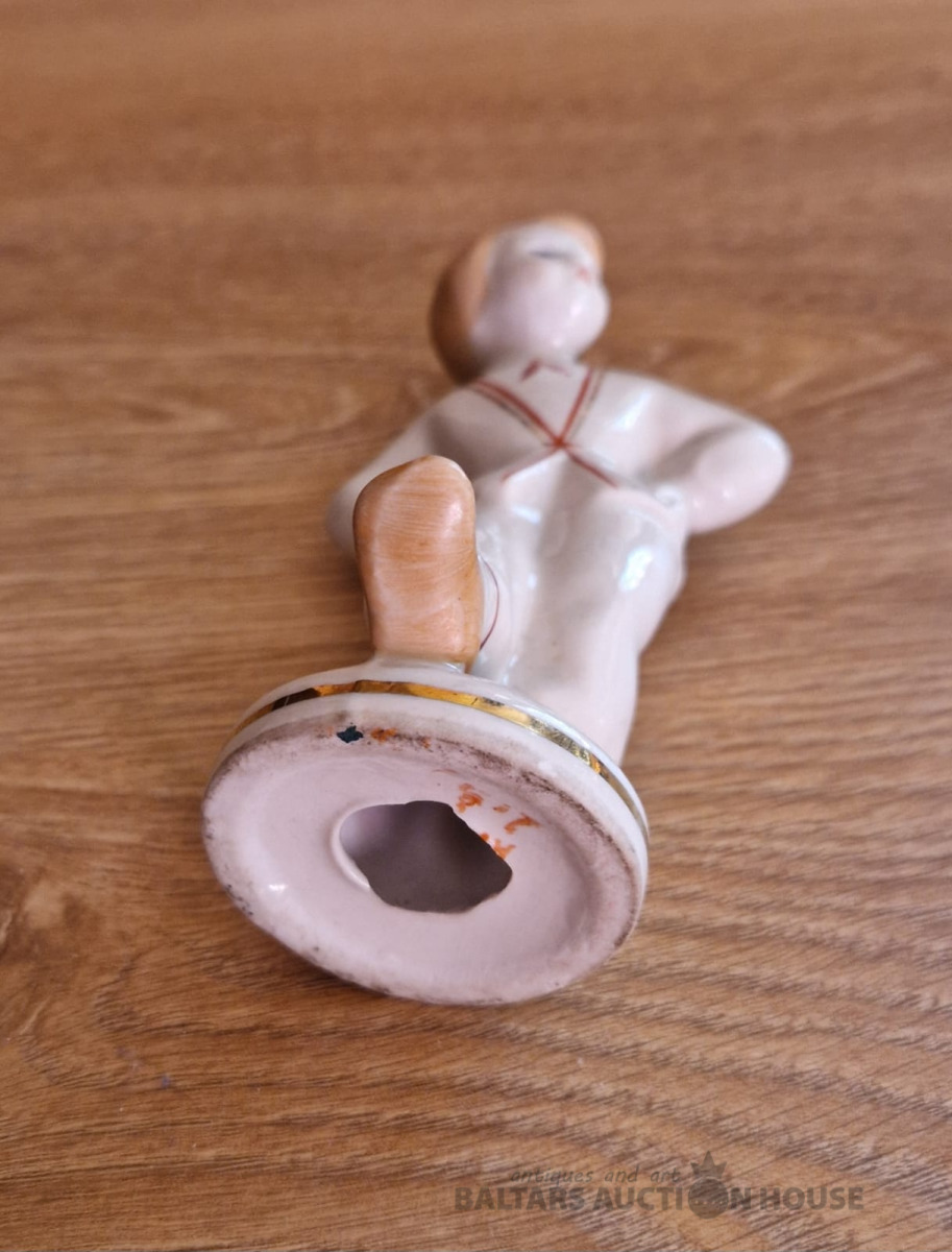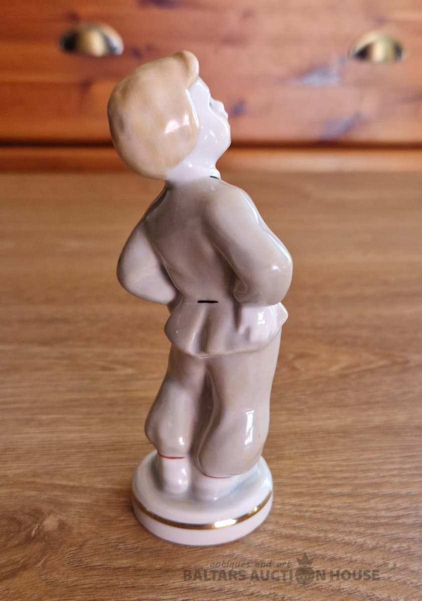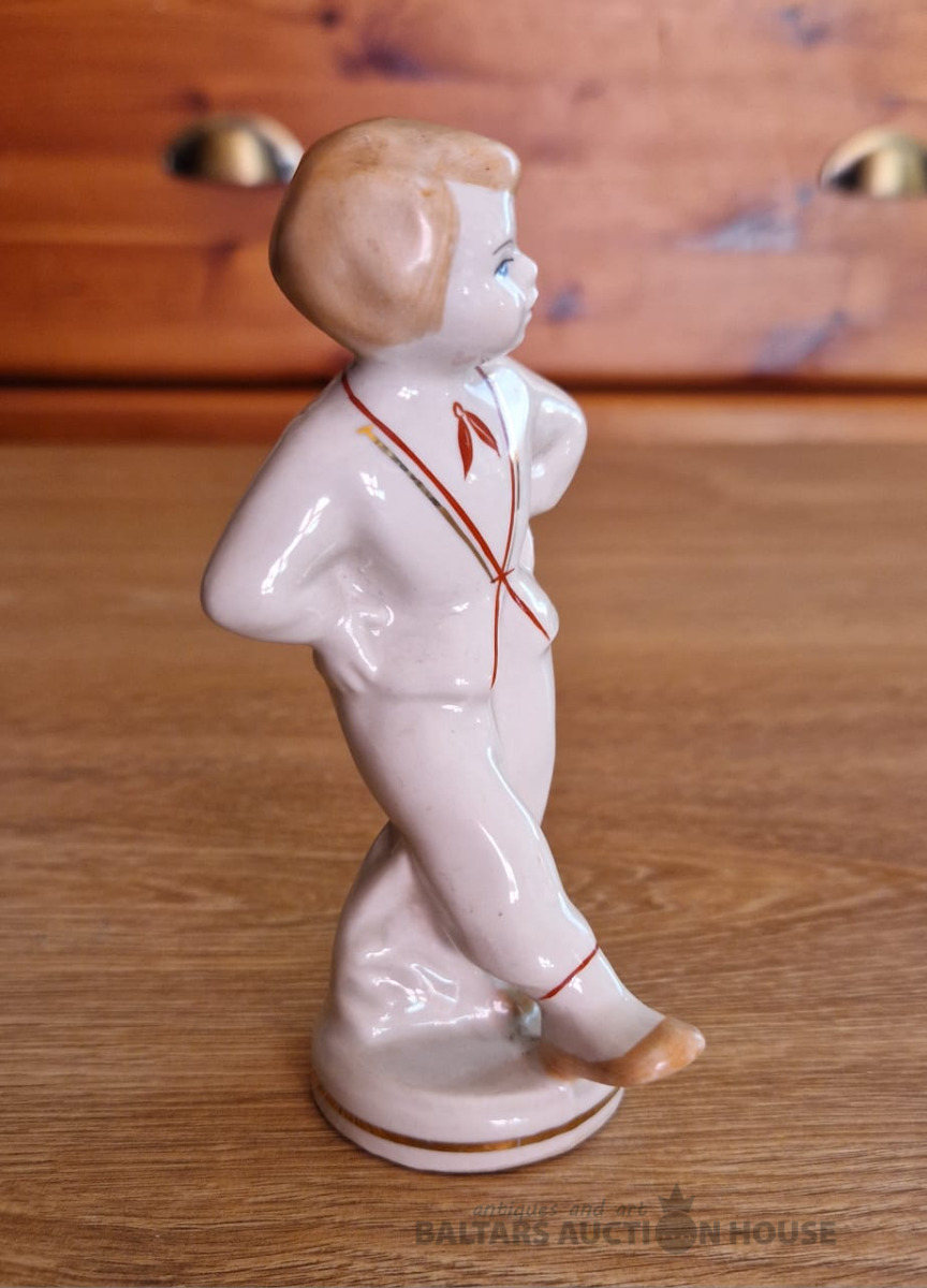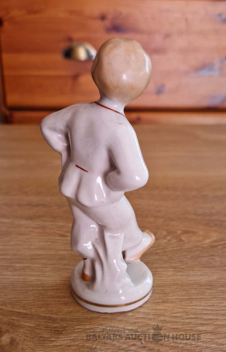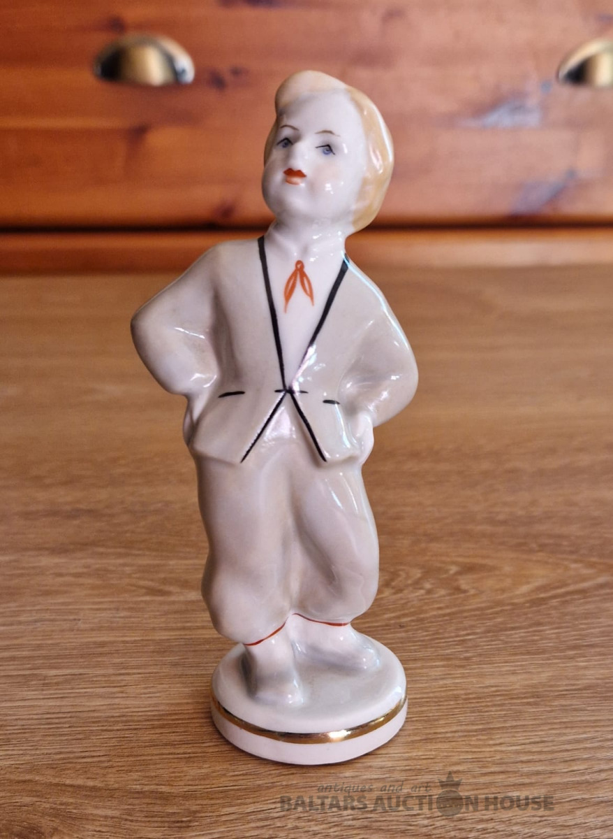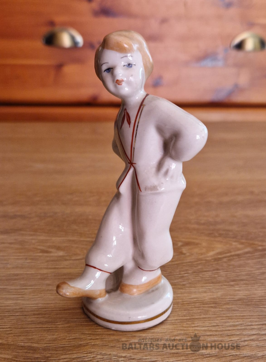 Rīgas porcelāns . Puisis no pārīša , ar retāku apģērba rotājumu , blondiem matiem . pamatnei apakšā robs , nedaudz noberzta pastalas krāsa
