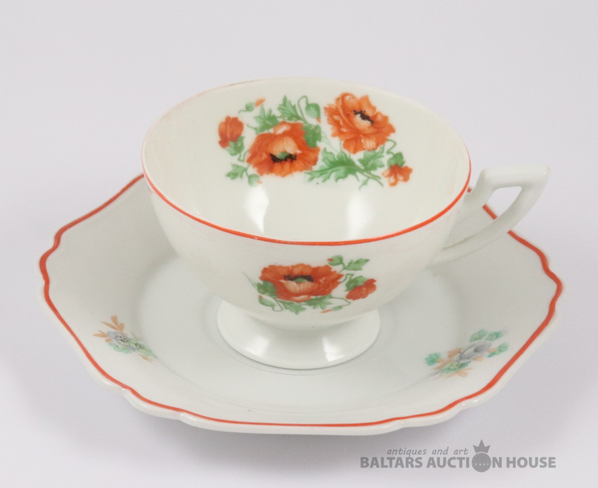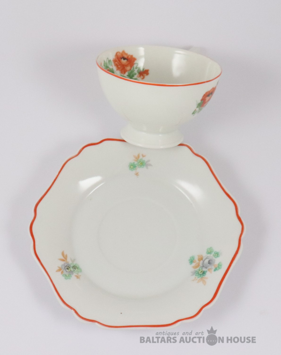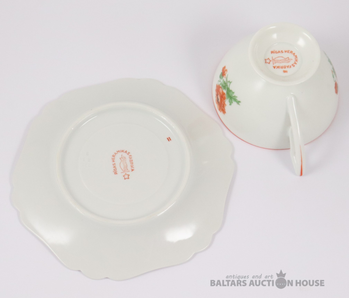 Tase ar apakštasi. Porcelāns, dekols. Rīgas keramikas fabrika. h=6,5 cm. d=9,7 cm un 16,3 cm