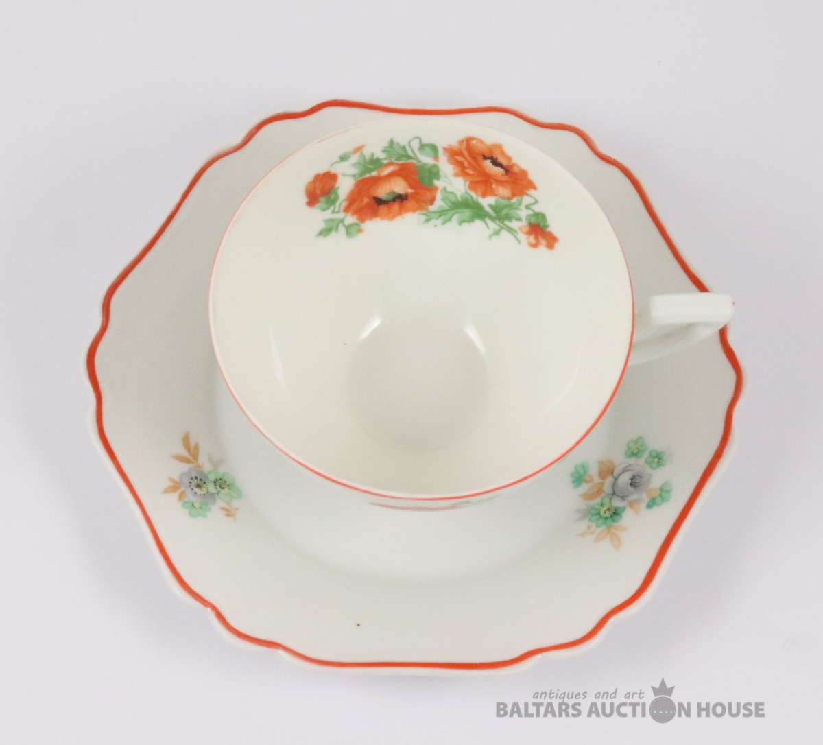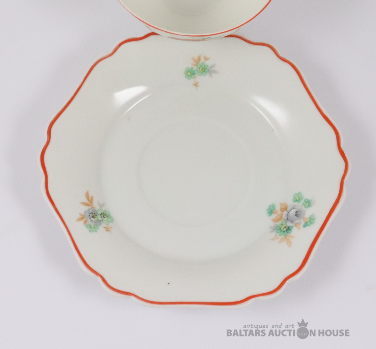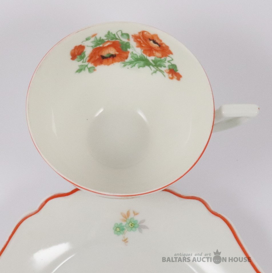 Tase ar apakštasi. Porcelāns, dekols. Rīgas keramikas fabrika. h=6,5 cm. d=9,7 cm un 16,3 cm