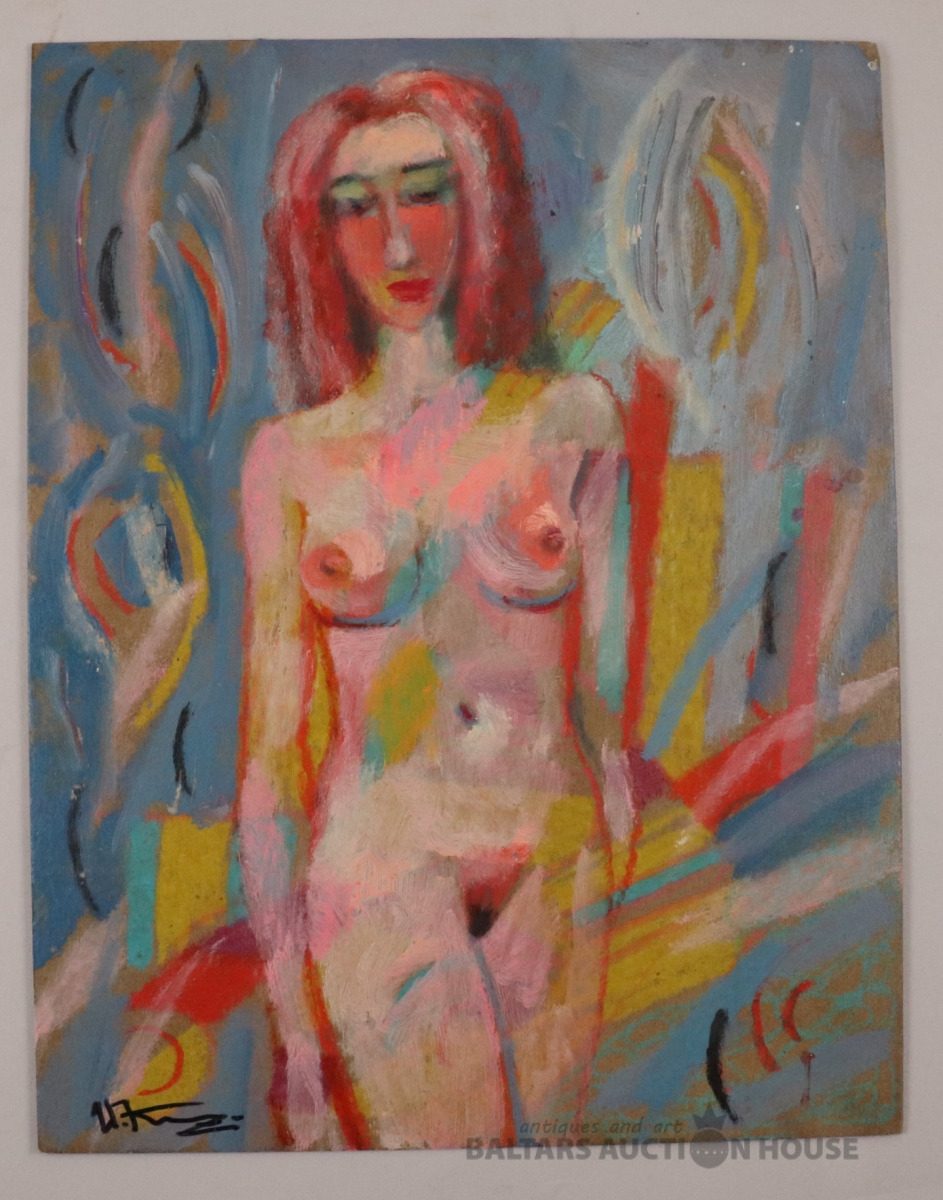 Uldis Krauze (1958). MEITENE ZILĀ FONĀ. Kartons, jaukta tehnika. 33x26 cm
