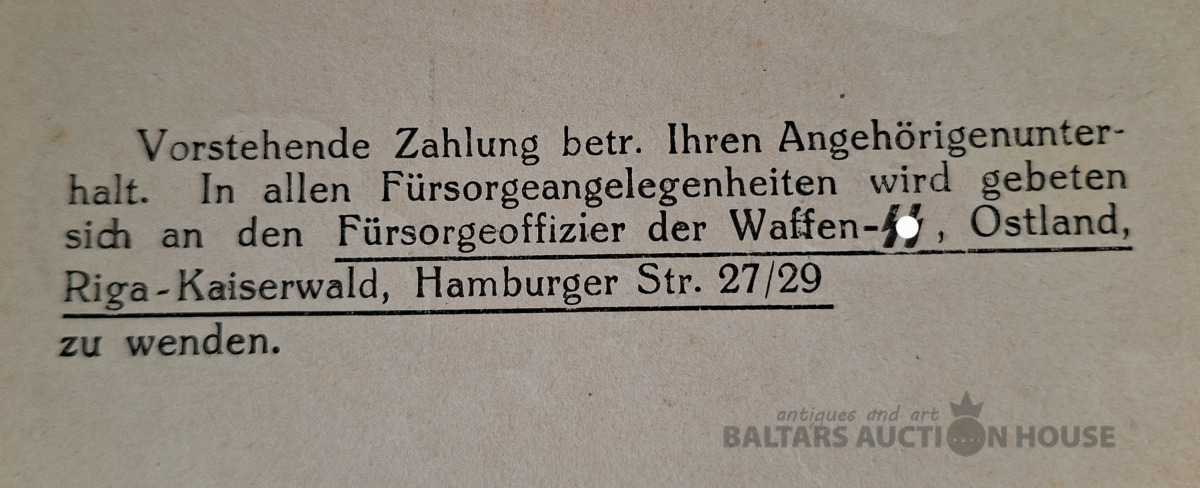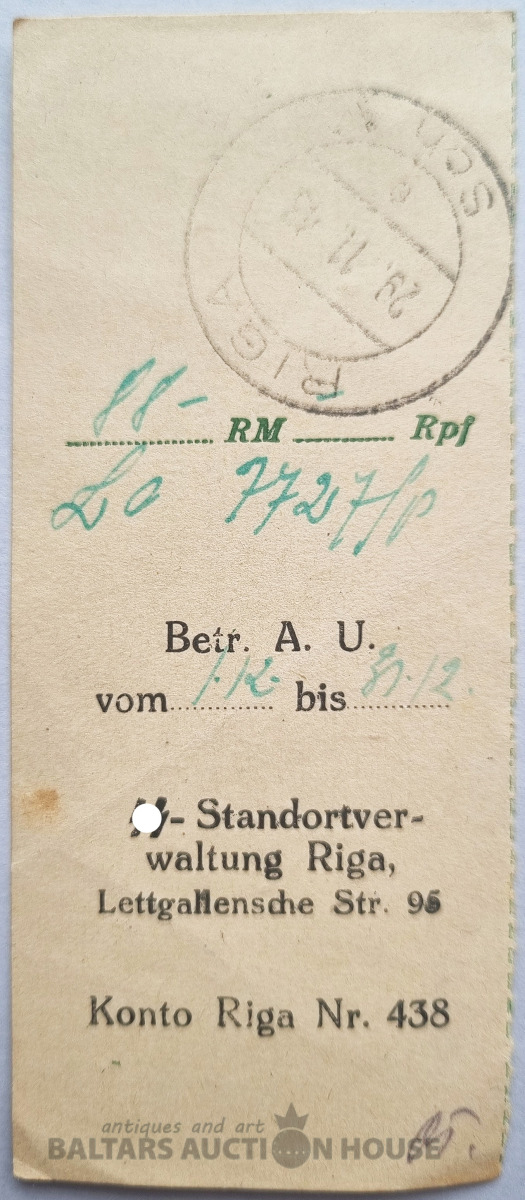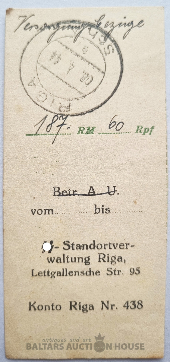 VĀCIJA LATVIJA SS Pasta pārvedums 187.60 RM. LIETOTS RĪGA 1944