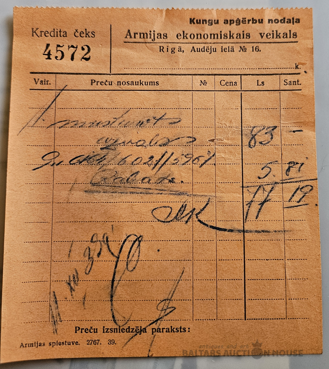 Kredīta čeks " Armijas ekonomikais" veikals.Kungu apģērbu nodaļa.
