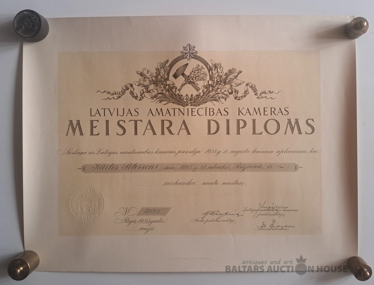 Latvijas amatniecības kameras meistara diploms Nr.2073. 1938.g.