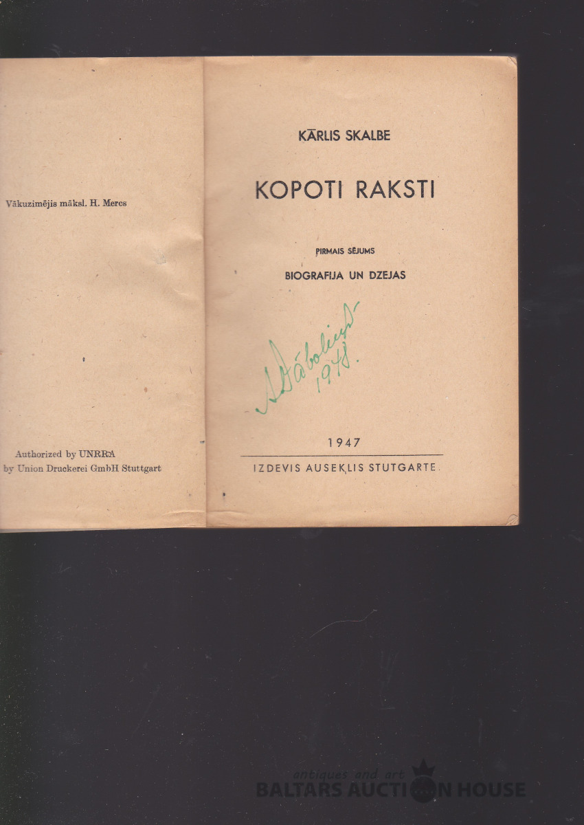 Kārlis Skalbe KOPOTI RAKSTI, 1947. g. Izdevis AUSEKLIS Štutgartē. Vāku zīm. H. Mercs