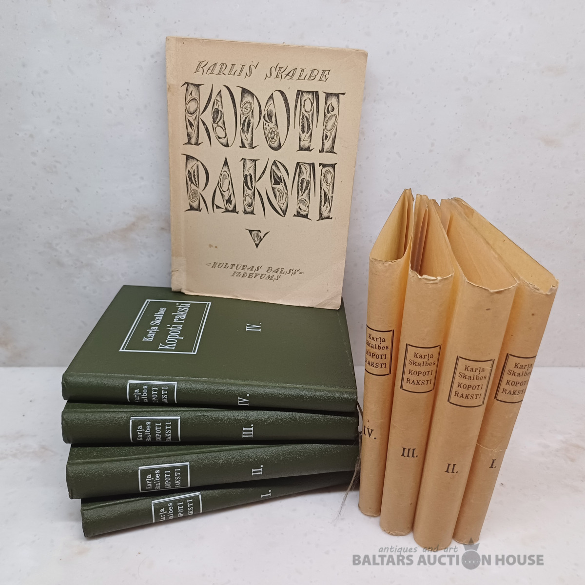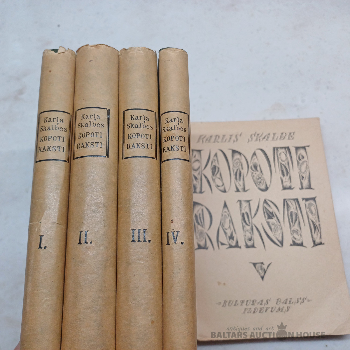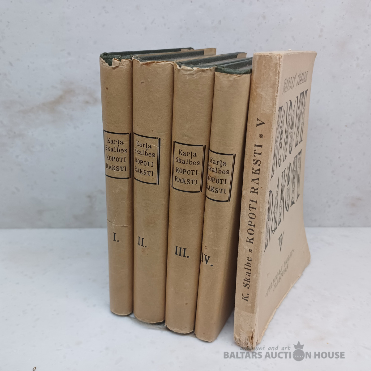 Kārlis Skalbe KOPOTI RAKSTI (I-V), 1922.g. Kultūras balss izdevums. Pilns komplekts. I-IV oriģinālajos izdevniecības cieto vāku sējumos ar saglabātu oriģinālo apvāku (LIELS RETUMS!) kolekcijas stāvoklī! V sējuma vāku zīm. Vidbergs