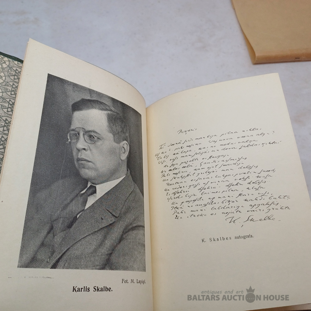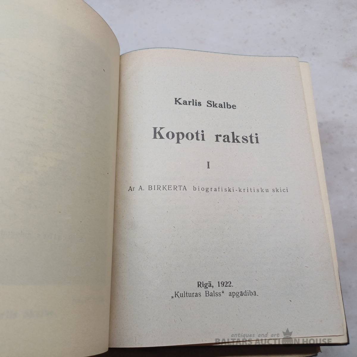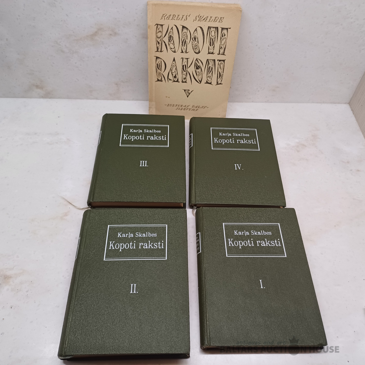 Kārlis Skalbe KOPOTI RAKSTI (I-V), 1922.g. Kultūras balss izdevums. Pilns komplekts. I-IV oriģinālajos izdevniecības cieto vāku sējumos ar saglabātu oriģinālo apvāku (LIELS RETUMS!) kolekcijas stāvoklī! V sējuma vāku zīm. Vidbergs