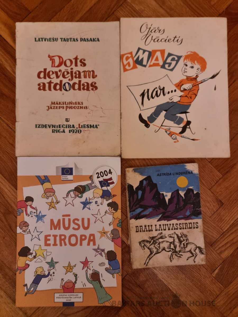 Latviešu tautas pasaka "Dots devējam atdodas"Ojārs Vācietis "Dzirsmas par...", "Mūsu Eiropa" un Astrīda Lindgrēna "Brāļi lauvas sirdis". (Visas grāmatas ar defektiem).