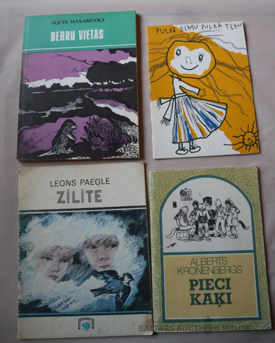 Aļess Masarenka ''Bebru vietās'' (1983. gads), Leons Paegle ''Zīlīte'' (1981. gads), Alberts Kronenbergs ''Pieci kaķi'' (1985. gads) un ''Pulkā einu, , Grāmatas lieliskā stāvoklī.