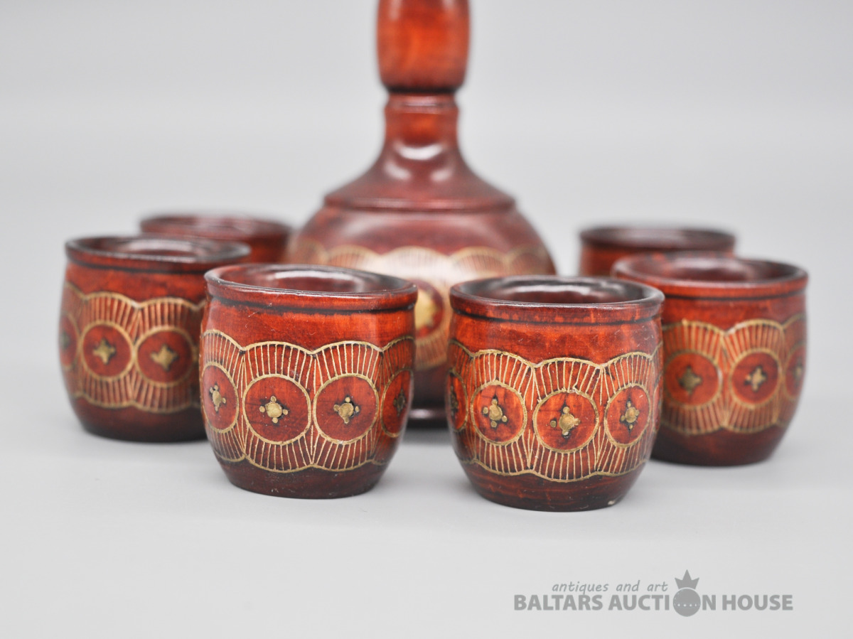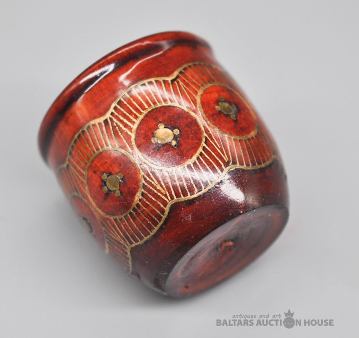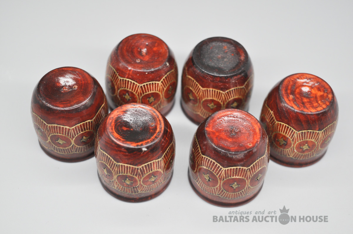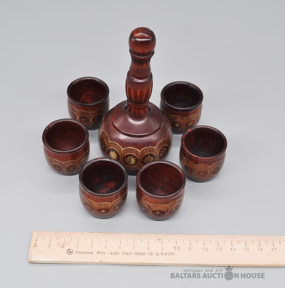 Koka glāzīšu komplekts. Tradicionāla, sarežģīta Dagestānas meistaru koka inkrustācijas tehnika ar metālu. Dagestānas PSR.