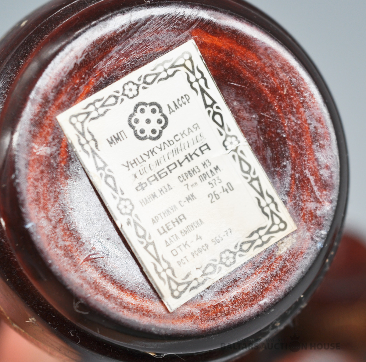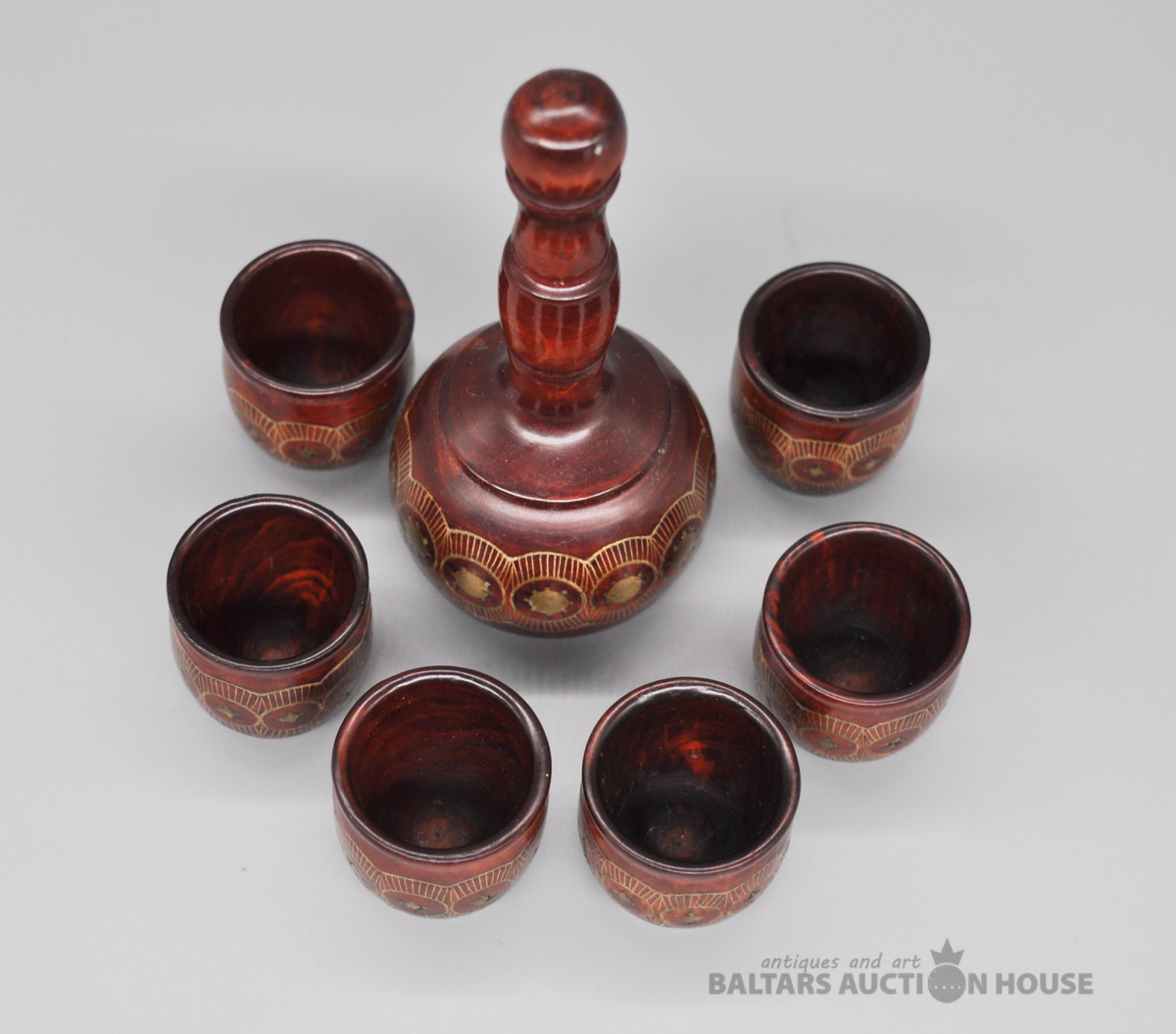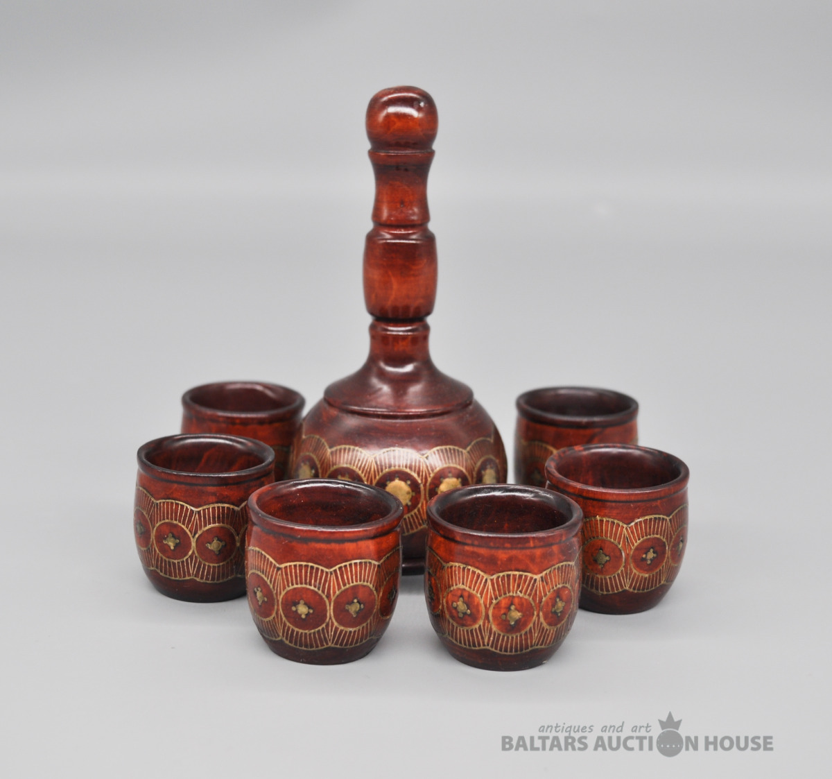 Koka glāzīšu komplekts. Tradicionāla, sarežģīta Dagestānas meistaru koka inkrustācijas tehnika ar metālu. Dagestānas PSR.