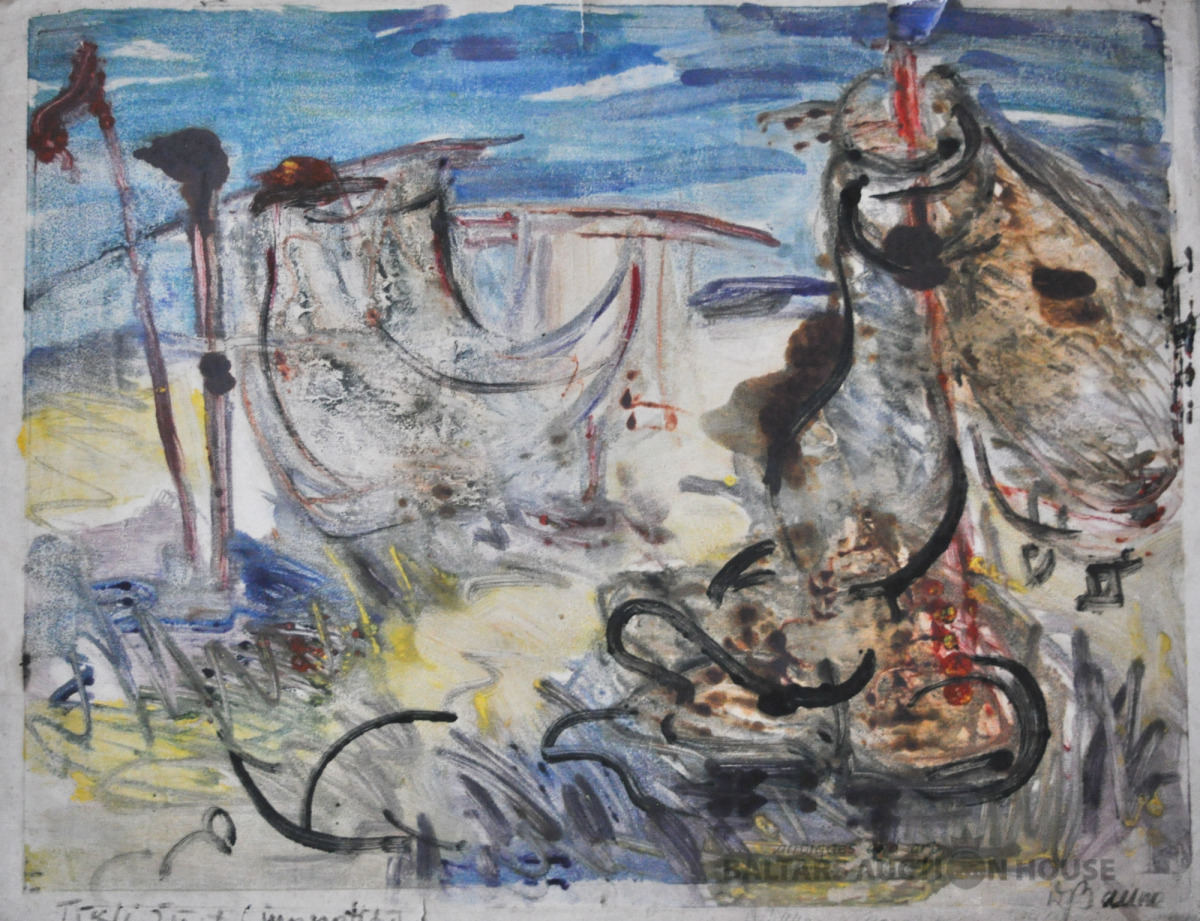 Dzidra Bauma Monotipija "Tīkli žūst". Vairāki plīsumi sānos. 54x73 cm.