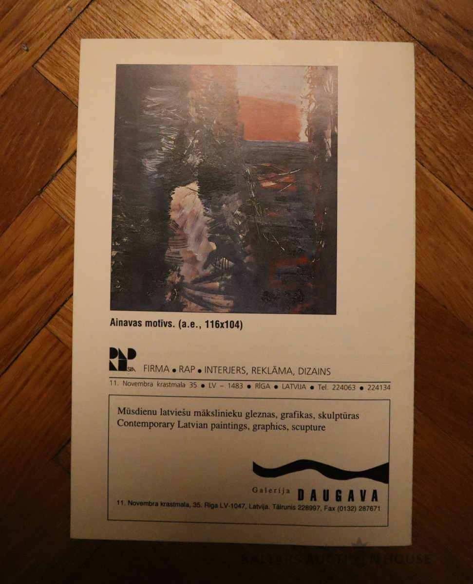 90. MĀKSLAS DARBU IZSOLE NO 9. JANVĀRA - 13. JANVĀRIM 09.01.2026 89. MĀKSLAS DARBU IZSOLE NO 21. NOVEMBRA - 25. NOVEMBRIM 21.11.2025 88. MĀKSLAS DARBU IZSOLE NO 24. OKTOBRA - 28. OKTOBRIM 24.10.2025 87. MĀKSLAS DARBU IZSOLE NO 26. SEPTEMBRA - 30. SEPTEMBRIM 26.09.2025 86. MĀKSLAS DARBU IZSOLE NO 22. AUGUSTA - 26. AUGUSTAM 22.08.2025 85. MĀKSLAS DARBU IZSOLE NO 18. JŪLIJA - 22. JŪLIJAM 18.07.2025 84. MĀKSLAS DARBU IZSOLE NO 13. JŪNIJA - 17. JŪNIJAM 13.06.2025 83. MĀKSLAS DARBU IZSOLE NO 9. MAIJA - 13. MAIJAM 09.05.2025 82. MĀKSLAS DARBU IZSOLE NO 4. APRĪĻA - 8. APRĪLIM 04.04.2025 81. MĀKSLAS DARBU IZSOLE NO 14. MARTA - 18. MARTAM 14.03.2025 57. MĀKSLAS DARBU IZSOLE NO 7. FEBRUĀRA - 11. FEBRUĀRIM 07.02.2025 56. MĀKSLAS DARBU IZSOLE NO 10. JANVĀRA - 14. JANVĀRIM 10.01.2025 78. MĀKSLAS DARBU IZSOLE NO 15.NOVEMBRA LĪDZ 19.NOVEMBRIM 15.11.2024 77. MĀKSLAS DARBU IZSOLE NO 27.SEPTEMBRA LĪDZ 1.OKTOBRIM 27.09.2024 76. MĀKSLAS DARBU IZSOLE NO 23. AUGUSTA LĪDZ 27. AUGUSTAM 23.08.2024 75. MĀKSLAS DARBU IZSOLE NO 5. JŪLIJA LĪDZ 9. JŪLIJAM 05.07.2024 74. MĀKSLAS DARBU IZSOLE NO 24. MAIJA LĪDZ 28. MAIJAM 24.05.2024 73. MĀKSLAS DARBU IZSOLE NO 26. APRĪĻA LĪDZ 30. APRĪLIM 26.04.2024 72. MĀKSLAS DARBU IZSOLE NO 8. MARTA LĪDZ 12. MARTAM 08.03.2024 71. MĀKSLAS DARBU IZSOLE NO 9. FEBRUĀRA - 13. FEBRUĀRIM 09.02.2024 70. MĀKSLAS DARBU IZSOLE NO 5. JANVĀRA - 9. JANVĀRIM 05.01.2024 69. MĀKSLAS DARBU IZSOLE NO 8. DECEMBRA - 12. DECEMBRIM. 08.12.2023 68. MĀKSLAS DARBU IZSOLE NO 3.NOVEMBRA - 7. NOVEMBRIM 03.11.2023 67. MĀKSLAS DARBU IZSOLE NO 6 OKTOBRA - 10. OKTOBRIM 06.10.2023 66. MĀKSLAS DARBU IZSOLE NO 8 SEPTEMBRA - 12. SEPTEMBRIM 08.09.2023 66. MĀKSLAS DARBU IZSOLE NO 11. AUGUSTA - 15. AUGUSTAM 11.08.2023 65. MĀKSLAS DARBU IZSOLE NO 7. JŪLIJA - 11. JŪLIJAM 07.07.2023 64. MĀKSLAS DARBU IZSOLE NO 26. MAIJA - 30. MAIJAM 26.05.2023 63. MĀKSLAS DARBU IZSOLE NO 21. APRĪĻA - 25. APRĪLIM 21.04.2023 62. MĀKSLAS DARBU IZSOLE NO 17. MARTA - 21. MARTAM 17.03.2023 61. MĀKSLAS DARBU IZSOLE NO 27. JANVĀRA - 31. JANVĀRIM 27.01.2023 60. MĀKSLAS DARBU IZSOLE NO 9. DECEMBRA - 13. DECEMBRIM 09.12.2022 59. MĀKSLAS DARBU IZSOLE NO 4. NOVEMBRA - 8. NOVEMBRIM 04.11.2022 58. MĀKSLAS DARBU IZSOLE NO 7. OKTOBRA - 11. OKTOBRIM 07.10.2022 57. MĀKSLAS DARBU IZSOLE NO 9. SEPTEMBRA - 13. SEPTEMBRIM 09.09.2022 56. MĀKSLAS DARBU IZSOLE NO 15. AUGUSTA - 21. AUGUSTAM 15.08.2022 55. MĀKSLAS DARBU IZSOLE NO 8. JŪLIJA - 12. JŪLIJAM 08.07.2022 54. MĀKSLAS DARBU IZSOLE NO 3. JŪNIJA - 7. JŪNIJAM 03.06.2022 53. MĀKSLAS DARBU IZSOLE NO 6. MAIJA - 10. MAIJAM 06.05.2022 52. MĀKSLAS DARBU IZSOLE NO 8. APRĪĻA - 12. APRĪLIM 08.04.2022 51. MĀKSLAS DARBU IZSOLE NO 4. MARTA - 8. MARTAM 04.03.2022 50. MĀKSLAS DARBU IZSOLE NO 4. FEBRUĀRA - 8. FEBRUĀRIM 04.02.2022 49. MĀKSLAS DARBU IZSOLE NO 7. JANVĀRA - 11. JANVĀRIM 07.01.2022 48. MĀKSLAS DARBU IZSOLE NO 26. NOVEMBRA - 30. NOVEMBRIM 26.11.2021 47. MĀKSLAS DARBU IZSOLE NO 22. OKTOBRA - 27. OKTOBRIM 22.10.2021 46. MĀKSLAS DARBU IZSOLE NO 24. SEPTEMBRA - 29. SEPTEMBRIM 24.09.2021 45. MĀKSLAS DARBU IZSOLE NO 20. AUGUSTA - 24. AUGUSTAM 20.08.2021 44. MĀKSLAS DARBU IZSOLE NO 23. JŪLIJA - 27. JŪLIJAM 23.07.2021 1. MĀKSLAS DARBU IZSOLE NO 22. JŪNIJA - 30. JŪNIJAM 22.06.2021 42. MĀKSLAS DARBU IZSOLE NO 4. JŪNIJA - 28. JŪNIJAM 04.06.2021 41. MĀKSLAS DARBU IZSOLE NO 21. MAIJA - 25. MAIJAM 21.05.2021 40. MĀKSLAS DARBU IZSOLE NO 8. MAIJA - 12. MAIJAM 08.05.2021 39. MĀKSLAS DARBU IZSOLE NO 23. APRĪĻA - 27. APRĪLIM 23.04.2021 38. MĀKSLAS DARBU IZSOLE NO 9. APRĪĻA - 13. APRĪLIM 09.04.2021 37. MĀKSLAS DARBU IZSOLE NO 26. MARTA - 30. MARTAM 26.03.2021 36. MĀKSLAS DARBU IZSOLE NO 13. MARTA - 17. MARTAM_ 2021 13.03.2021 35. MĀKSLAS DARBU IZSOLE NO 28. FEBRUĀRA - 3. MARTAM_ 2021. 26.02.2021 34. MĀKSLAS DARBU IZSOLE NO 22. JANVĀRA - 26. JANVĀRIM_ 2021. 22.01.2021 Atkārtota Izsole 02.12.2020 33. MĀKSLAS DARBU IZSOLE NO 24. NOVEMBRA - 1. DECEMBRIM 27.11.2020 32. MĀKSLAS DARBU IZSOLE NO 30. OKTOBRA - 3. NOVEMBRIM 30.10.2020 31. MĀKSLAS DARBU IZSOLE NO 25. SEPTEMBRA - 29. SEPTEMBRIM 25.09.2020 29. MĀKSLAS DARBU IZSOLE NO 24. jūlijs - 28. jūlijs. 24.07.2020 29. MĀKSLAS DARBU IZSOLE NO 12. jūnija - 16. jūnijam. 12.06.2020 28. MĀKSLAS DARBU IZSOLE NO 22. maija - 26. maijam. 22.05.2020 27. MĀKSLAS DARBU IZSOLE NO 24. APRĪĻA LĪDZ 28. APRĪLIM 24.04.2020 26. MĀKSLAS DARBU IZSOLE NO 20. MARTA LĪDZ 24. MARTAM 20.03.2020 25. MĀKSLAS DARBU IZSOLE NO 21. FEBRUĀRA LĪDZ 25. FEBRUĀRIM 21.02.2020 24. MĀKSLAS DARBU IZSOLE NO 24. JANVĀRA LĪDZ 28. JANVĀRIM 24.01.2020 23. MĀKSLAS DARBU IZSOLE NO 13. DECEMBRA LĪDZ 17. DECEMBRIM 13.12.2019 22. MĀKSLAS DARBU IZSOLE NO 22. NOVEMBRA LĪDZ 26. NOVEMBRIM 22.11.2019 21. MĀKSLAS DARBU IZSOLE NO 25. OKTOBRA LĪDZ 29. OKTOBRIM 25.10.2019 20.MĀKSLAS DARBU IZSOLE NO 20. SEPTEMBRA LĪDZ 24. SEPTEMBRIM 20.09.2019 19.MĀKSLAS DARBU IZSOLE NO 23. AUGUSTA LĪDZ 27. AUGUSTAM. 23.08.2019 18.MĀKSLAS DARBU IZSOLE NO 26. JŪLIJA LĪDZ 30. JŪLIJAM 26.07.2019 17.MĀKSLAS DARBU IZSOLE NO 14. JŪNIJA LĪDZ 18. JŪNIJAM 14.06.2019 16.MĀKSLAS DARBU IZSOLE NO 24.MAIJA LĪDZ 28.MAIJAM. 24.05.2019 15. MĀKSLAS DARBU IZSOLES NO 17. MAIJA - 21. MAIJAM 17.05.2019 14. MĀKSLAS DARBU IZSOLES NO 26.APRĪĻA - 30.APRĪLIM 26.04.2019 PASTKARŠU IZSOLE NO 08. APRĪĻA LĪDZ 09. APRĪLIM. 08.04.2019 13. MĀKSLAS DARBU IZSOLES ATKĀRTOJUMS 29. MARTĀ 29.03.2019 13. MĀKSLAS DARBU IZSOLE NO 22. MARTA LĪDZ 26.MARTAM. 22.03.2019 12. MĀKSLAS DARBU IZSOLE NO 22.FEBRUĀRIS LĪDZ 26. FEBRUĀRIM. 22.02.2019 11. MĀKSLAS DARBU IZSOLE NO 25. JANVĀRA LĪDZ 29. JANVĀRIM 25.01.2019 10. MĀKSLAS DARBU IZSOLE NO 14. DECEMBRA LĪDZ 18. DECEMBRIM 14.12.2018 9. MĀKSLAS DARBU IZSOLE NO 25. NOVEMBRA LĪDZ 27. NOVEMBRA 25.11.2018 8. MĀKSLAS DARBU IZSOLE NO 23. NOVEMBRA LĪDZ 24. NOVEMBRIM 23.11.2018 7.MĀKSLAS DARBU IZSOLE NO 28.OKTOBRA LĪDZ 30.OKTOBRIM 28.10.2018 6. MĀKSLAS DARBU IZSOLE NO 26. SEPTEMBRA LĪDZ 27.