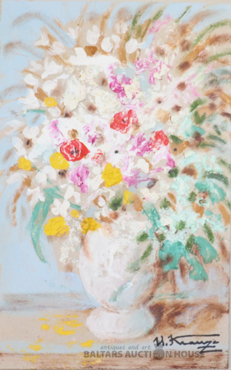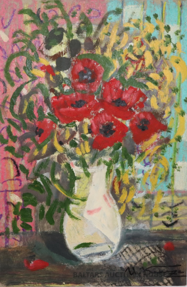 Uldis Krauze (1958). ZIEDI BALTĀ VĀZĒ. Kartons, jaukta tehnika. 31,5x19,8 cm