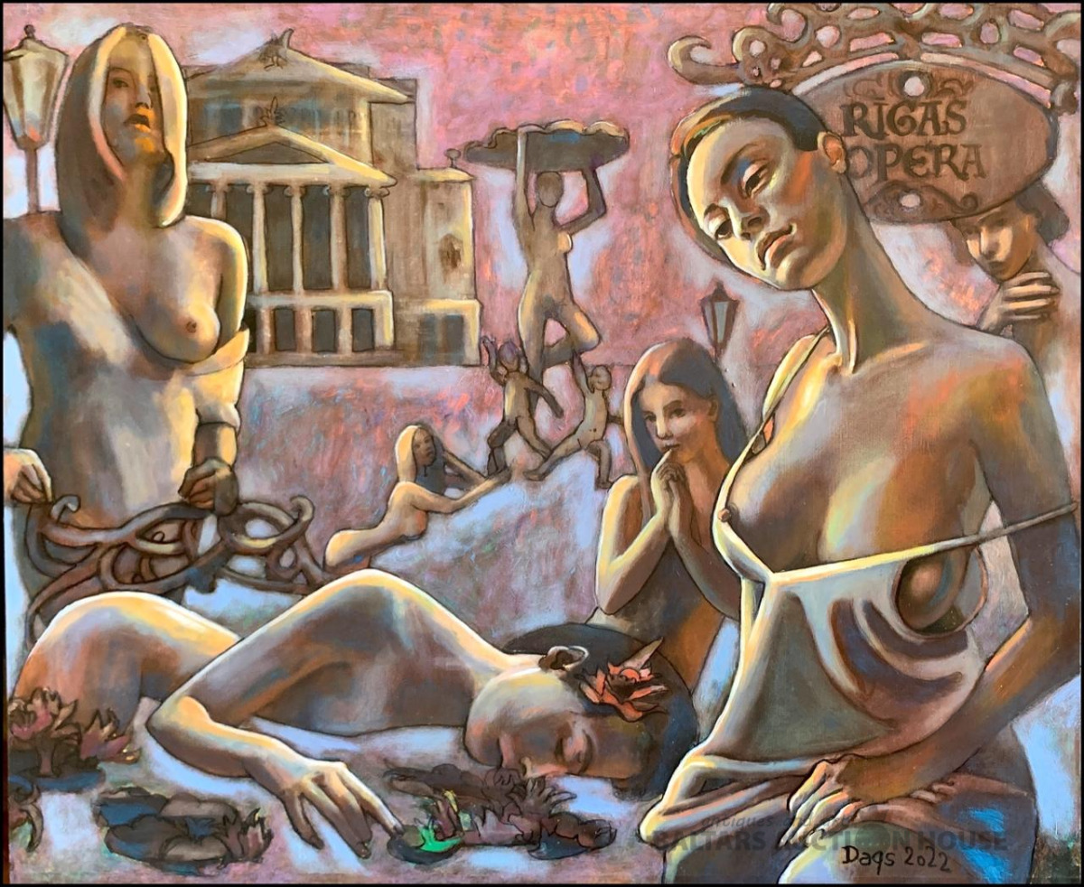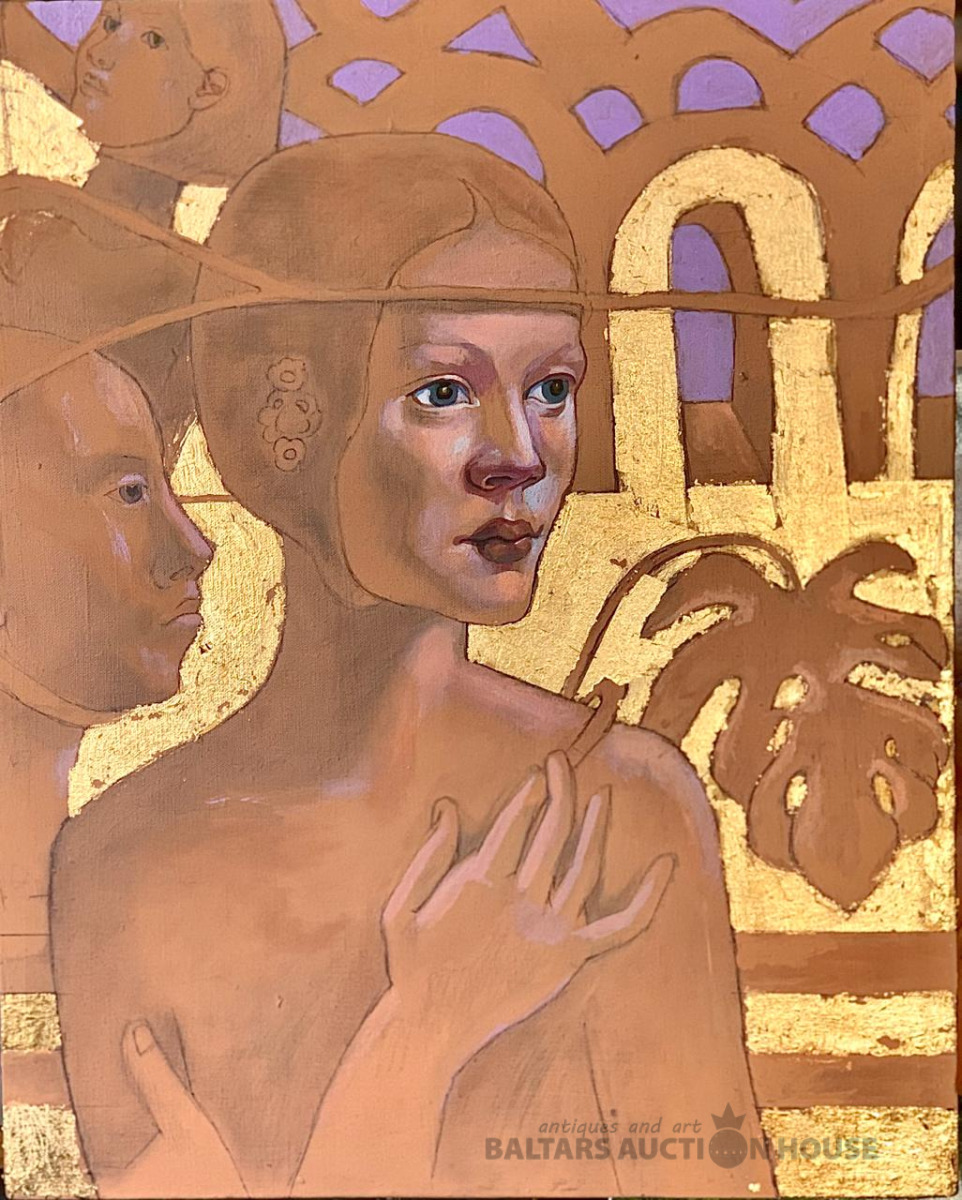 Dags Vidulejs. Rīgas operas sirēnas. Audekls, zelta lapiņas, akrils, eļļa. 65x 80 cm. 2022. g.
