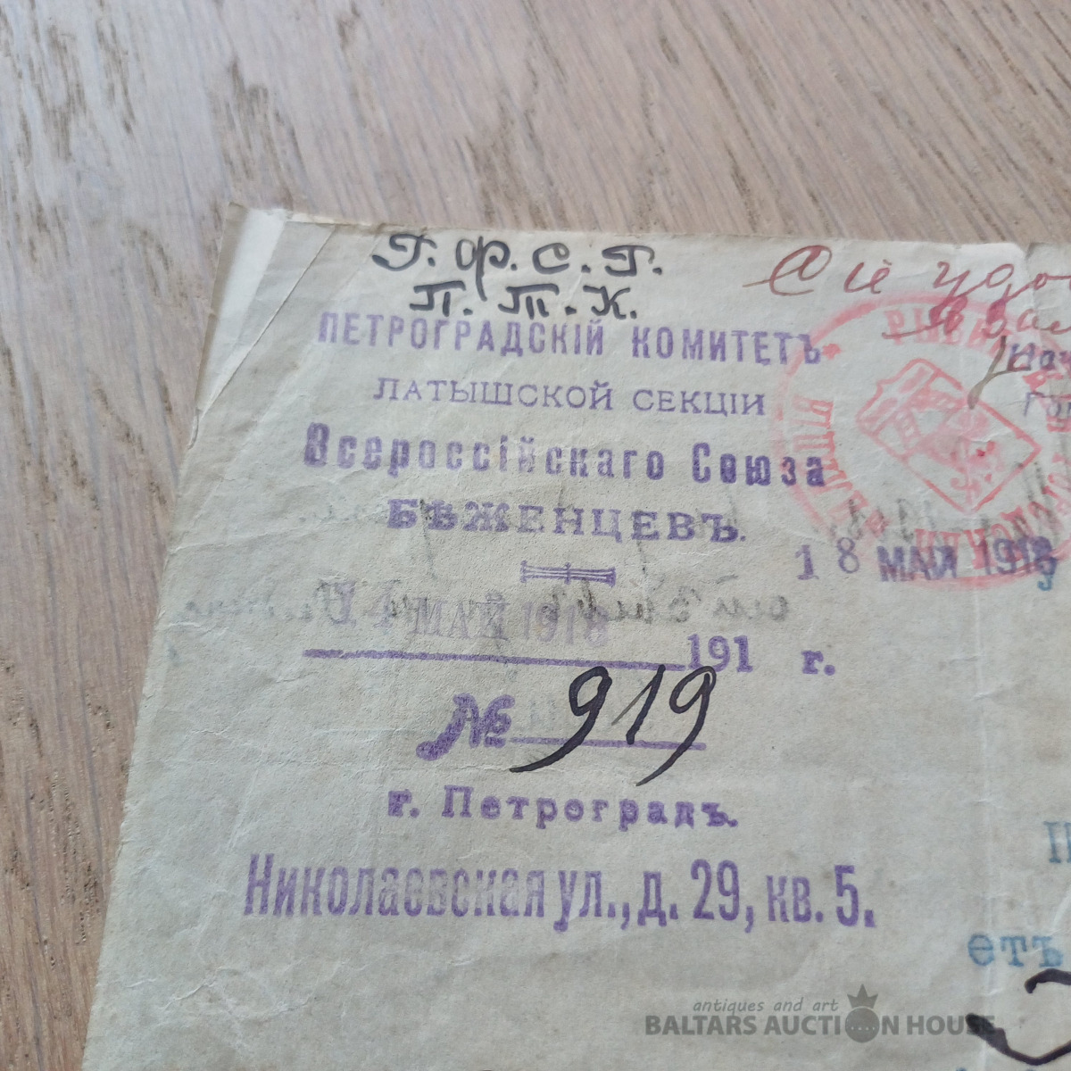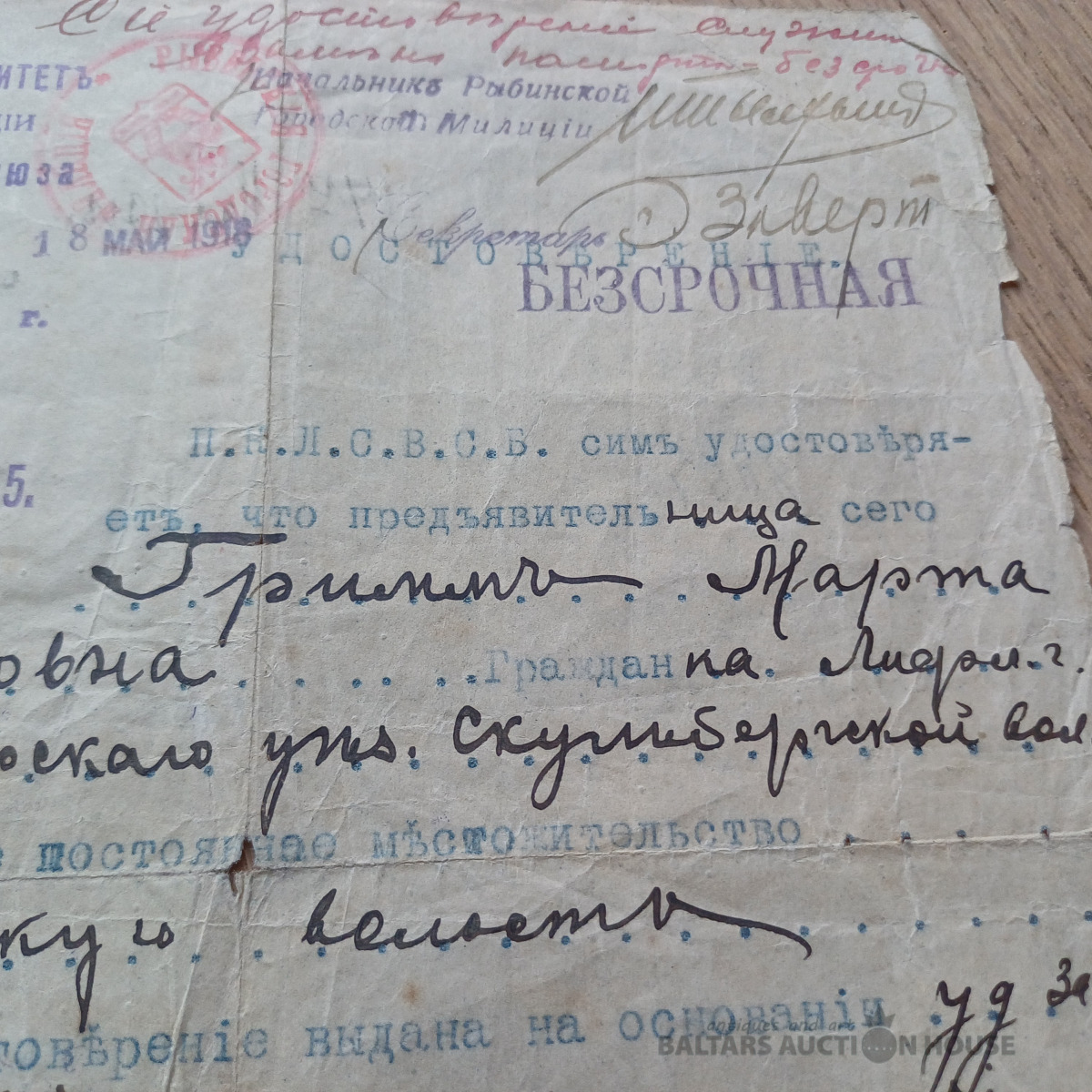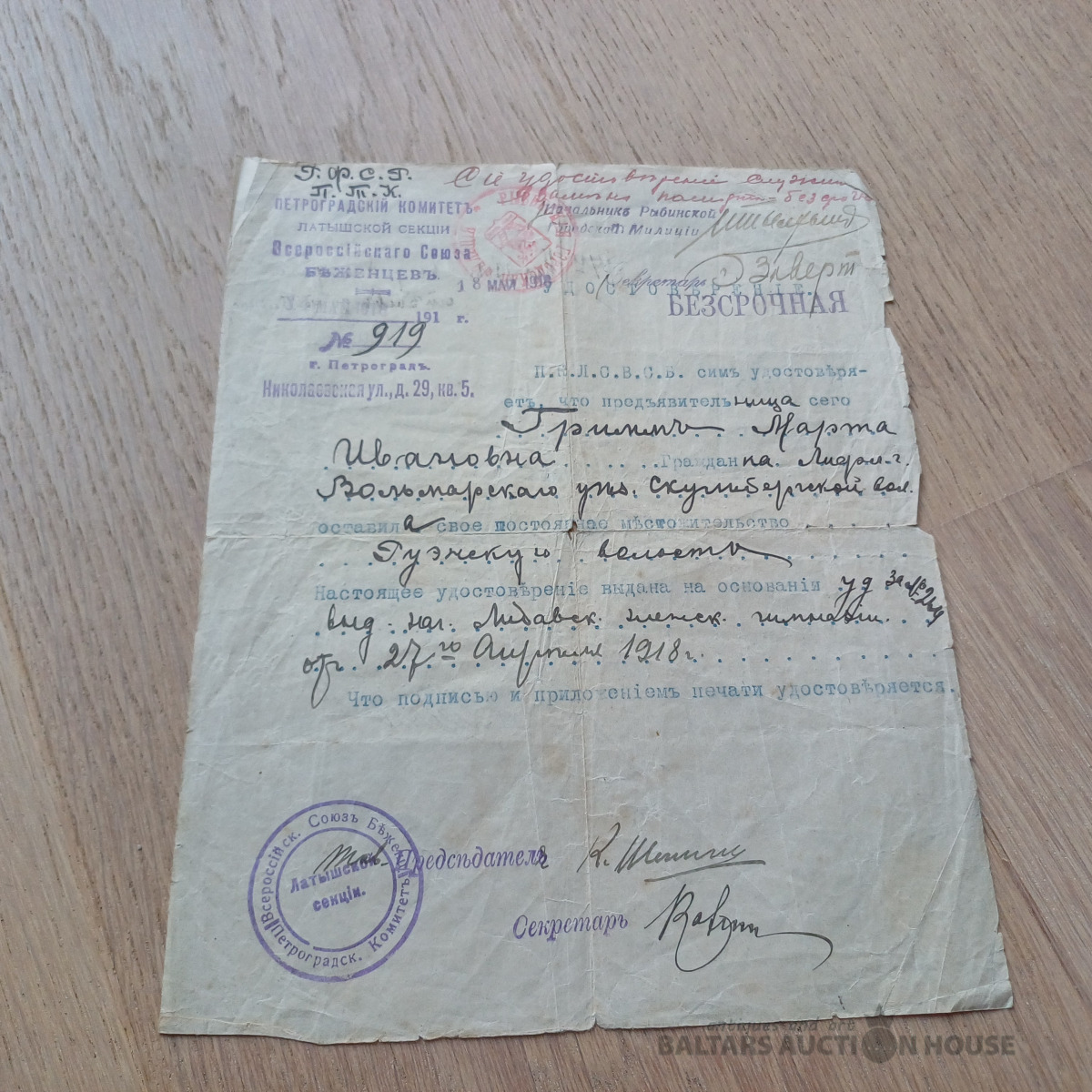 Rets dokuments –laikmeta liecība. Dzejnieces, rakstnieces MARTAS GRIMMAS (МАРТА ГРИММА) dokuments – 1918. g. maija ceļošanas dokuments – Viskrievijas bēgļu savienība Latvijas sekcija Petrogradā. Ar priekšsēdētāja un sekretāra parakstiem