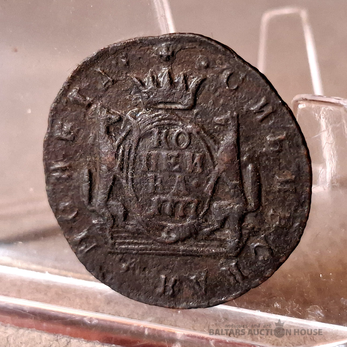 Sibīrijas vara denga jeb 1 kapeikas monēta no 1777. gada, datēta ar Katrīnas II valdīšanas laiku. AUTENTISKUMS NAV GARANTIJAS!!! Pārdošanā ir tas, kas redzams fotoattēlā.