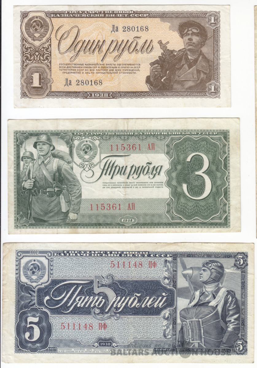 Banknotes, Krievija/Russia, 1, 3, 5 Rubļi 1938 XF+/aUNC