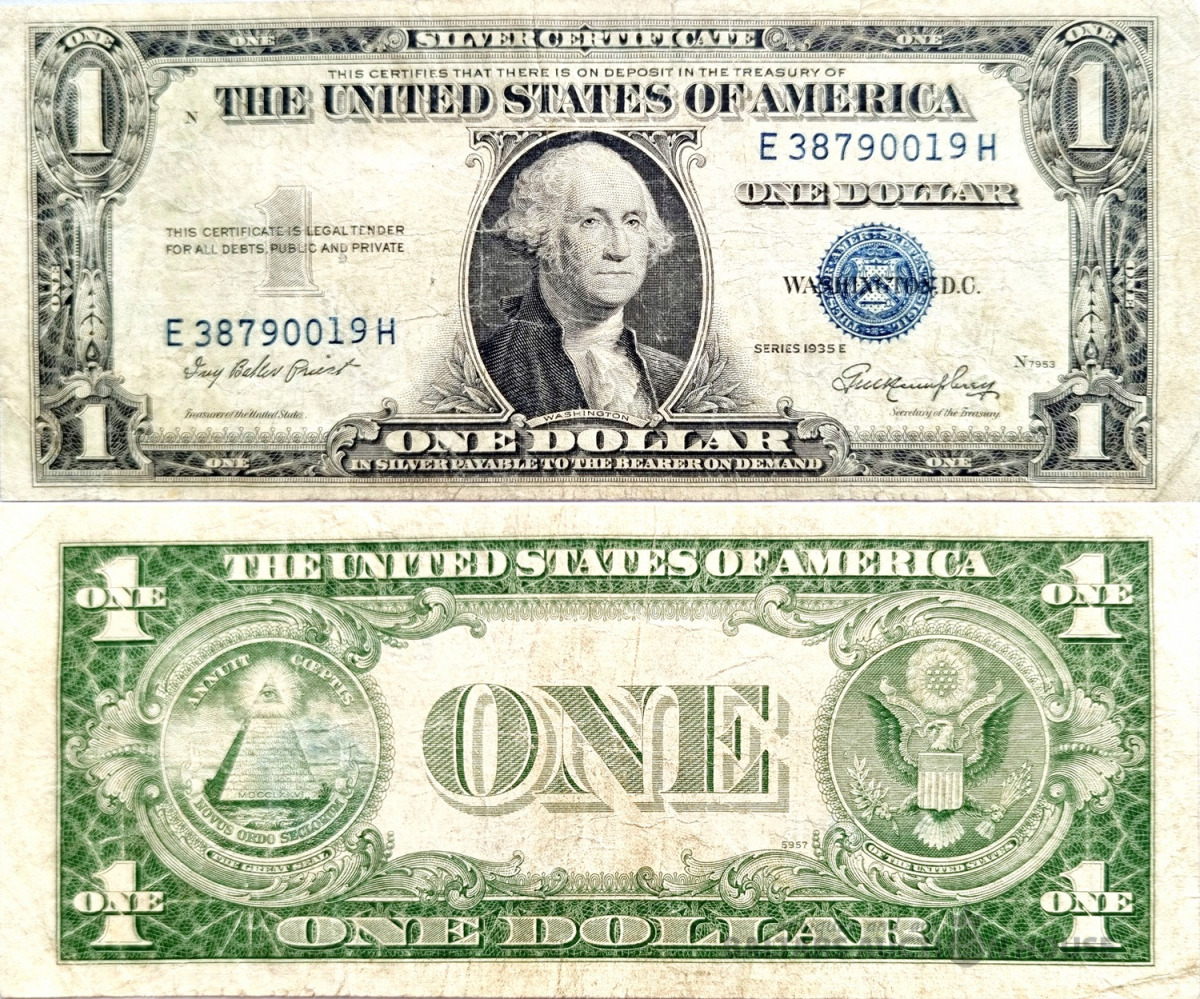 E 38790019 H ASV sudraba sertifikāts, 1935. gada E sērija, viens dolārs.