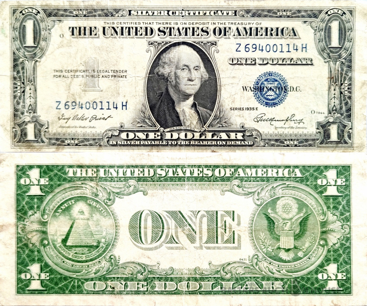 Z 69400114 H ASV sudraba sertifikāts, 1935. gada E sērija, viens dolārs.