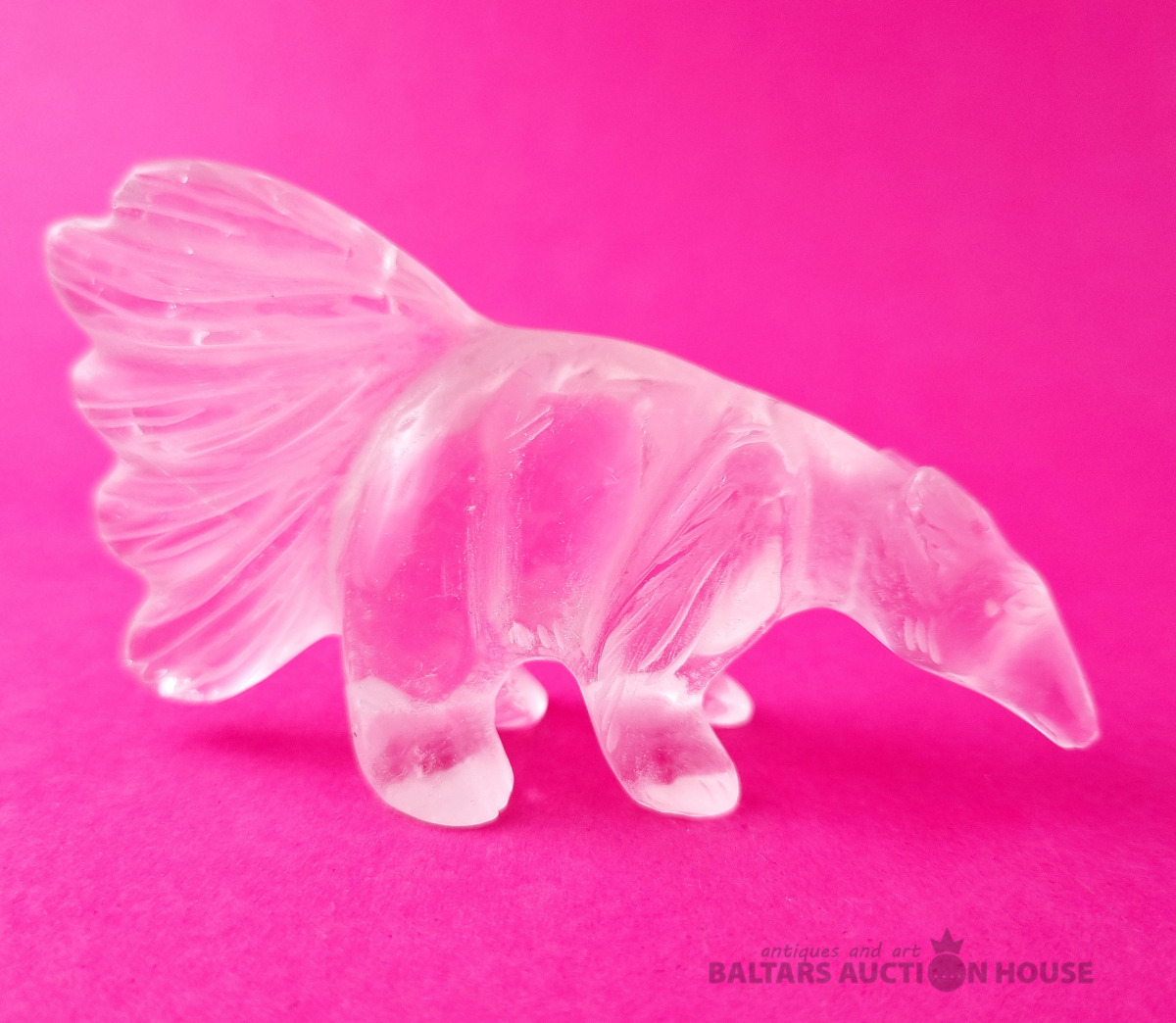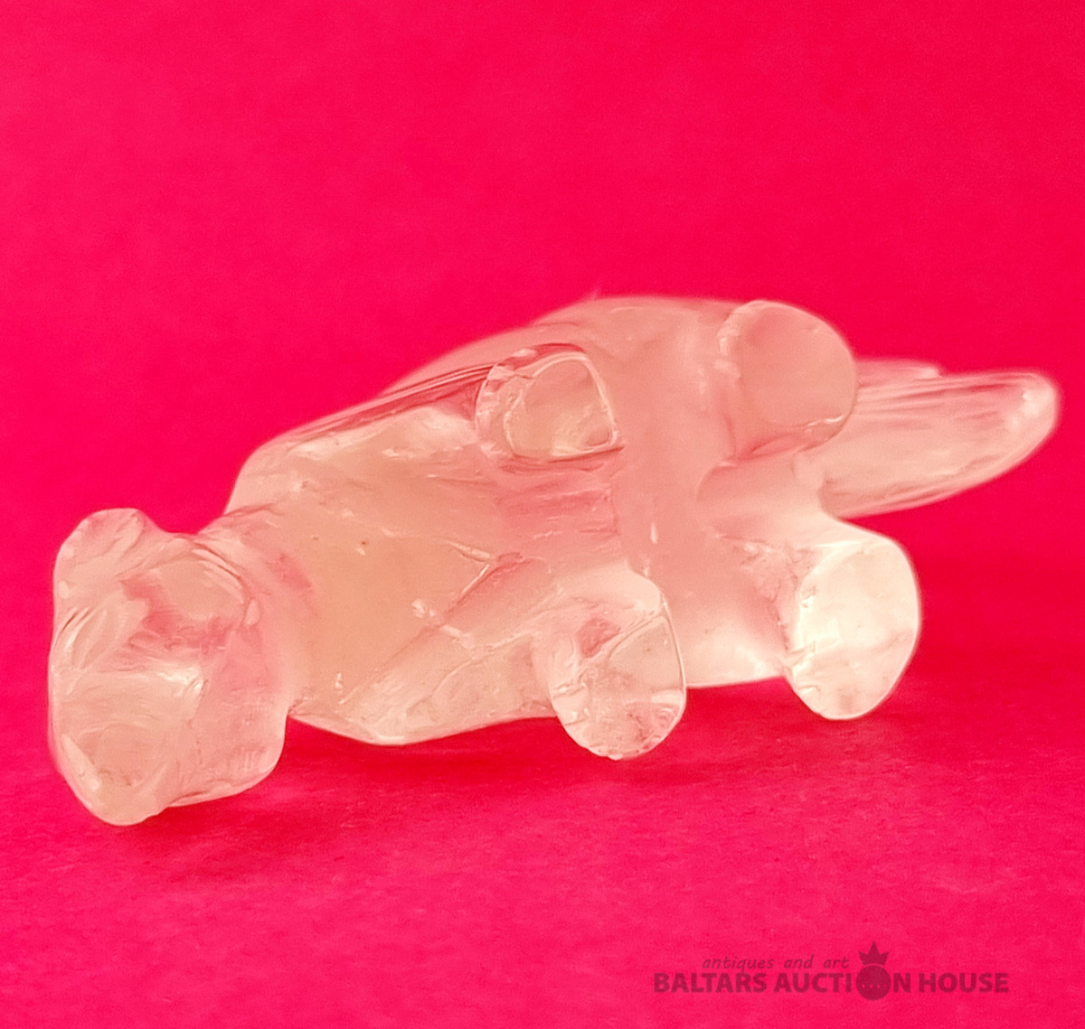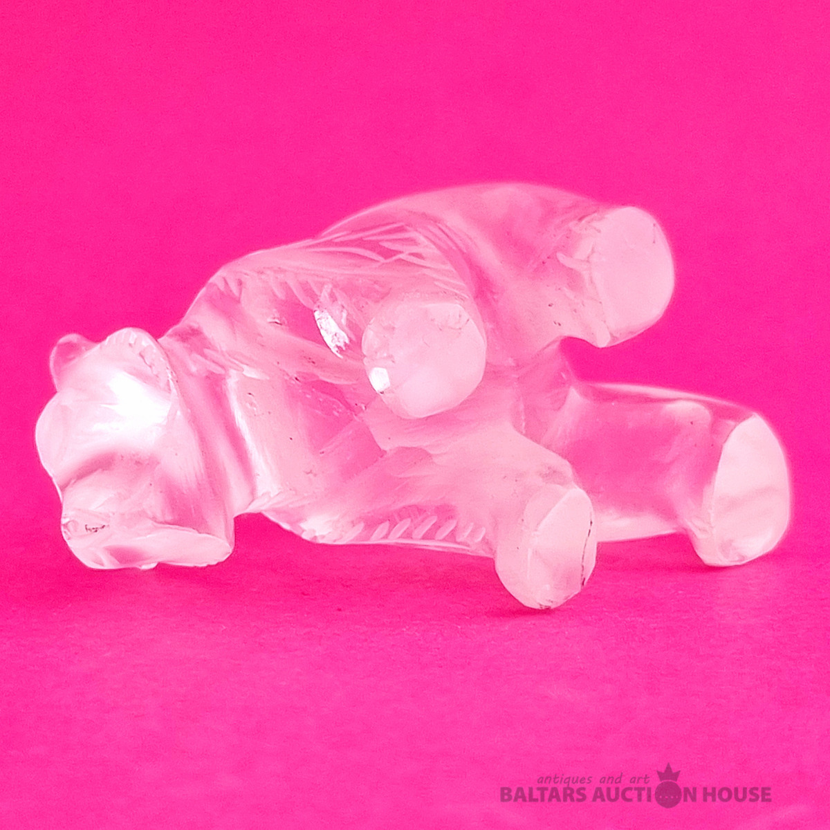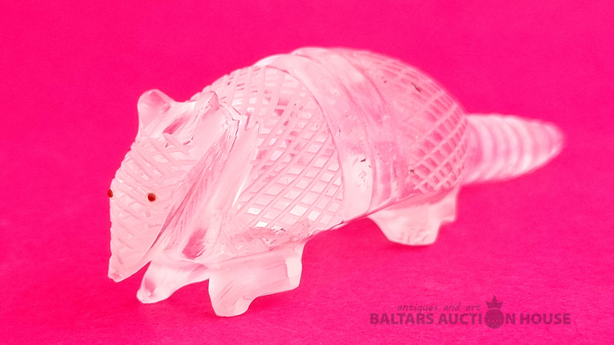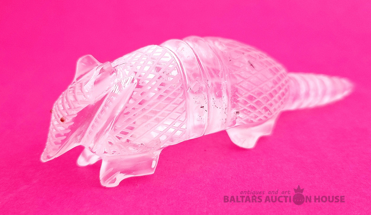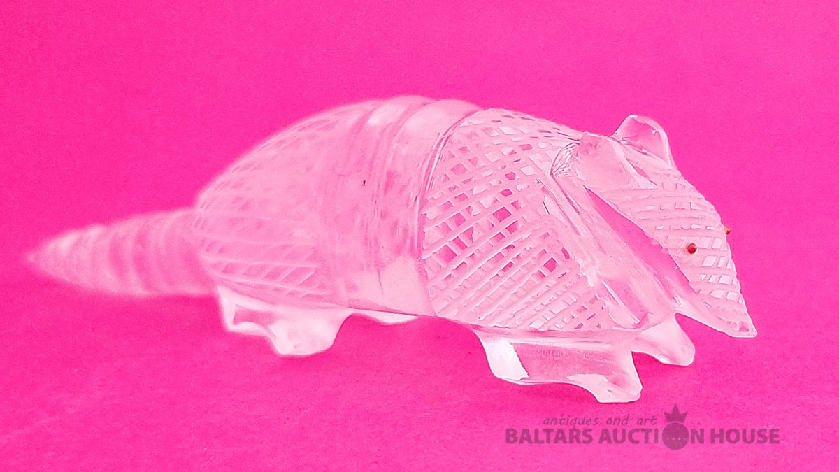 "Skudruēdāja" skulptūra, kas izgatavota no kalnu kristāla. Svars: 100 grami. Augstums: 4,5 cm. Garums: 9 cm. Eiropa.