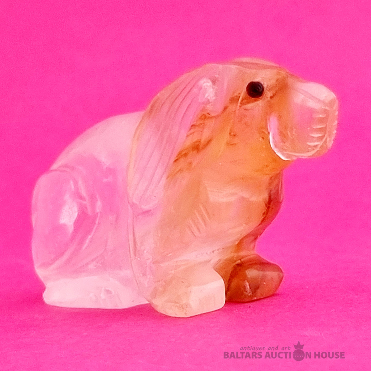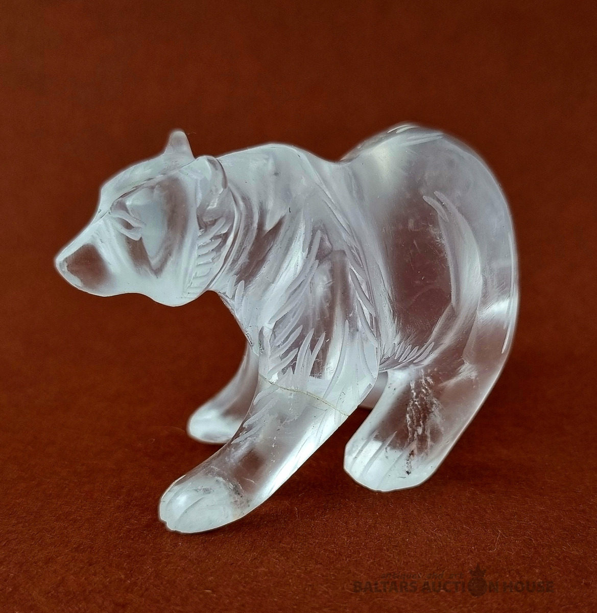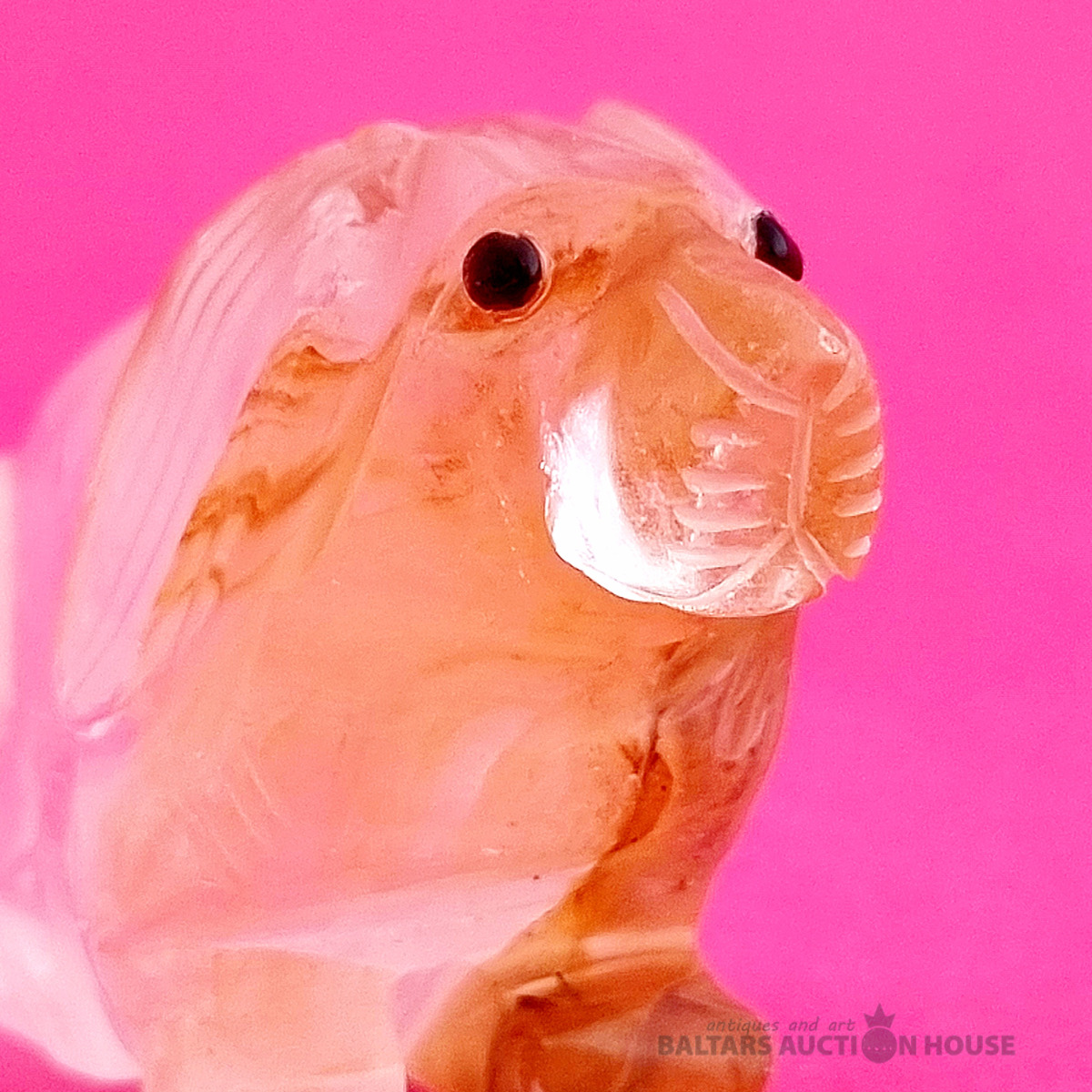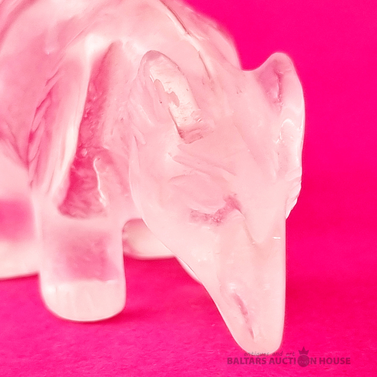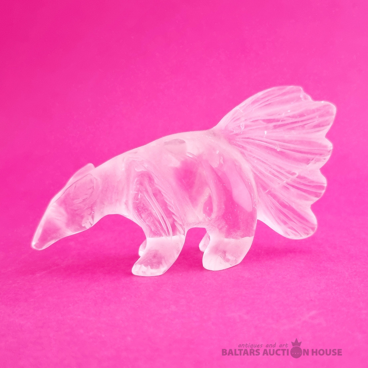 "Skudruēdāja" skulptūra, kas izgatavota no kalnu kristāla. Svars: 100 grami. Augstums: 4,5 cm. Garums: 9 cm. Eiropa.