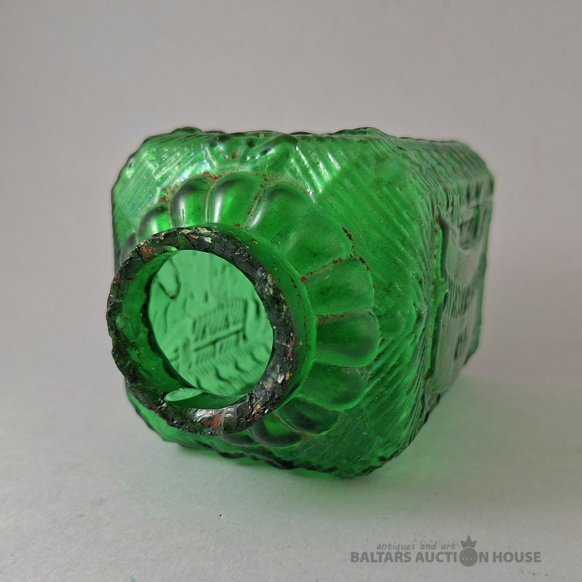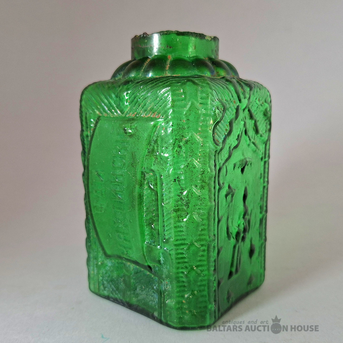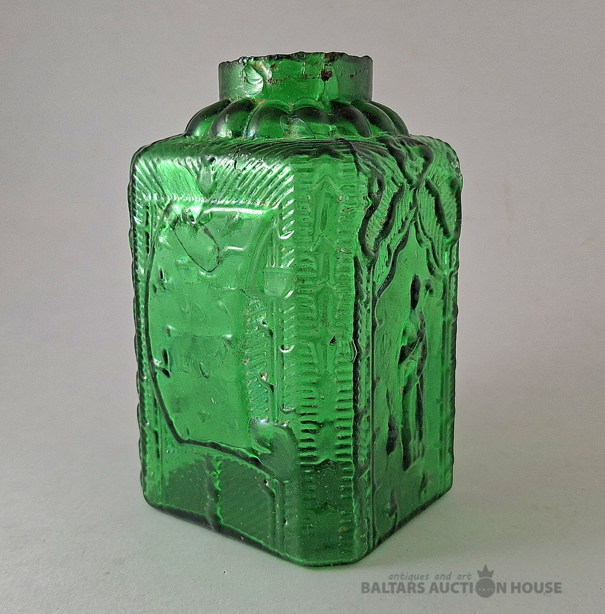 Tējkanna "Kyakhta Tea", 19. gadsimta beigas - 20. gadsimta sākums. Šī antīkā stikla tējkanna tika izmantota Kyakhta tējas pārdošanai pirms vairāk nekā gadsimta. Trūkst metāla daļu: rāmja no tējkannas kakliņa un vāka. Augstums: 12 cm.