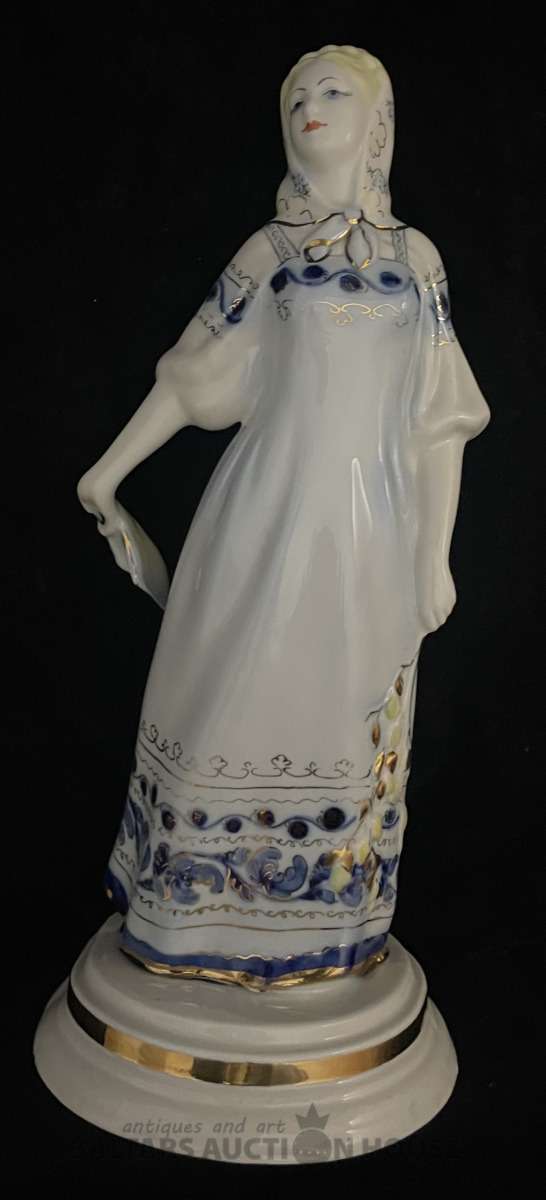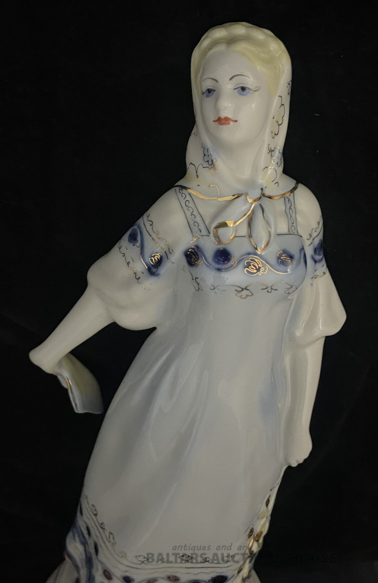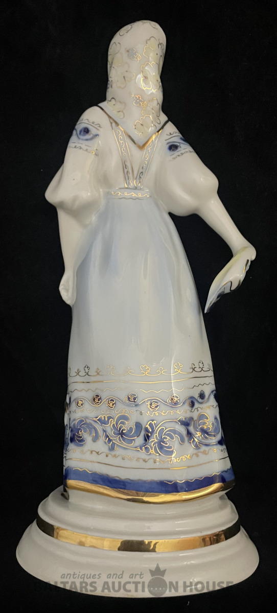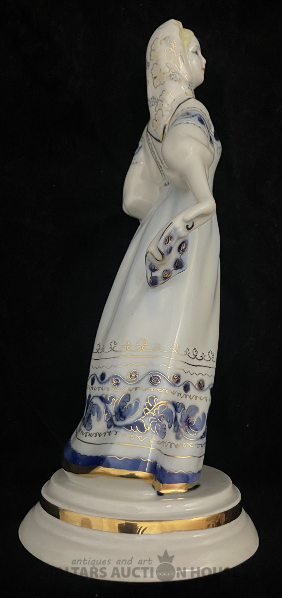 Liela figūra "Sieviete ar lakatiņu", porcelāns, roku gleznojums, zeltījums, h=26 cm, pamatnei izsists neliels robiņš, PSRS