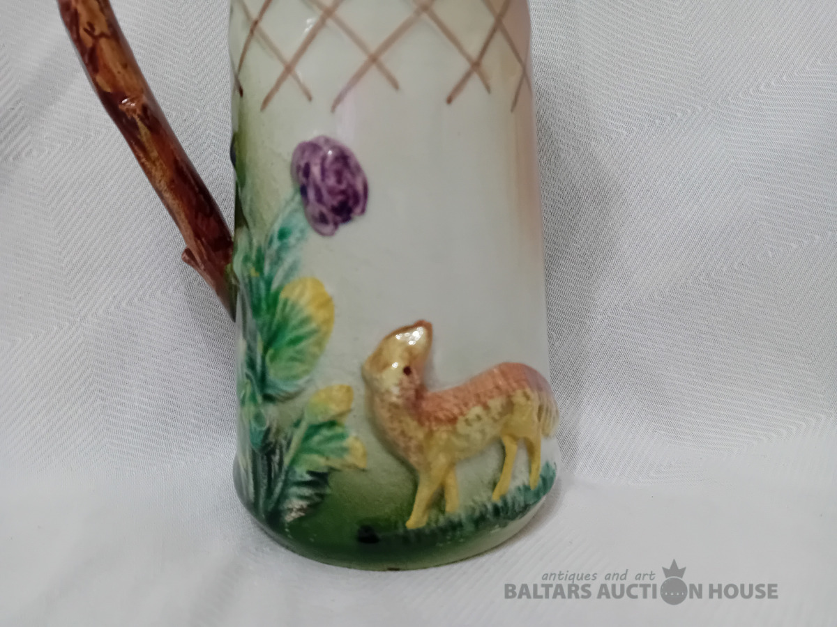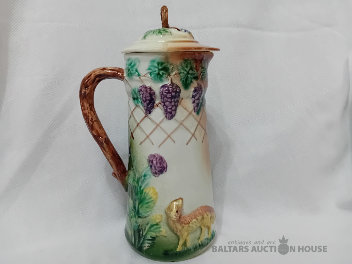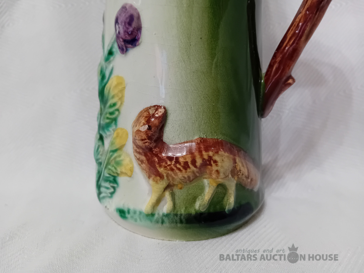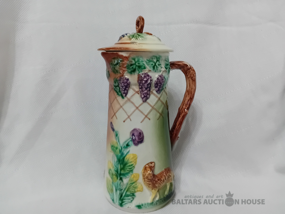Krūze, Lapsa un vīnogas, Kuzņecovs?fajanss ,20.gs. sākums, 24.5 cm h, Vāciņam virspusē atsitums,fajansā tumši pleķi