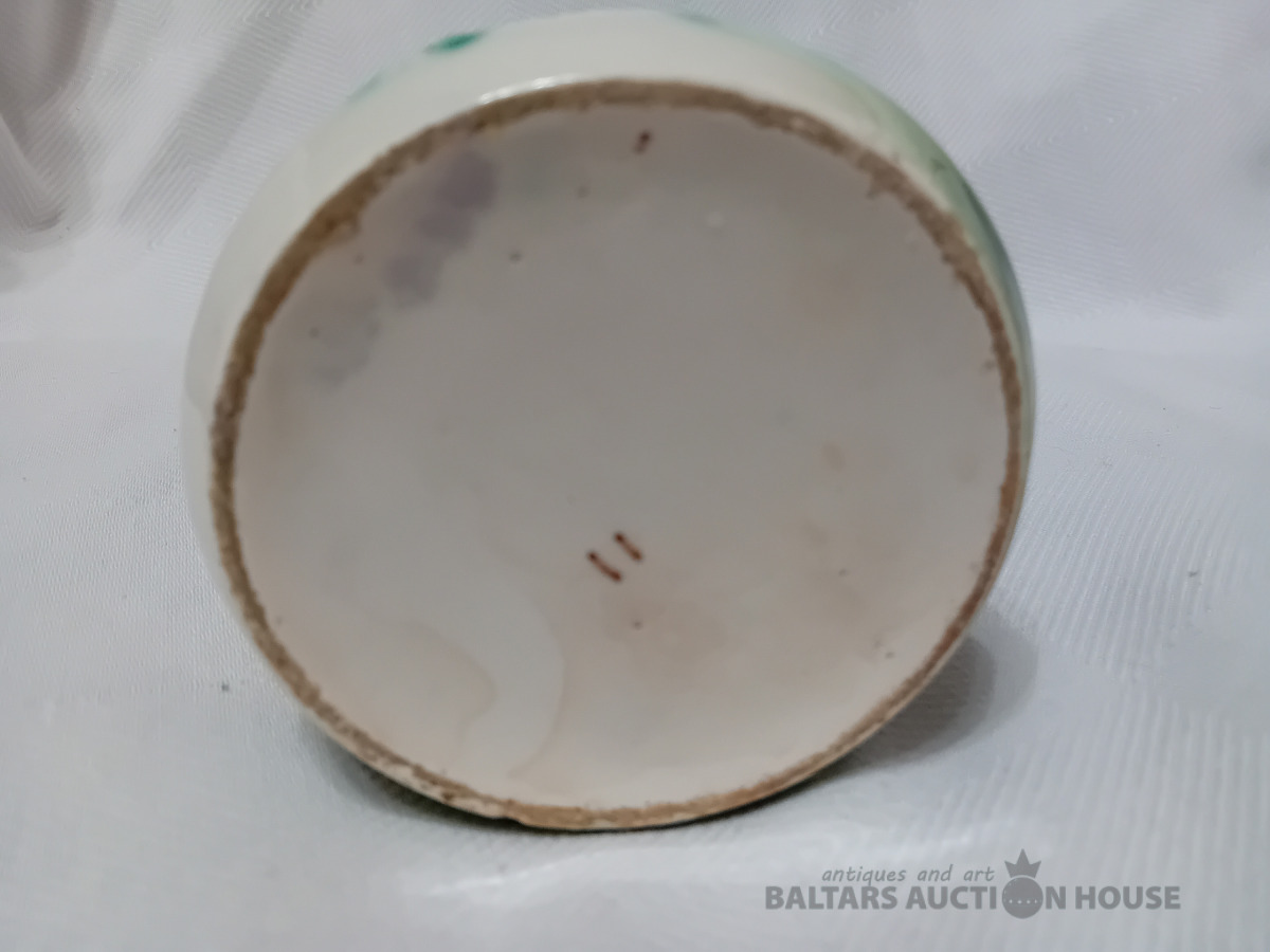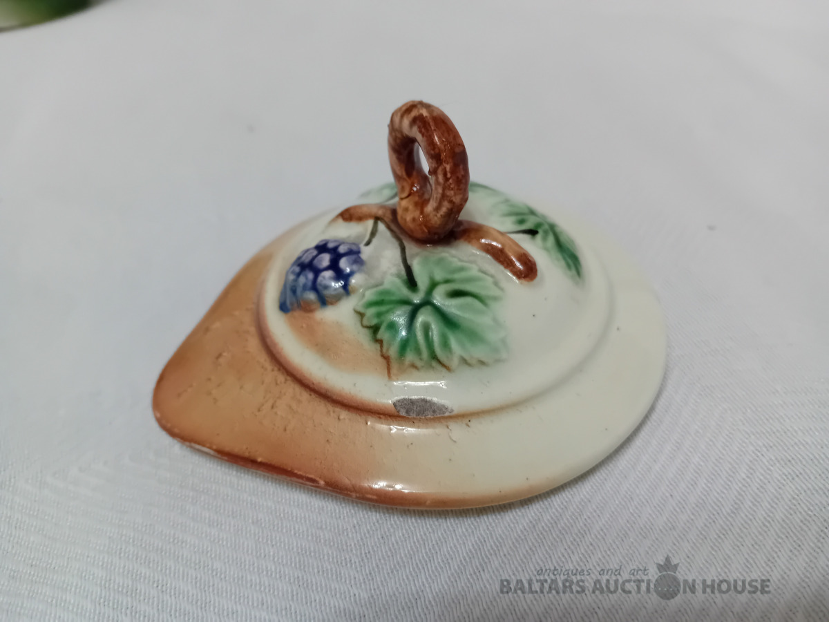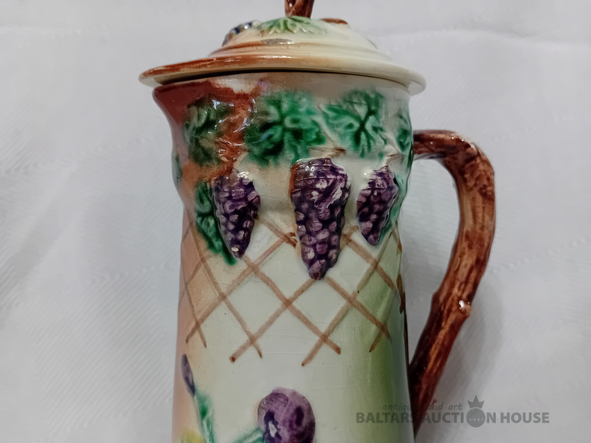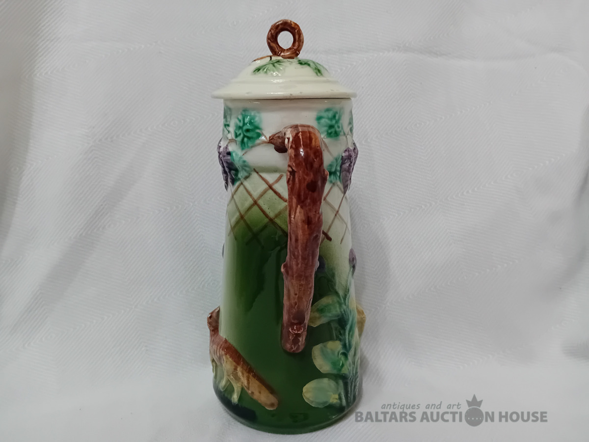 Krūze, Lapsa un vīnogas, Kuzņecovs?fajanss ,20.gs. sākums, 24.5 cm h, Vāciņam virspusē atsitums,fajansā tumši pleķi
