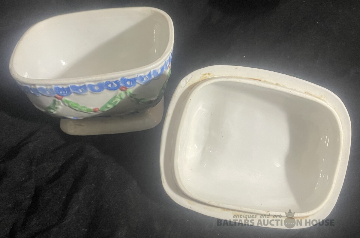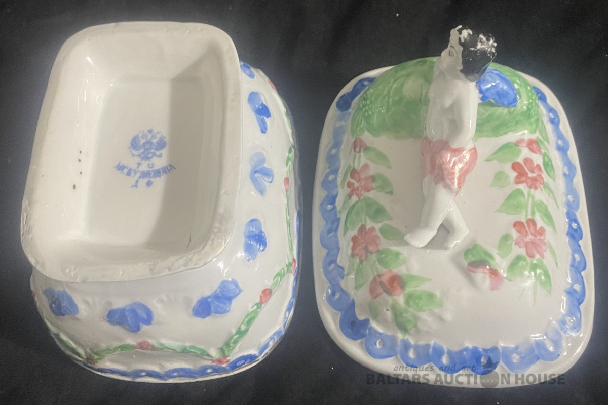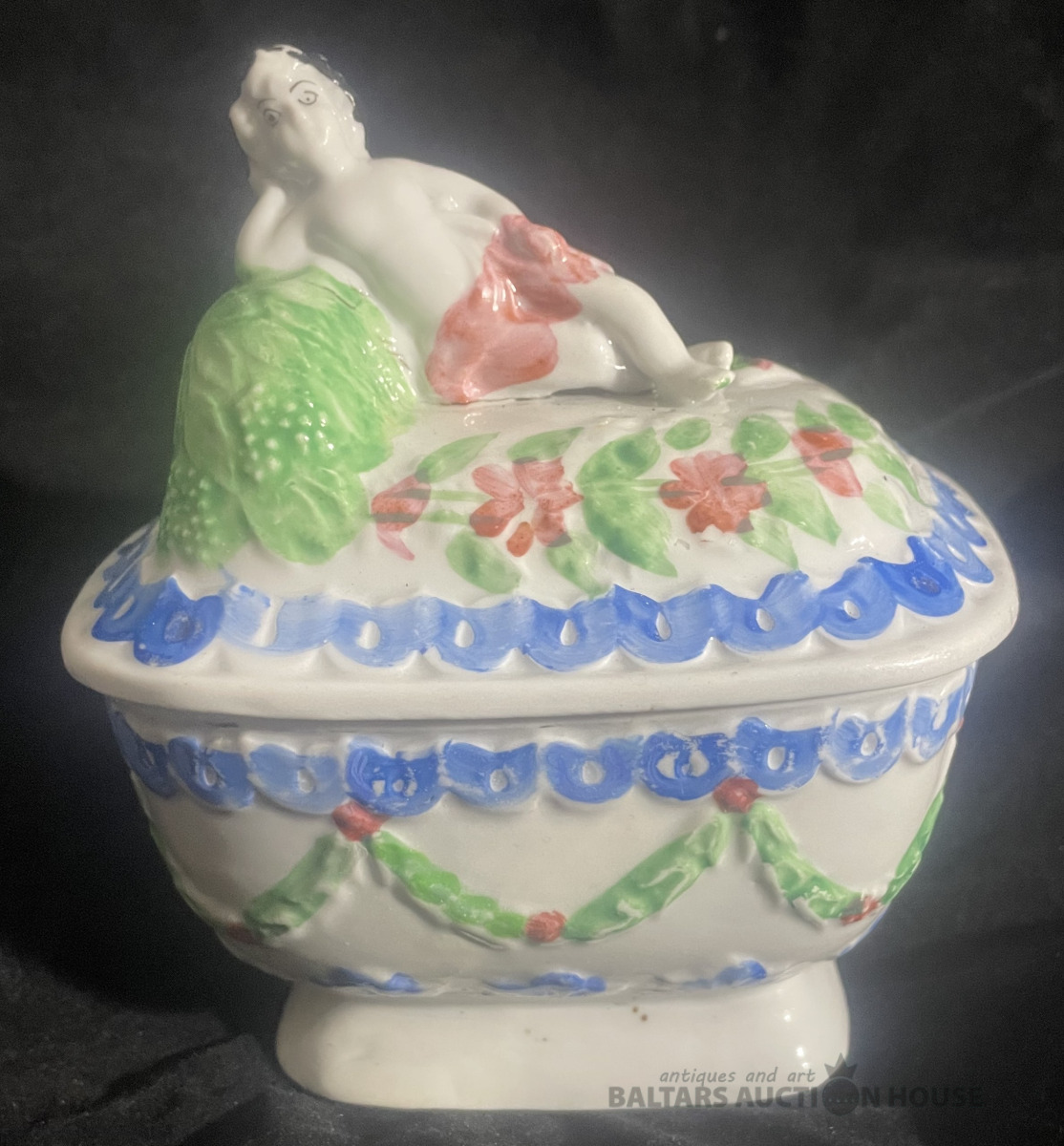 Trauciņš ar vāku "Sieviete atpūtā" rotaslietām/kosmētikai, porcelāns, roku gleznojums, 13,5x12x9 cm, Kuzņecova f-ka Duļevo, XIX g.s.beigu gadi