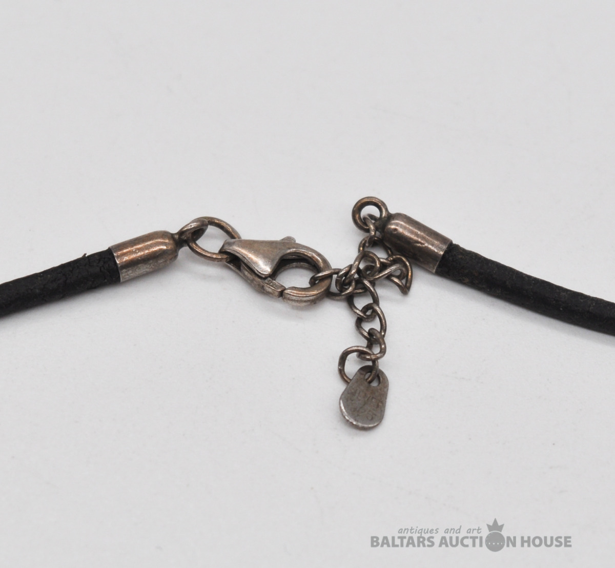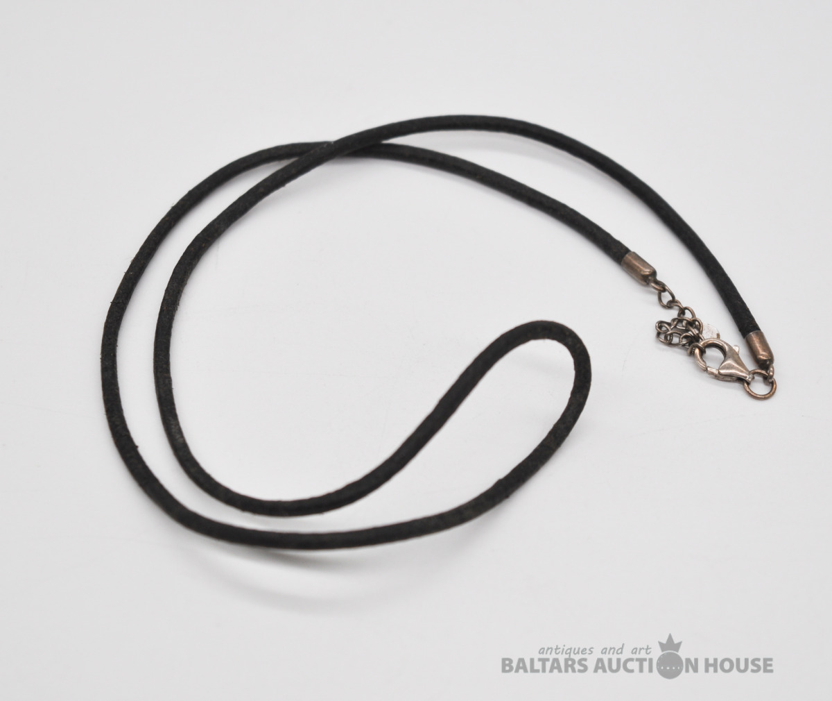 Ādas kaklarota ar sudraba aizdari. Garums 47 cm. Svars 2.7 grami.