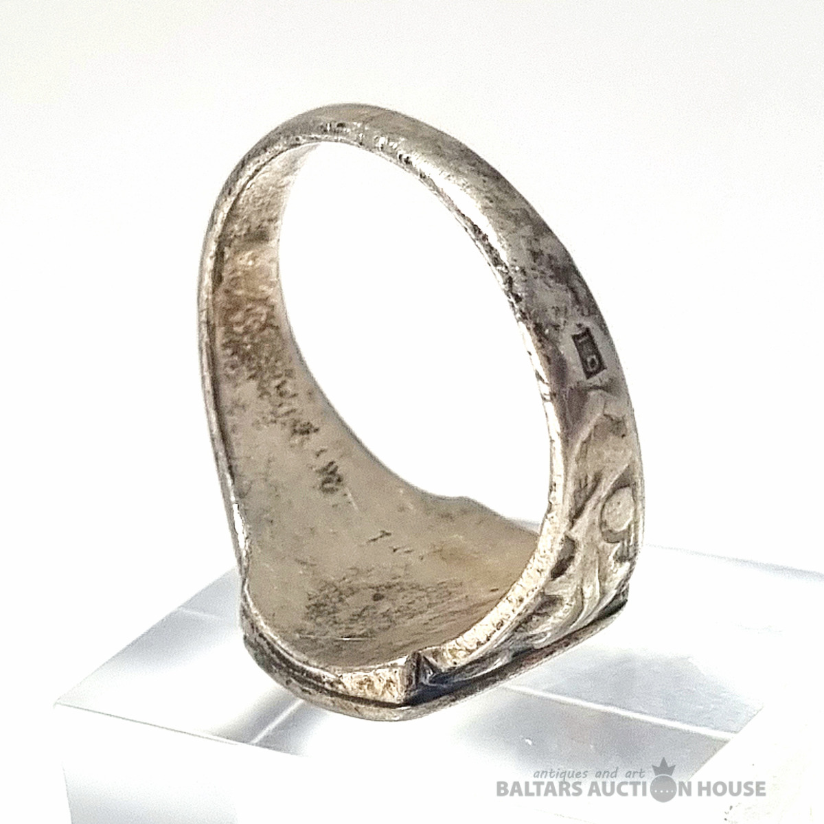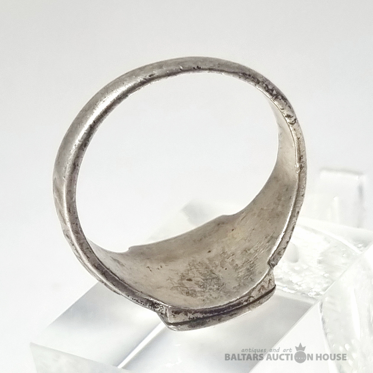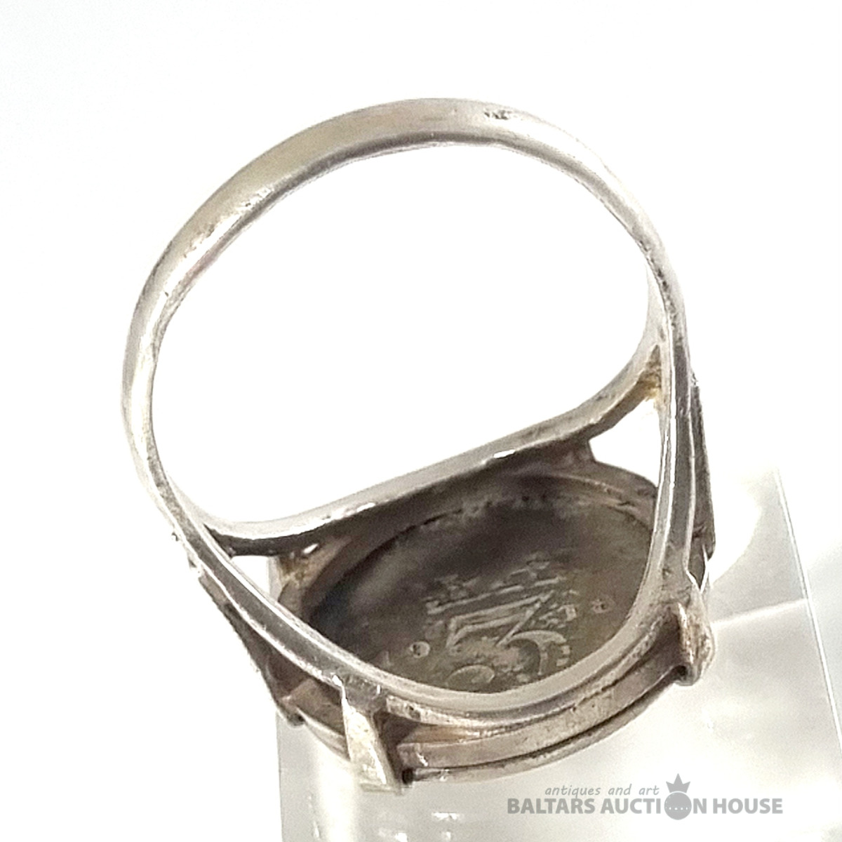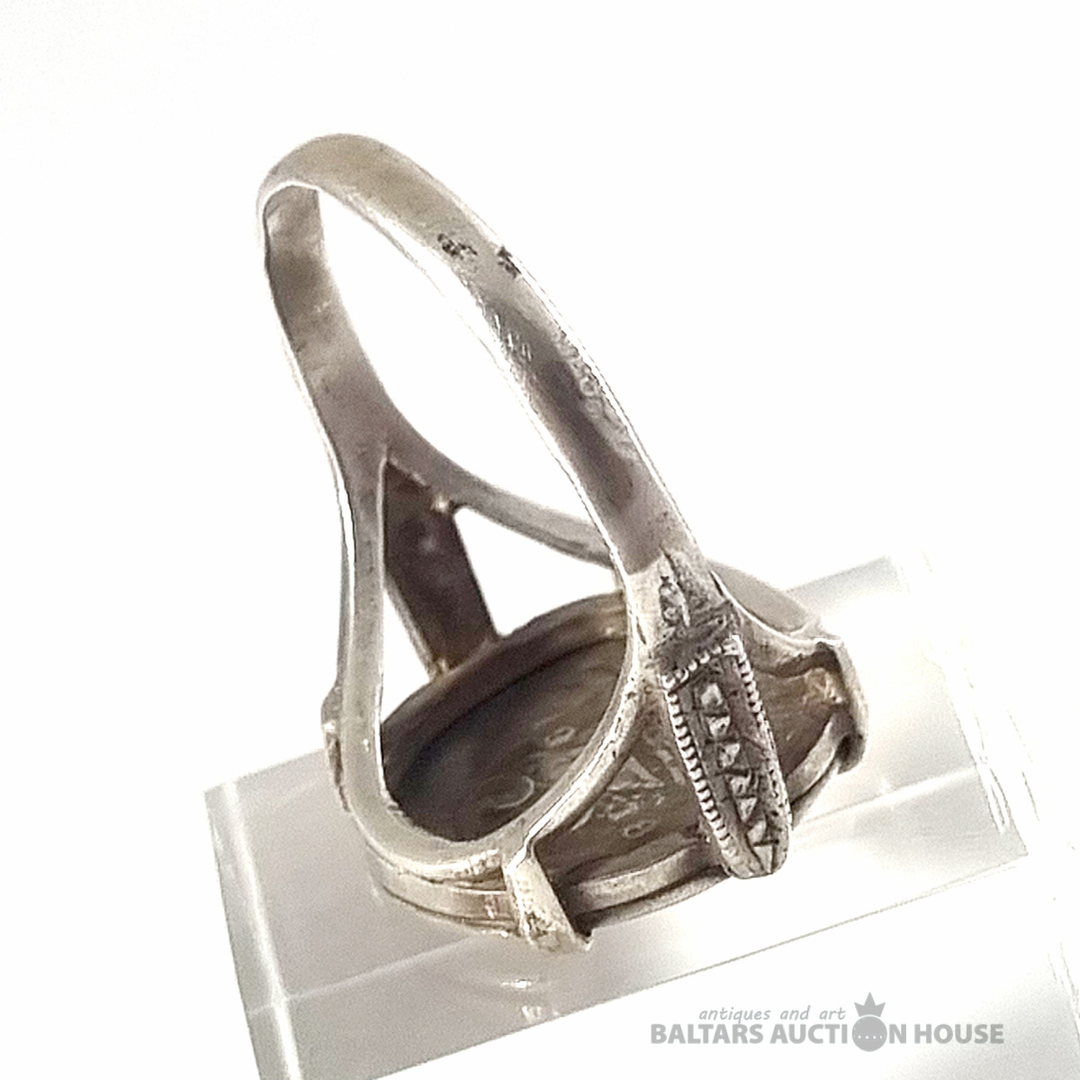 Antīks 1918. gada trīspensu gredzens ar sudraba ietvaru. Svars 4,11 grami.