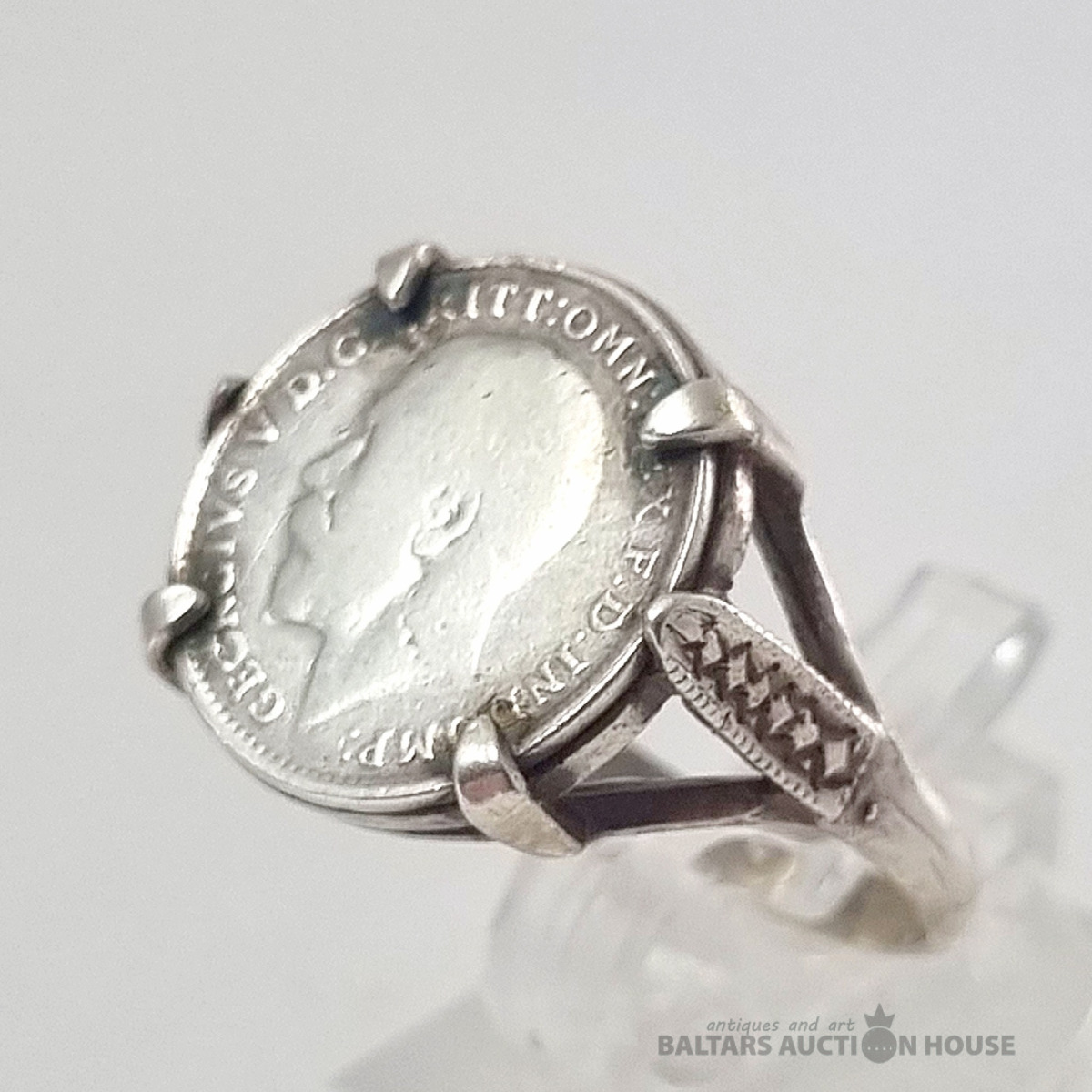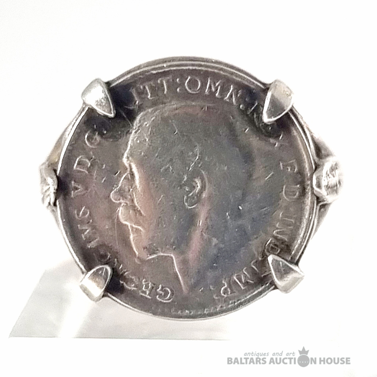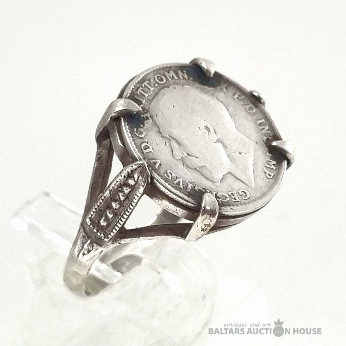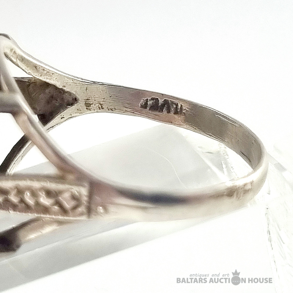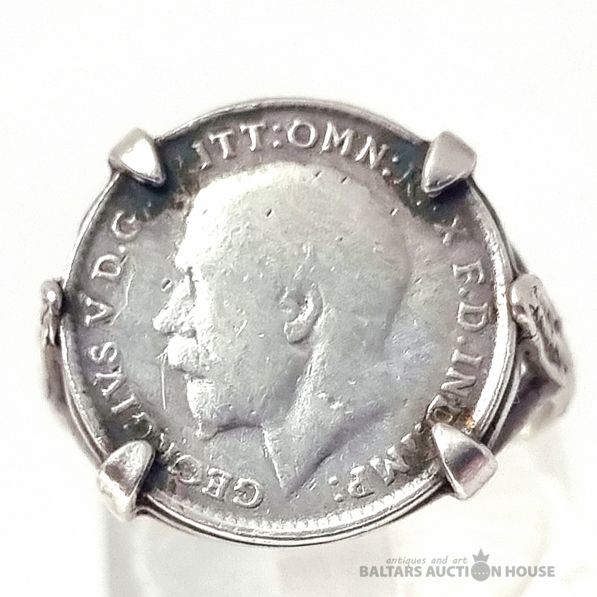 Antīks 1918. gada trīspensu gredzens ar sudraba ietvaru. Svars 4,11 grami.