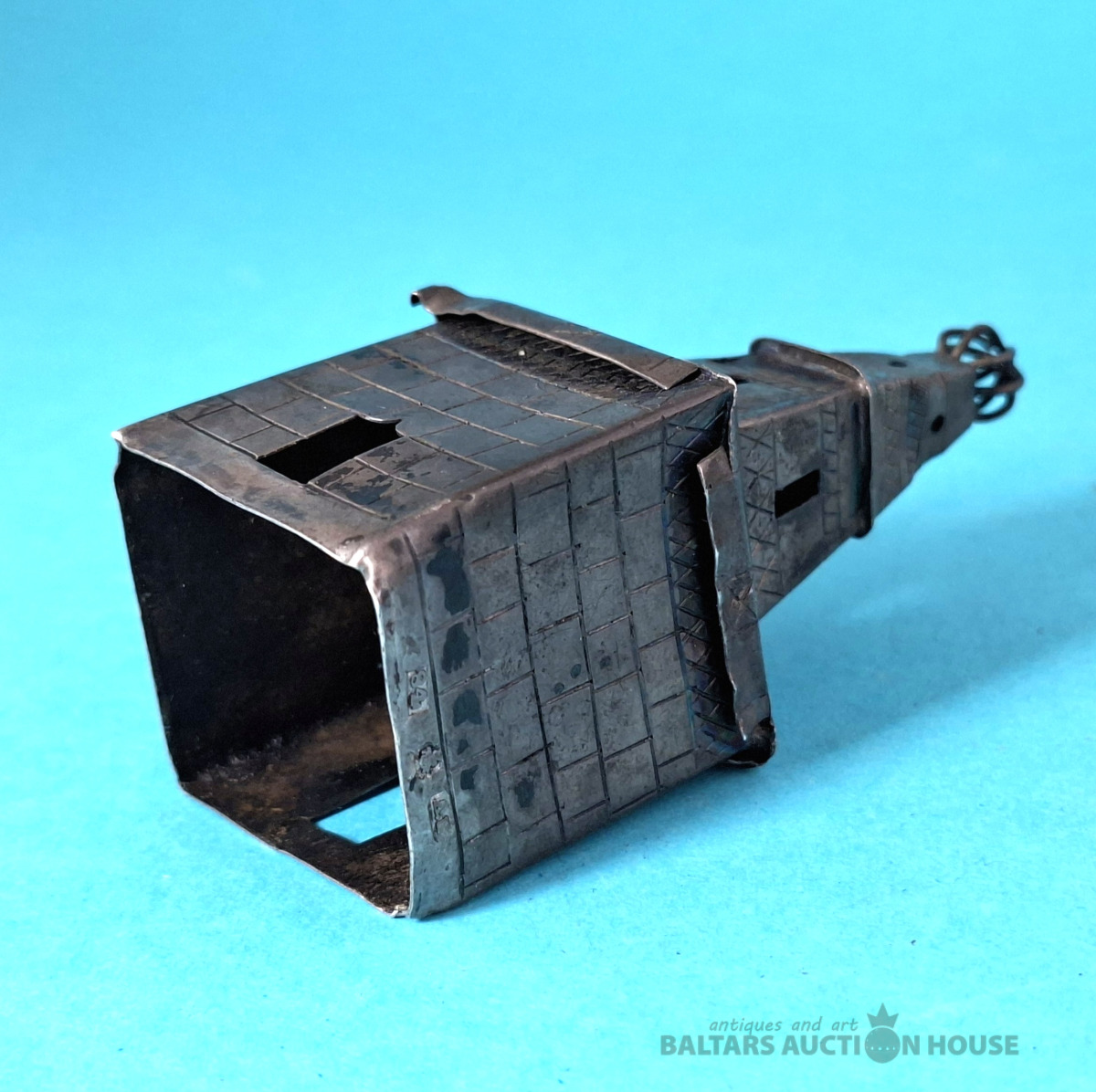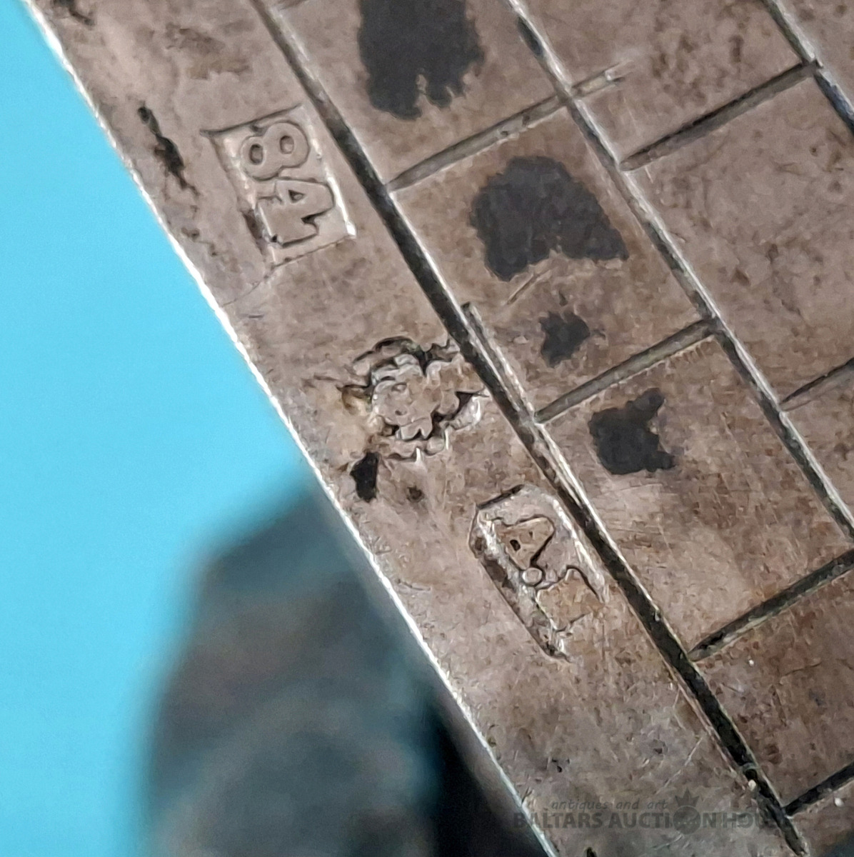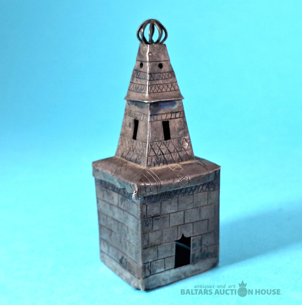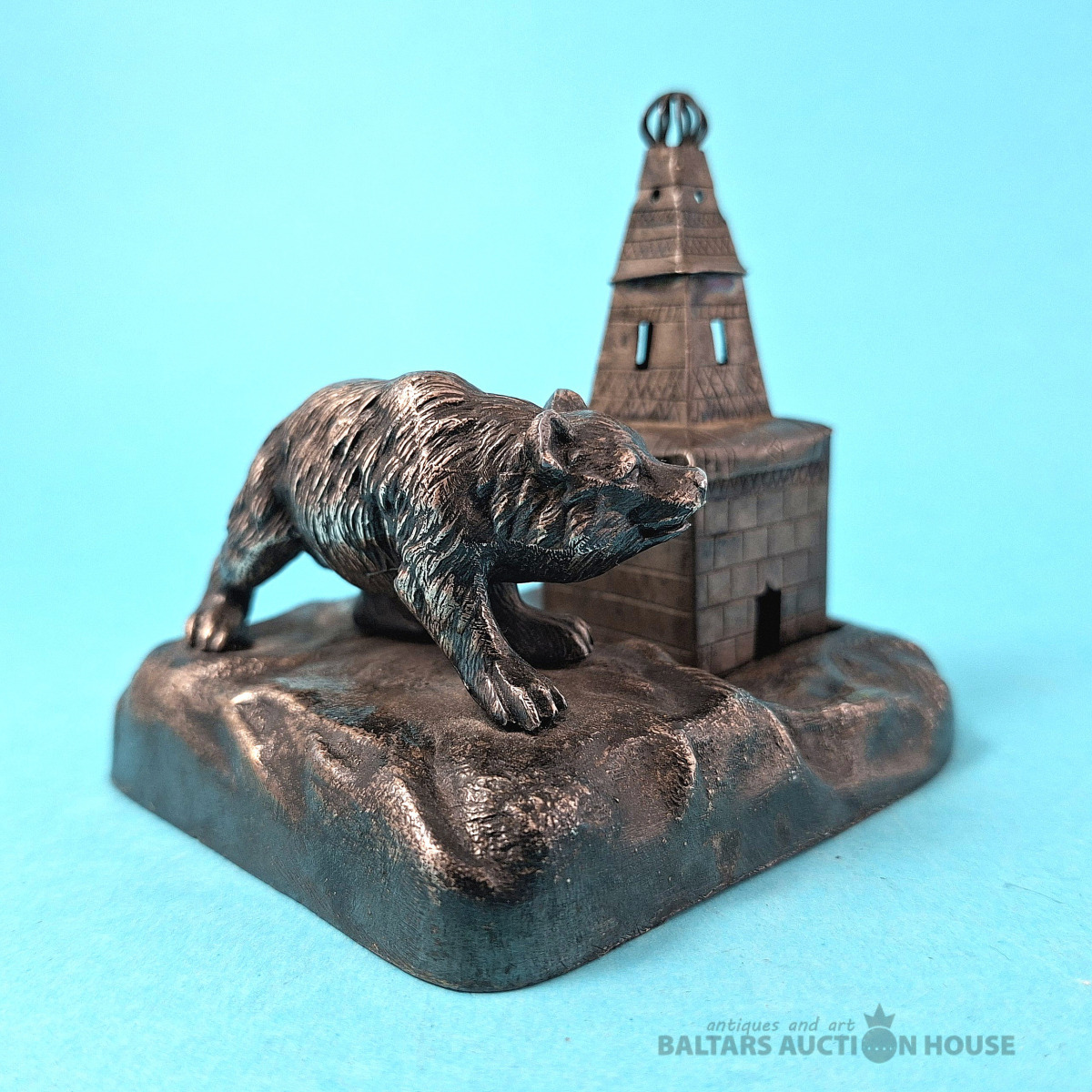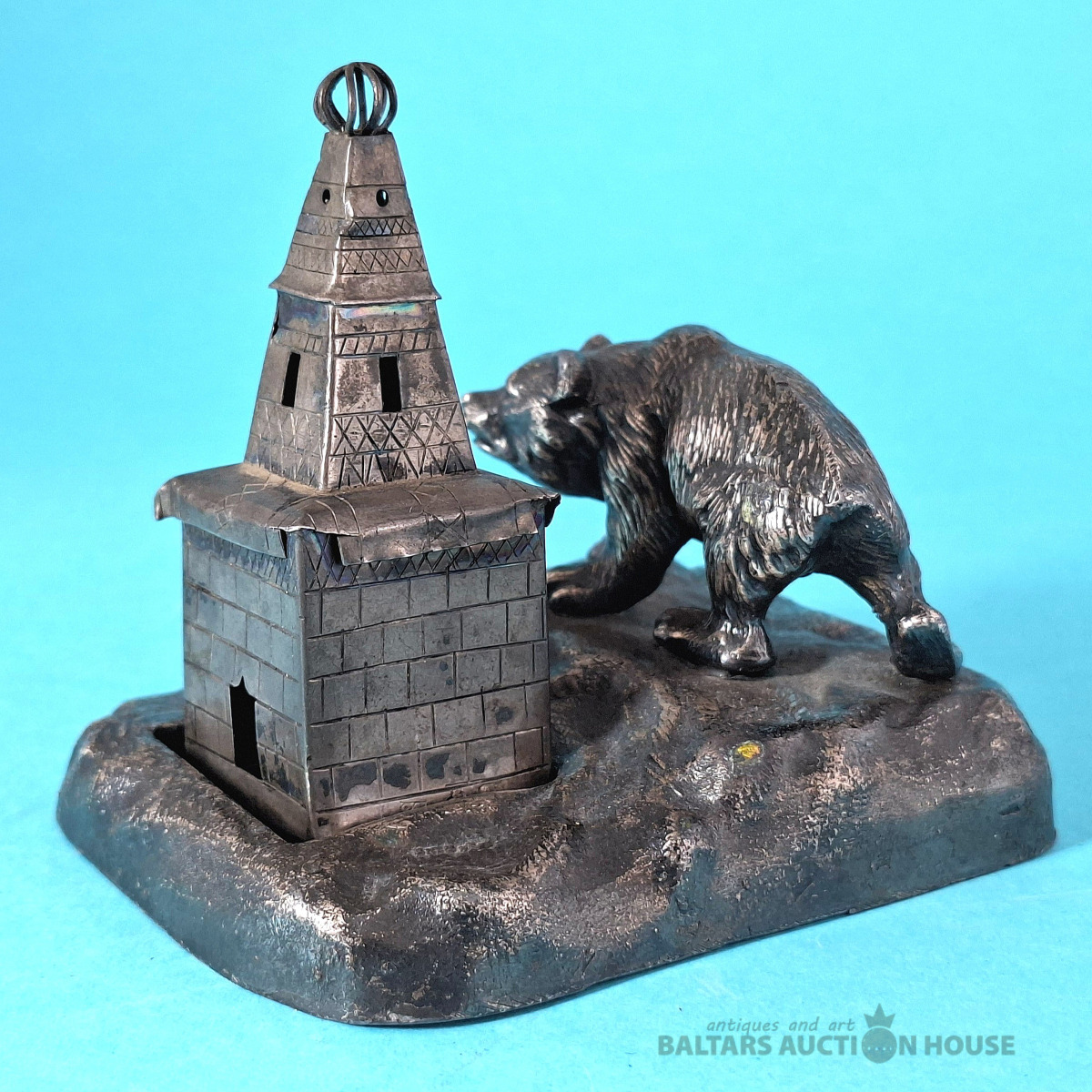 Galda virsma, kvēpināmais trauciņš. Aromātu trauciņš. Lācis un tornis. Krievijas impērija. Tornis. Sudrabs, 84. prove. Svars: 15,90 grami. Augstums: 7, Lācis uz statīva - metāls.