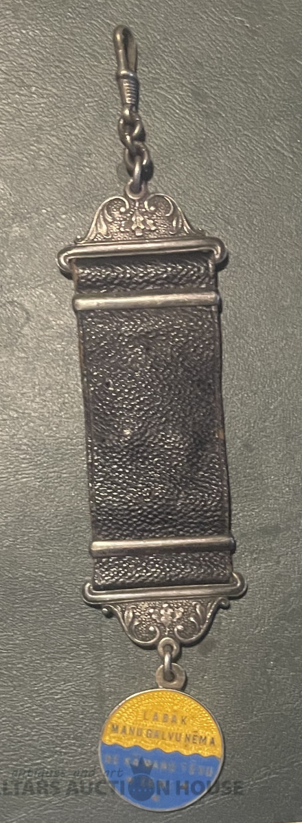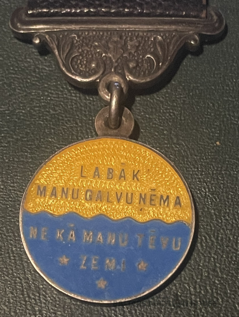 Breloks "Labāk manu galvu ņēmma, nekā manu tēvu zemi", sudrabs ?, , emalja, āda. 1924.-1934.